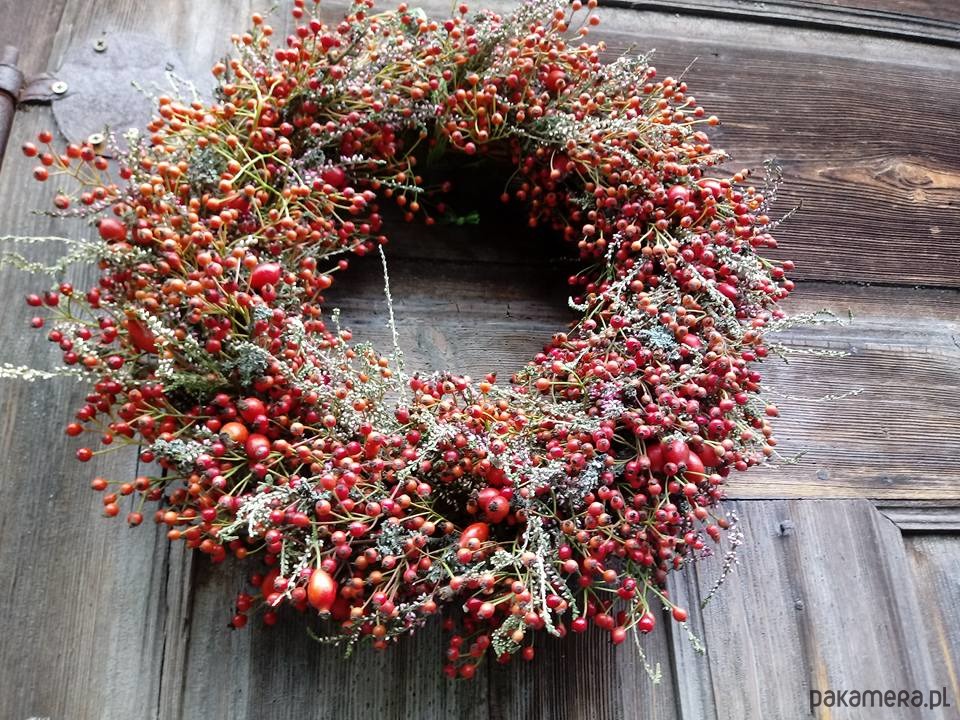 Z czasem się przebarwi i zasuszy.Średnica 40 cm.Do wianka wykorzystałam dzika róża .
