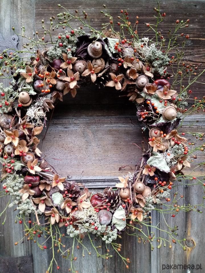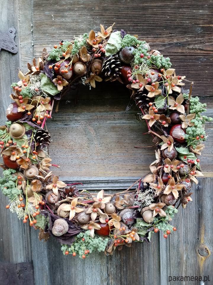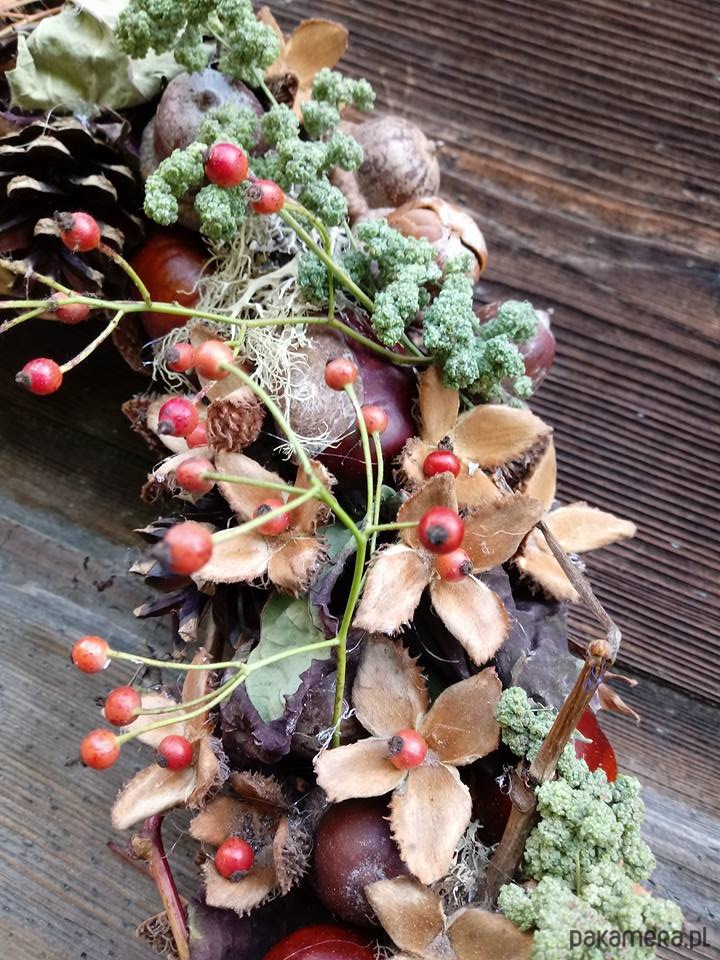 Z czasem się przebarwi i zasuszy.Średnica około 50 cm.Do wianka wykorzystałam różę szyszki ,kasztany , żołędzie , .