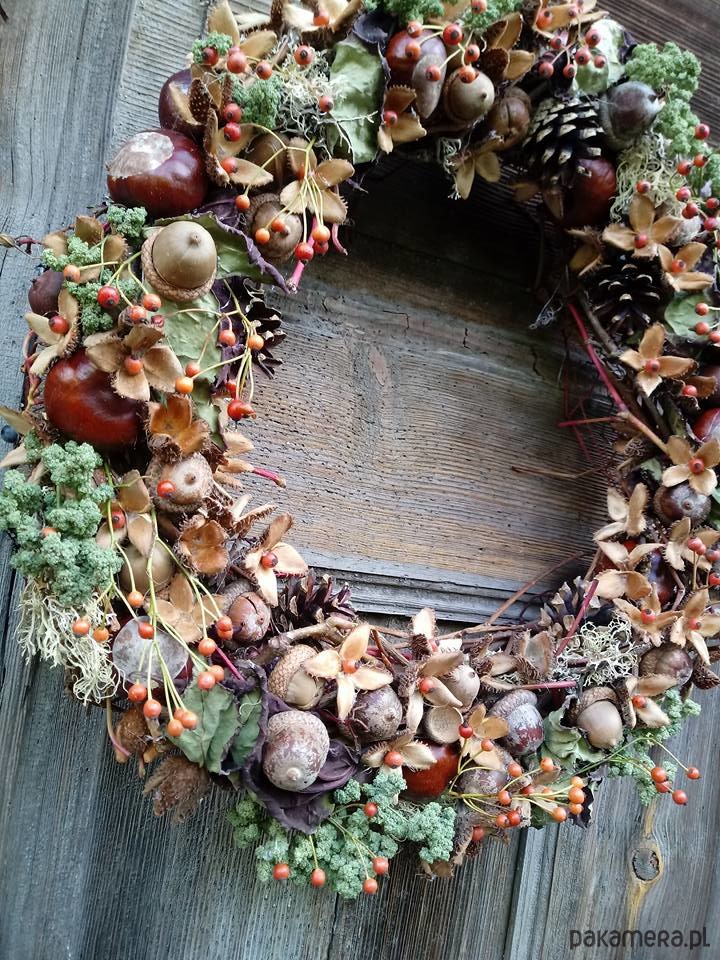 Z czasem się przebarwi i zasuszy.Średnica około 50 cm.Do wianka wykorzystałam różę szyszki ,kasztany , żołędzie , .
