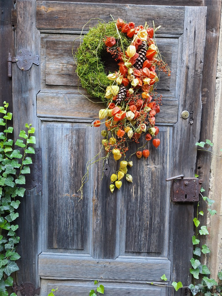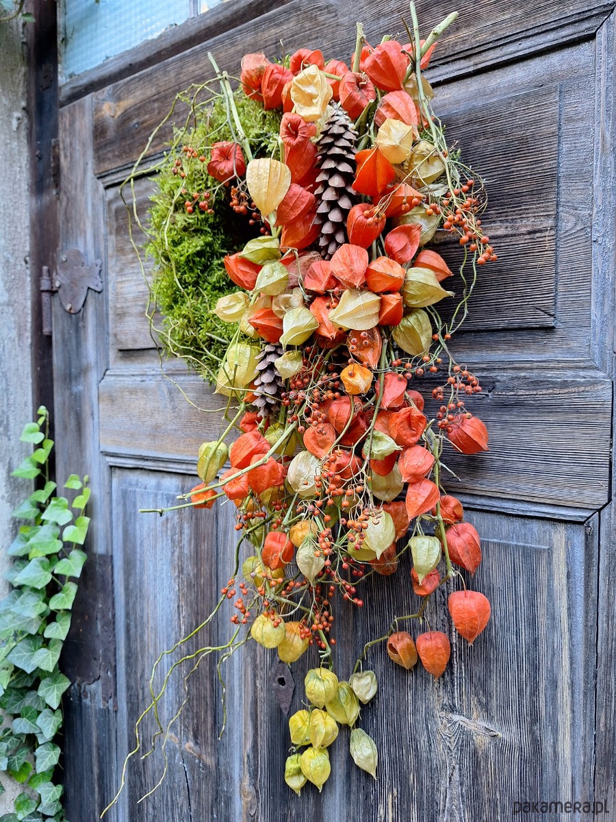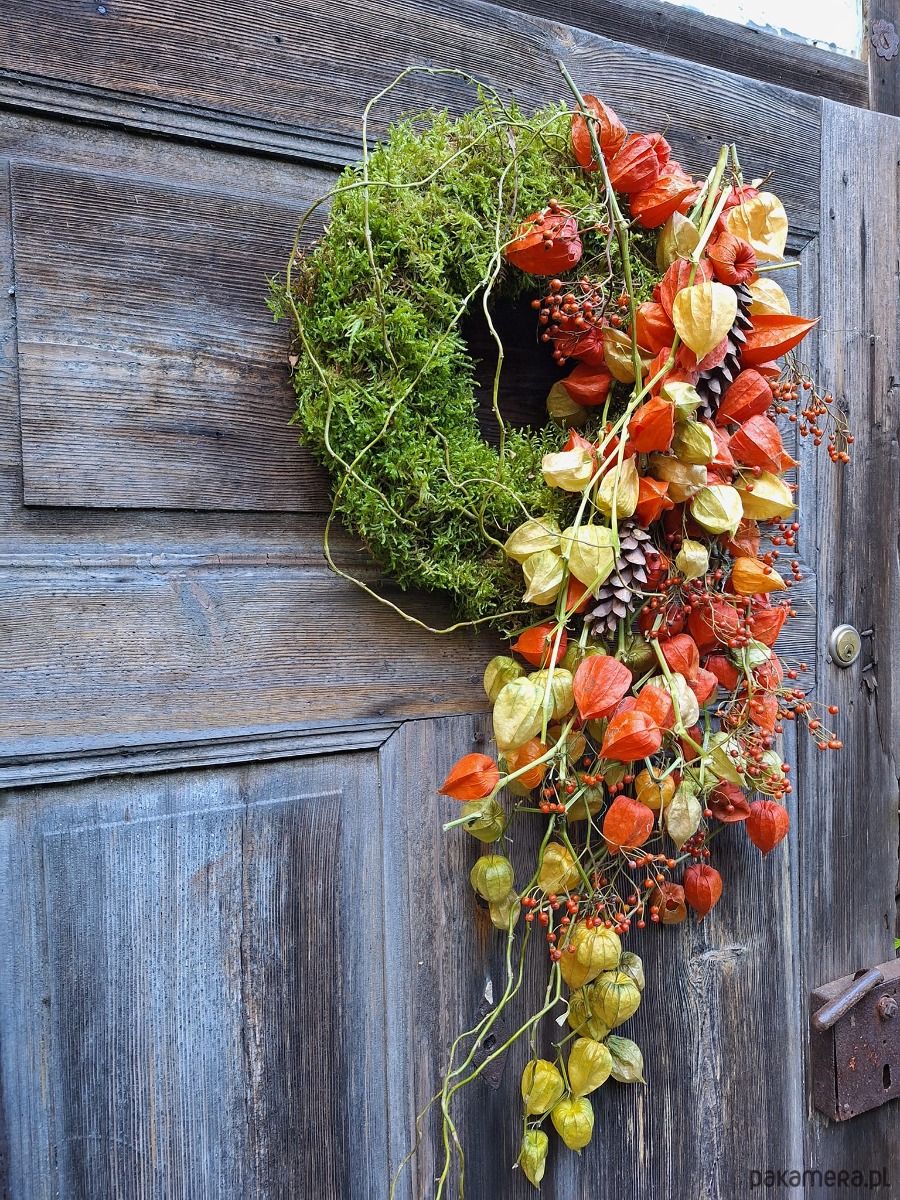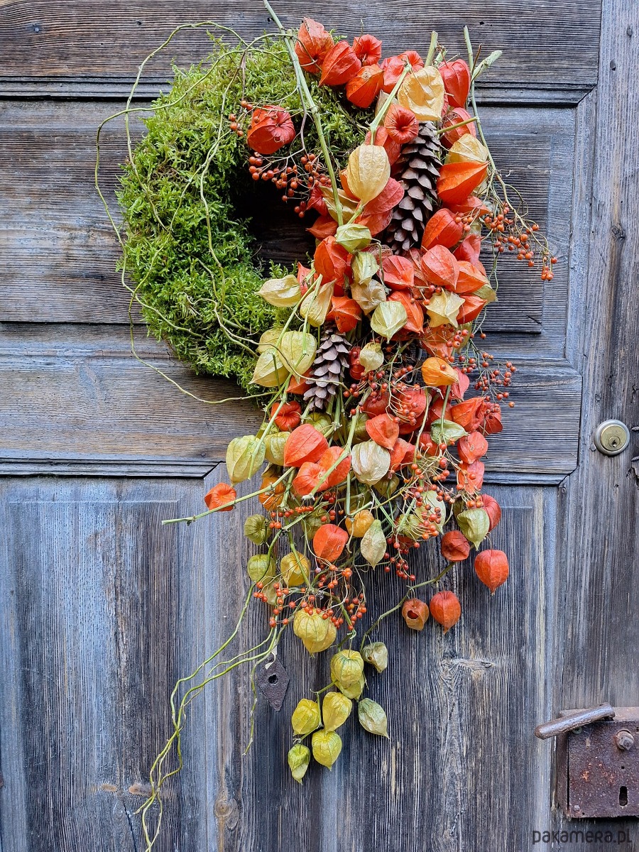 Z czasem się przebarwi i zasuszy.Średnica około 50 cm.Do wianka wykorzystałam różę i mech,miechunkę.