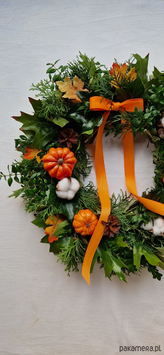 Wianek naturalny, wykonany z tui, bluszczu i innych zielonych gałązek i liści z dodatkiem naturalnej bawełny, szyszek, żołędzi i sztucznych dyni.