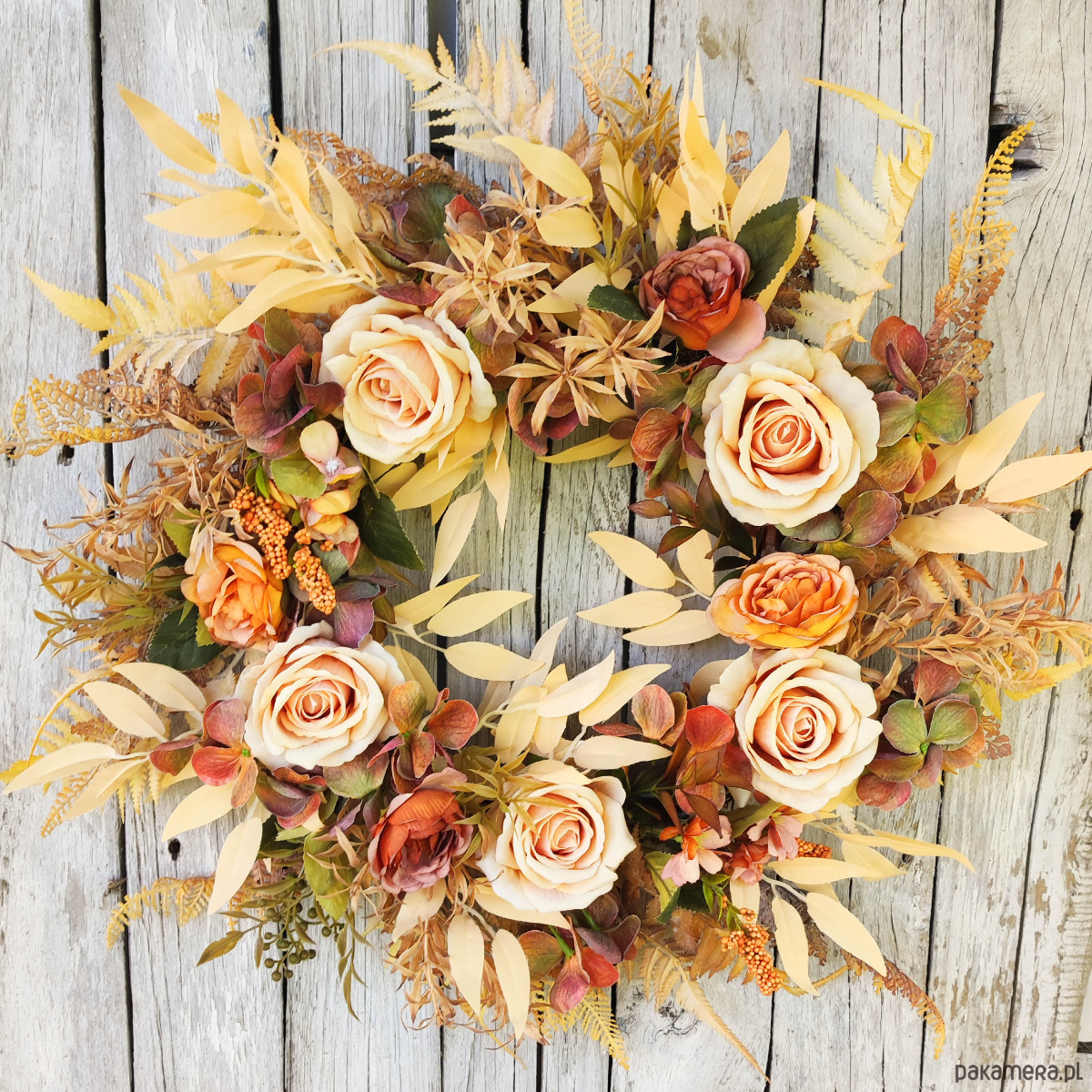Wianek jesienny wykonany ze sztucznych ozdób. Wianek ma średnicę ok. 50cm