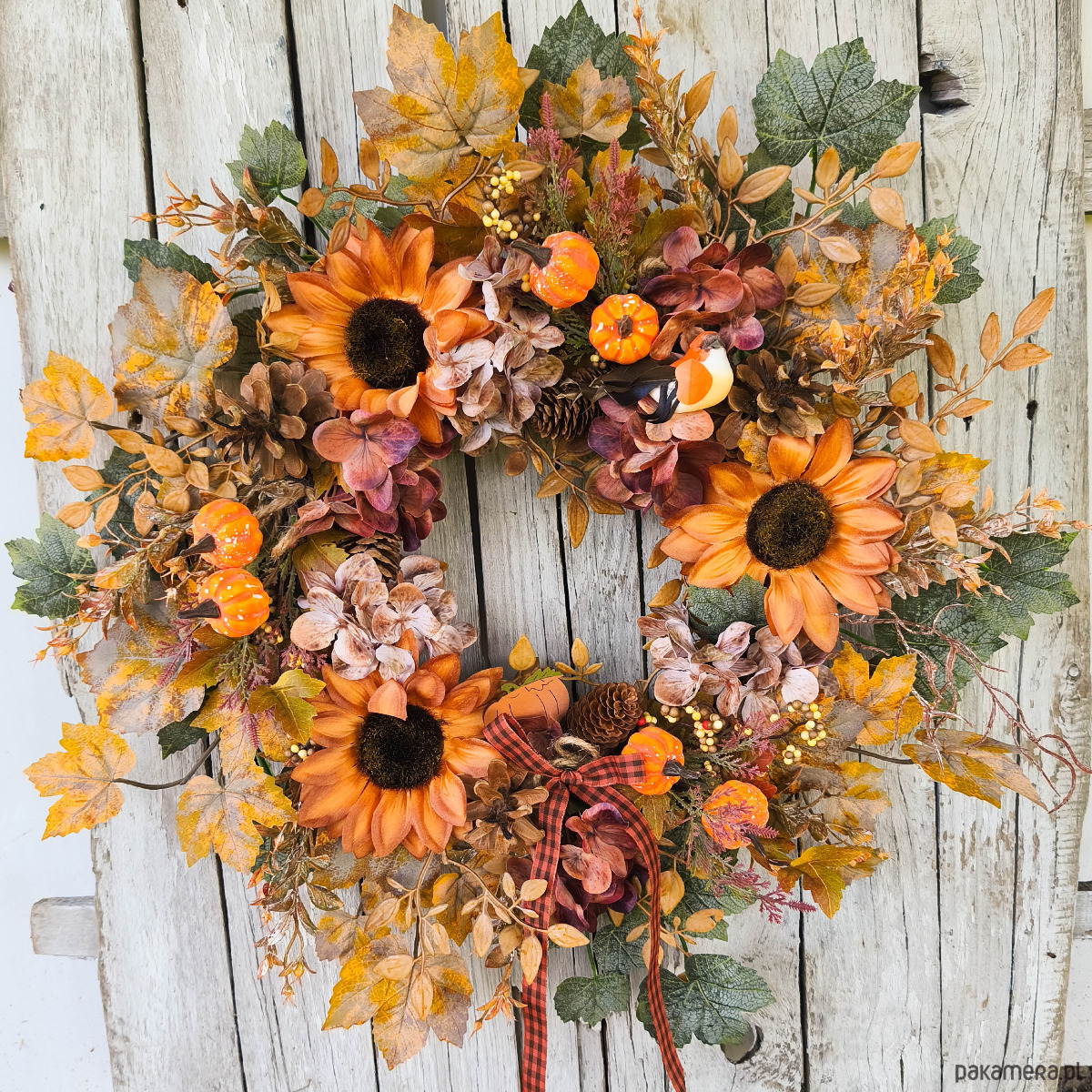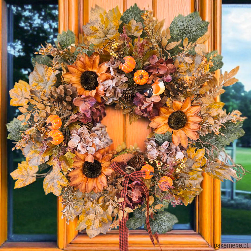 Wianek jesienny na drzwi wykonany ze sztucznych liści i kwiatów. Średnica ok. 55cm