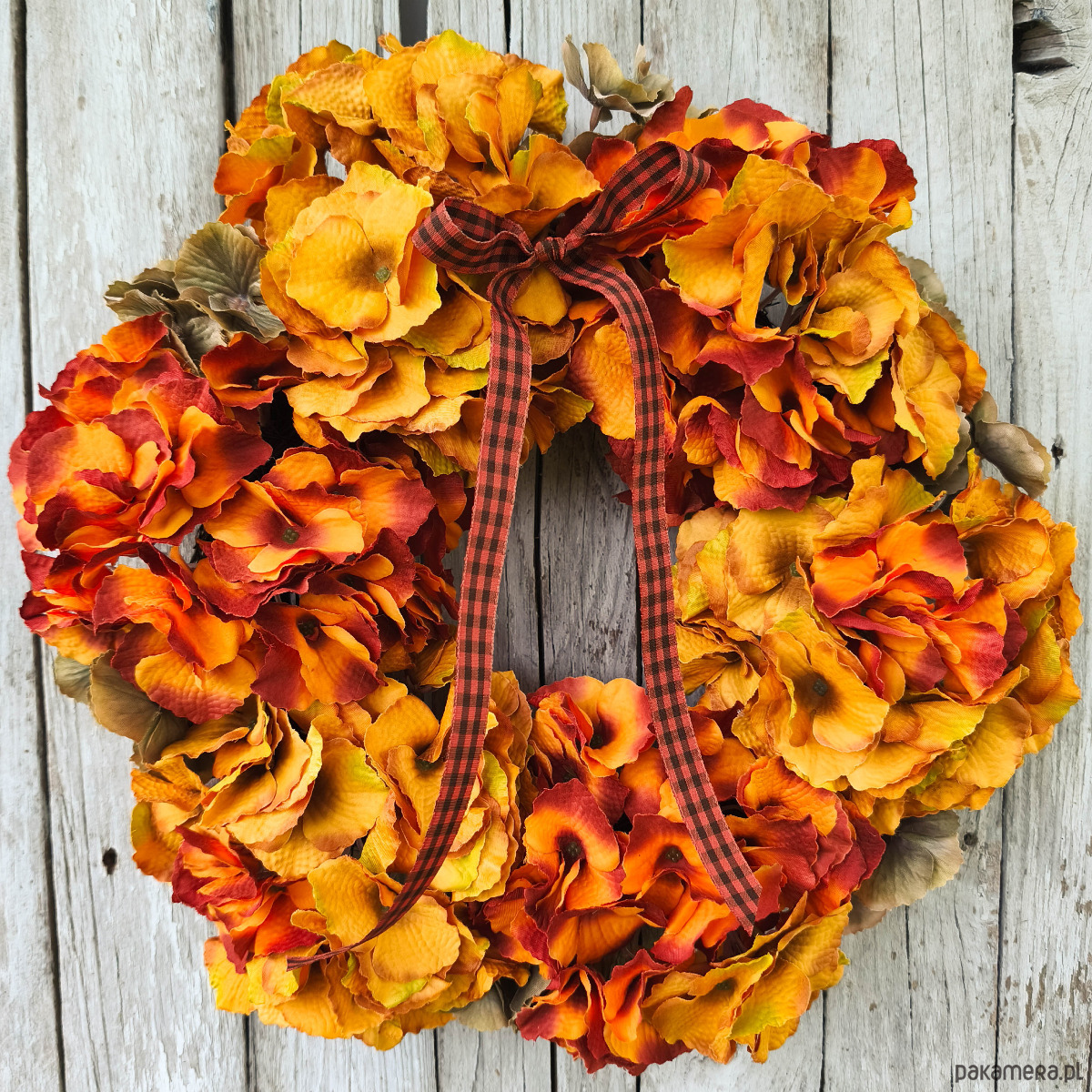 Wianek jesienny o średnicy ok 42 cm. Wianek udekorowany wysokiej jakości sztucznymi główkami hortensji.
