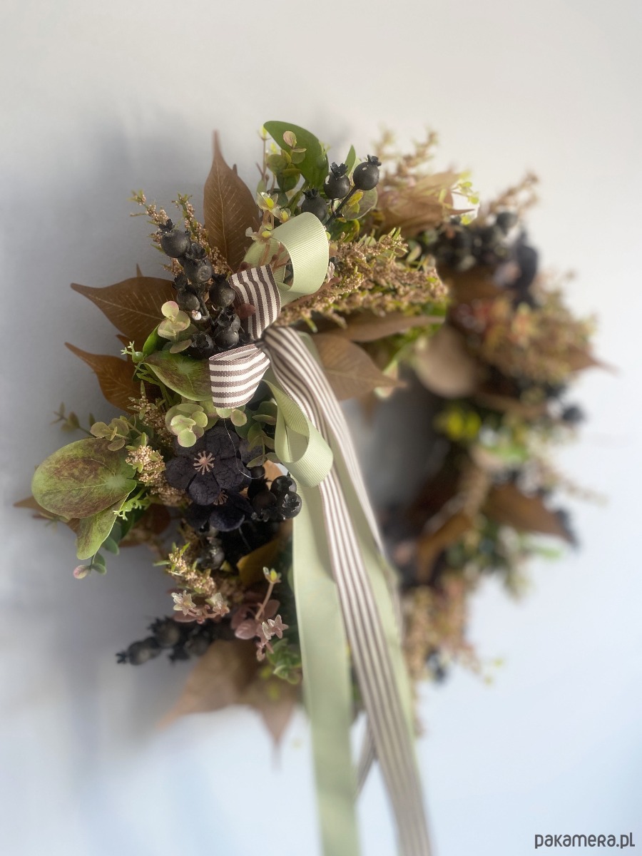 Wianek jesienny w kolorach ziemi ze wstążkami