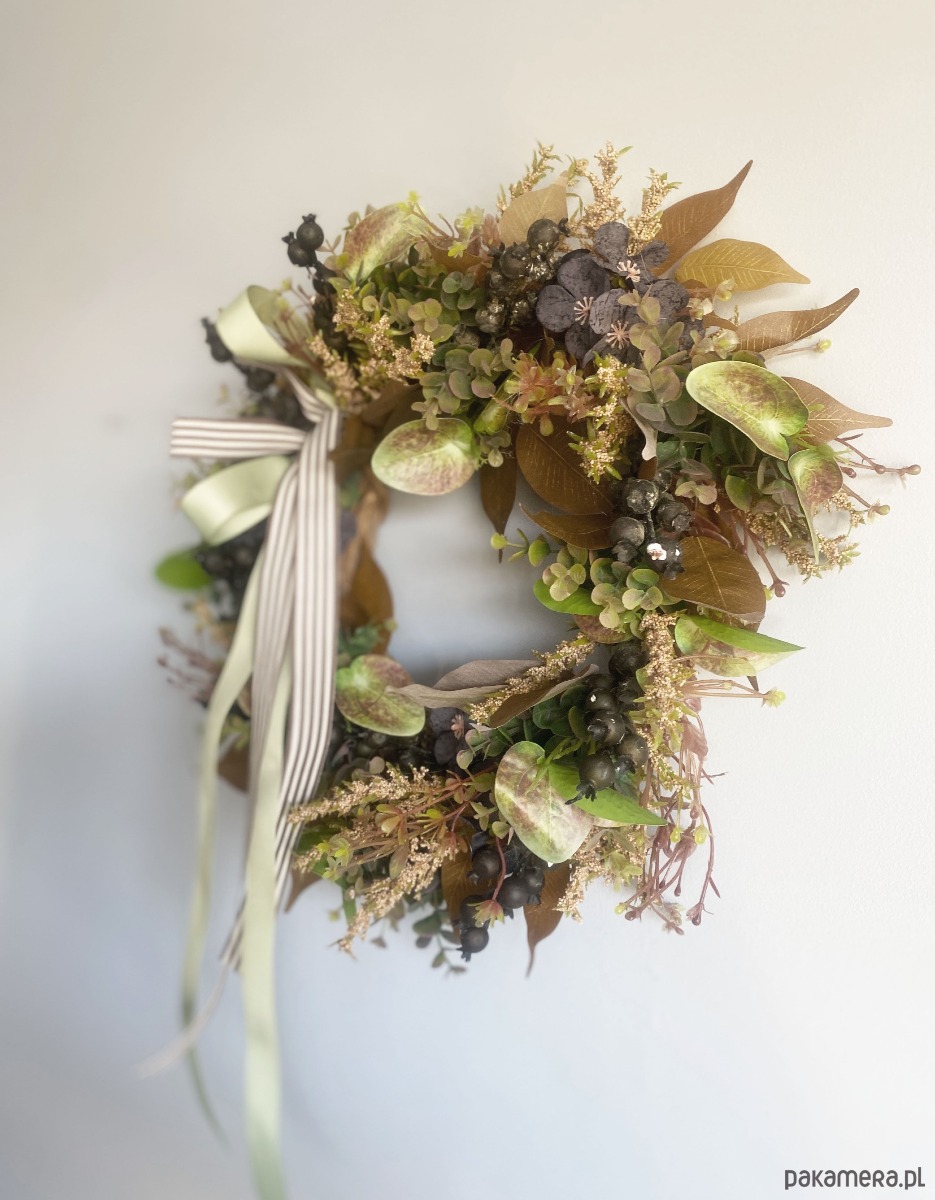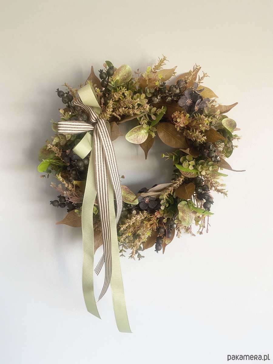 Piękny, jesienny wieniec na drzwi wykonany z sztucznych kwiatów w naturalnych odcieniach. Ozdobiony jest liśćmi, jagodami i wstążkami w kolorach ziemi . Piękny i gotowy do powieszenia na drzwiach, aby dodać jesiennego nastroju do Twojego domu. Średnica ok. 30 cm.
