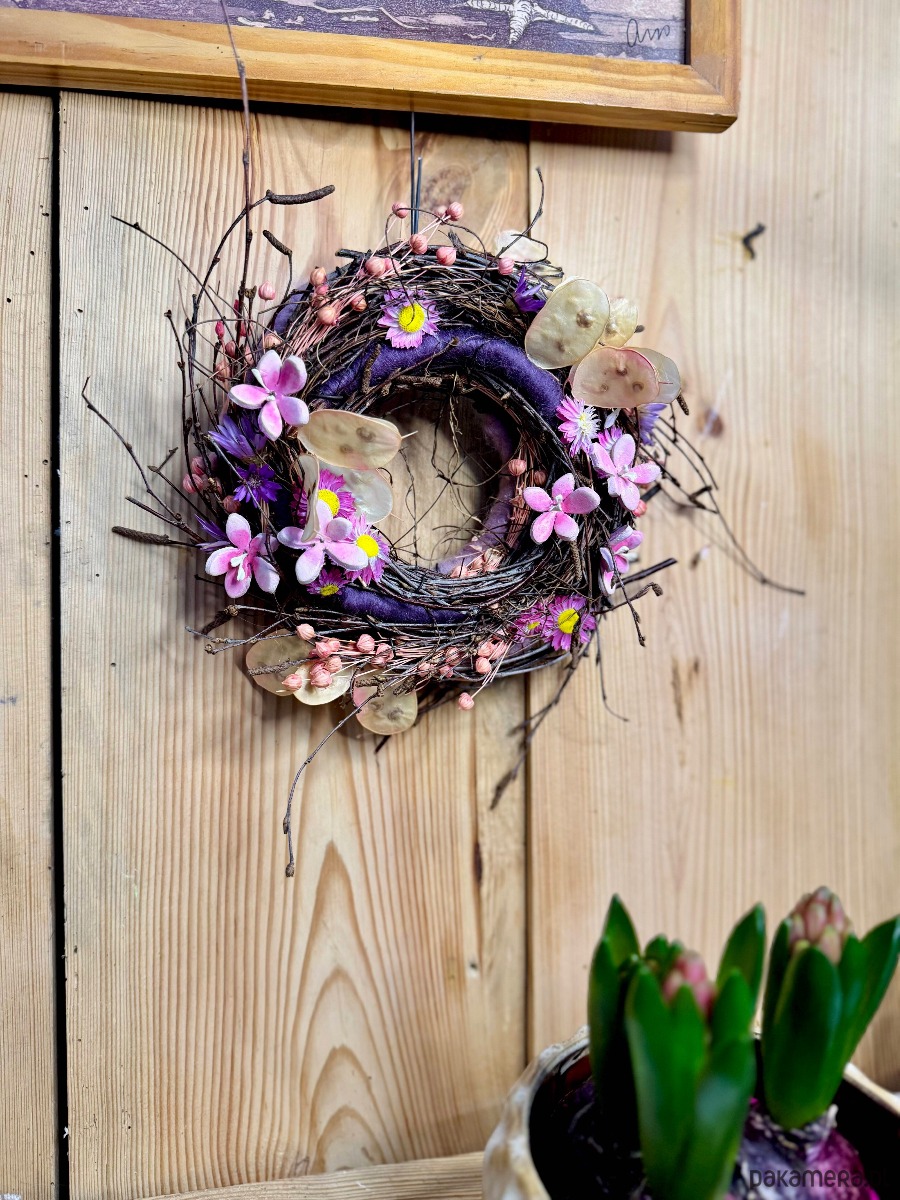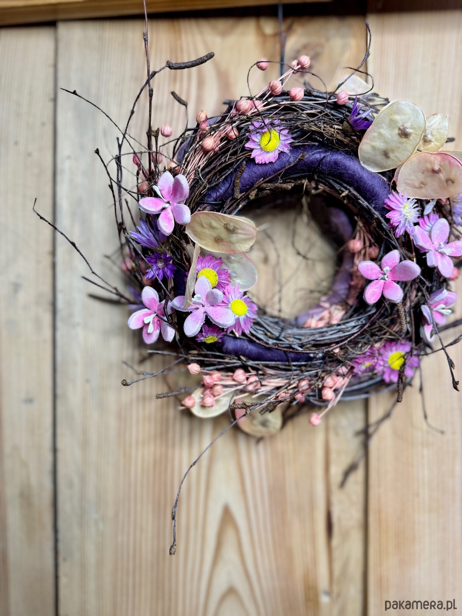 Podstawa wianka uwita z gałęzi Brzozy i Lnu. Do tego Lunaria, Suchlin i kwiaty które ulepiłam z glinki.