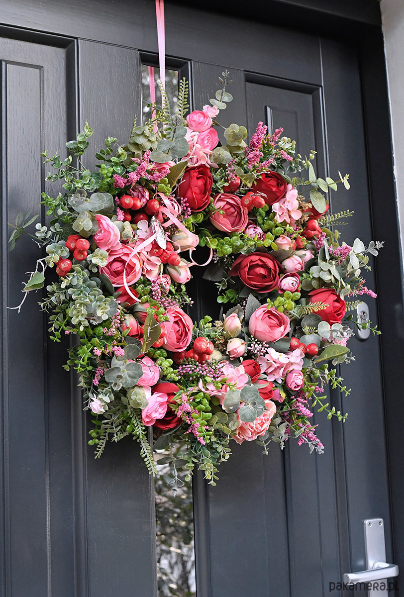 Te Klasyczne ciemno czerwone i nieco delikatniejsze i mniejsze różowe róże w plątaninie świeżo soczystej zieleni, Taki wianek będzie wyglądał doskonale na każdych klasycznych , eleganckich drzwiach!
