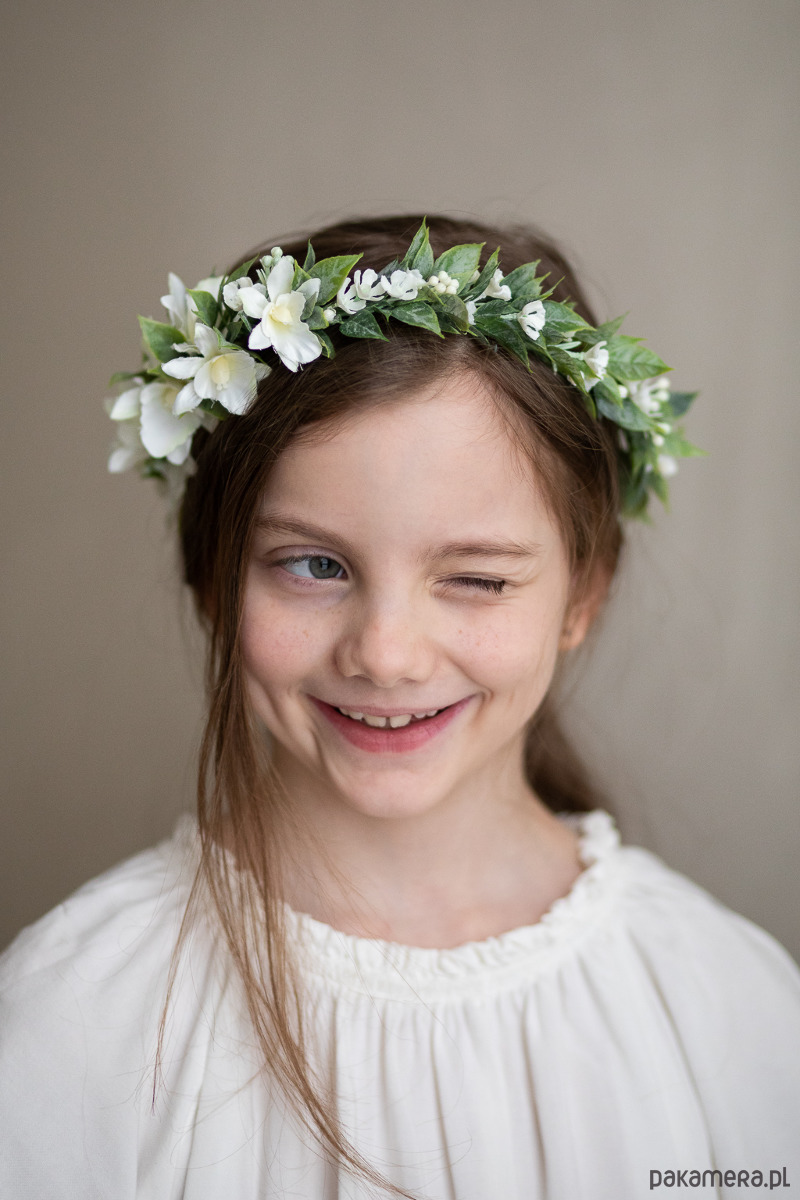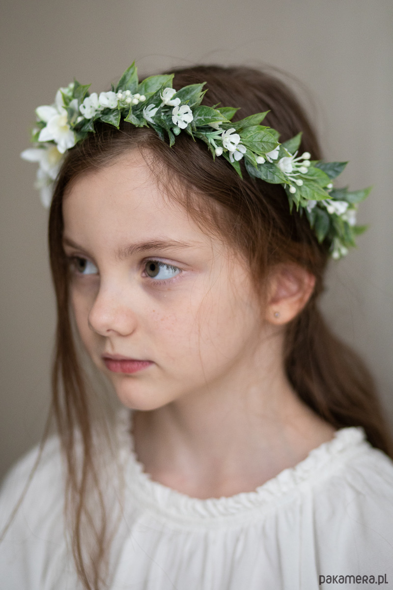 Wianek idealnie wpisuje się w stylistykę boho. Zielone listki w połączeniu subtelnymi kwiatkami dają mu delikatny i romantyczny charakter. Idealny zarówno dla dziewczynki komunijnej jak i panny młodej.
