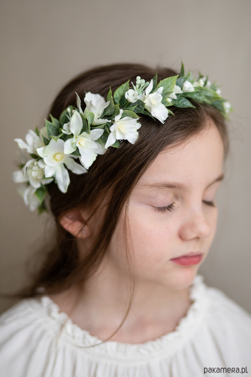 Wianek komunijny na głowę ze sztucznych kwiatów wysokiej jakości.