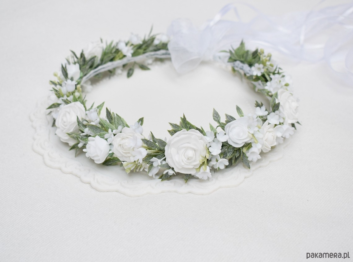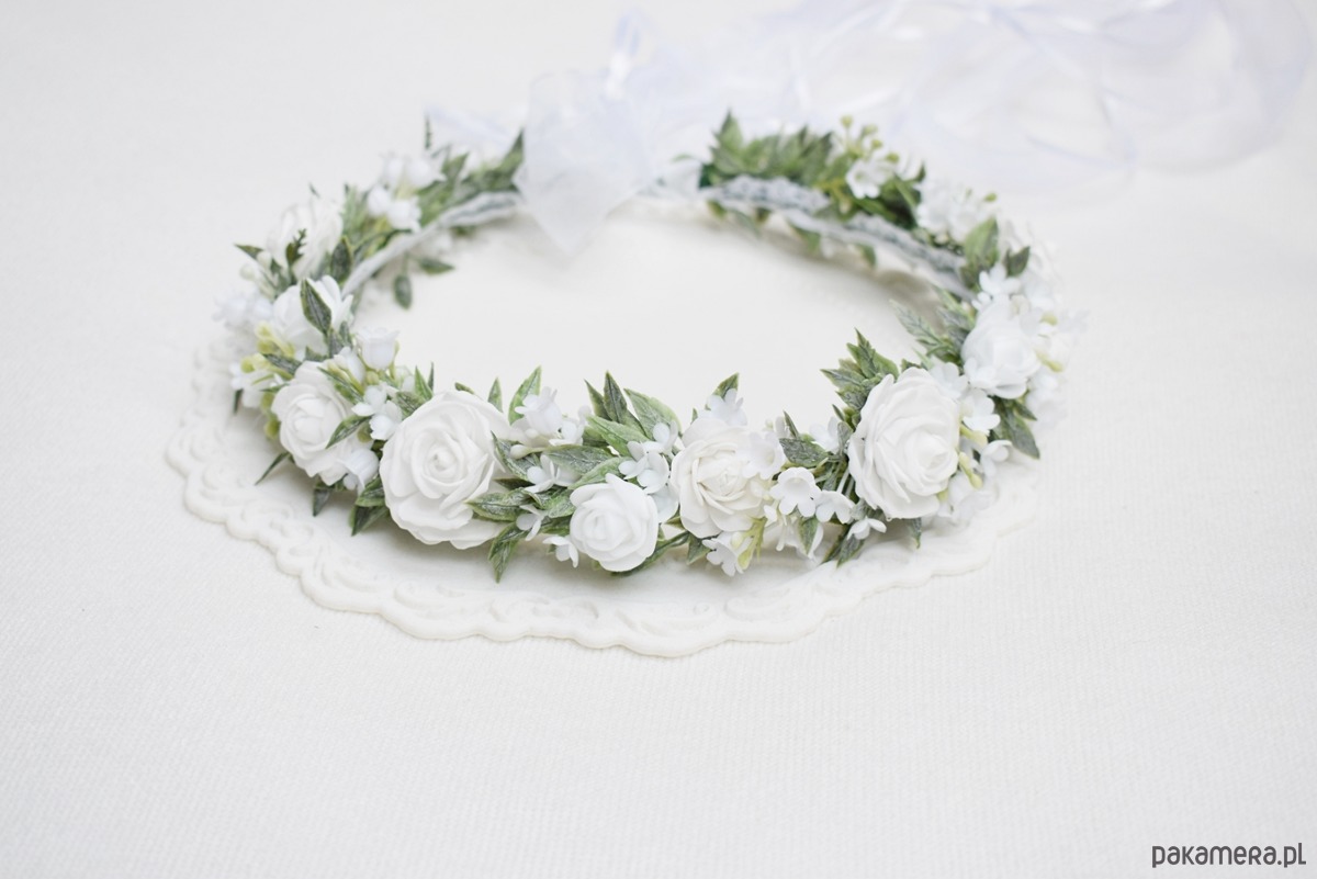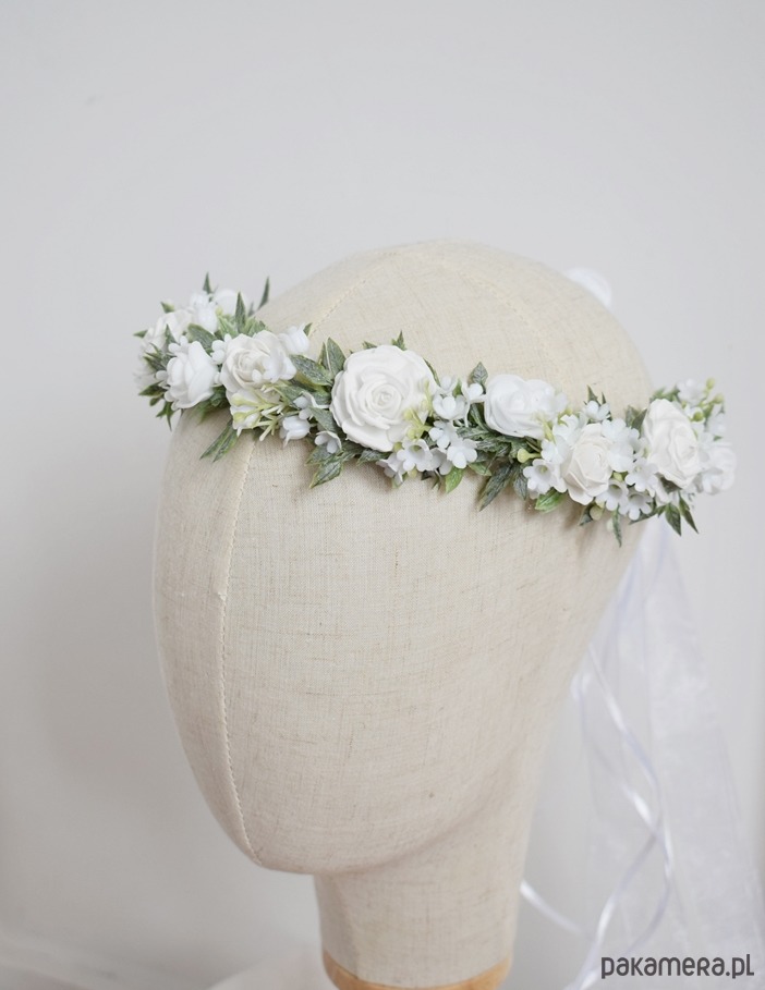 Piękny, delikatny wianek komunijny w kolorystyce biel, Ivory, kremowa biel oraz gałązki w zieleni.