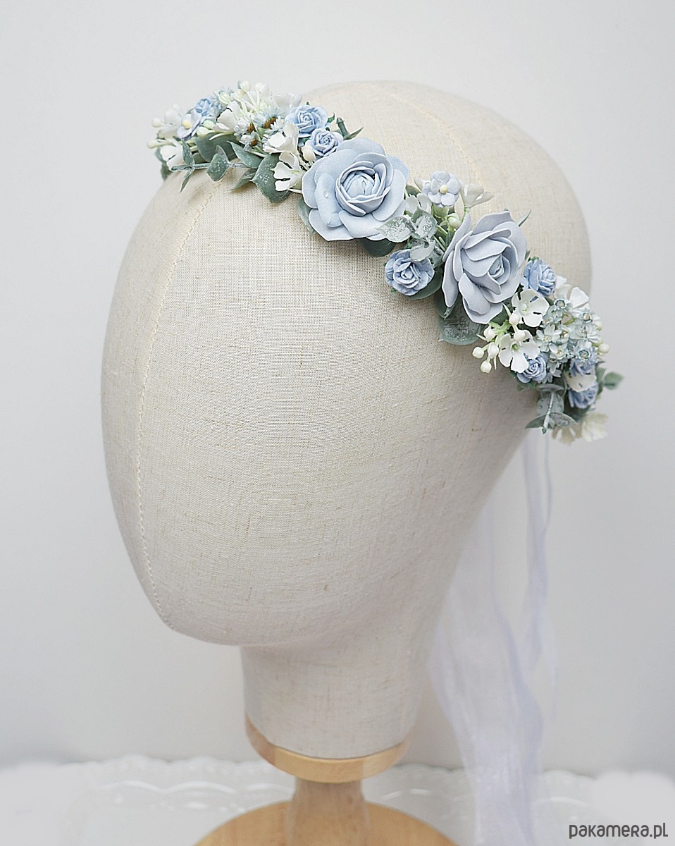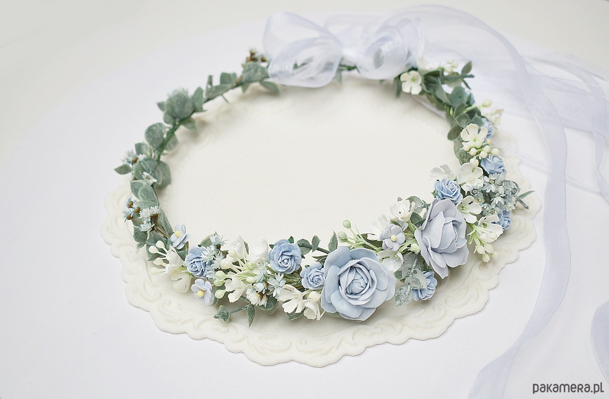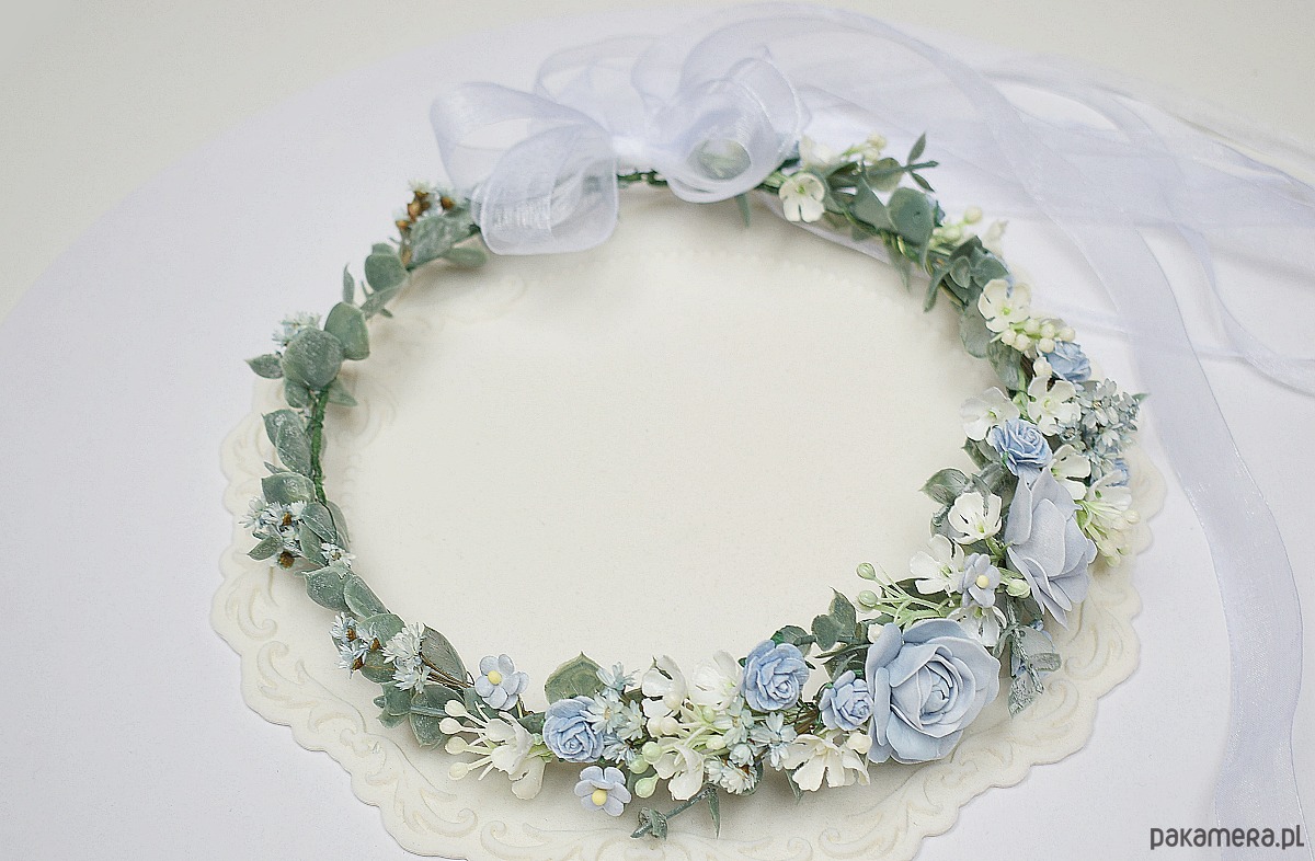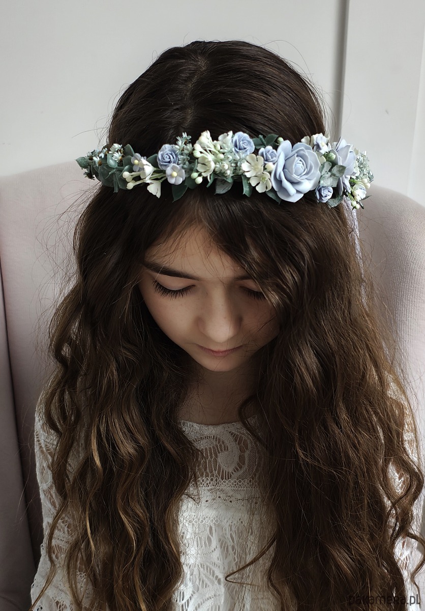 Piękny, asymetryczny delikatny wianek komunijny w kolorystyce błękit zielone listki eukaliptusa.