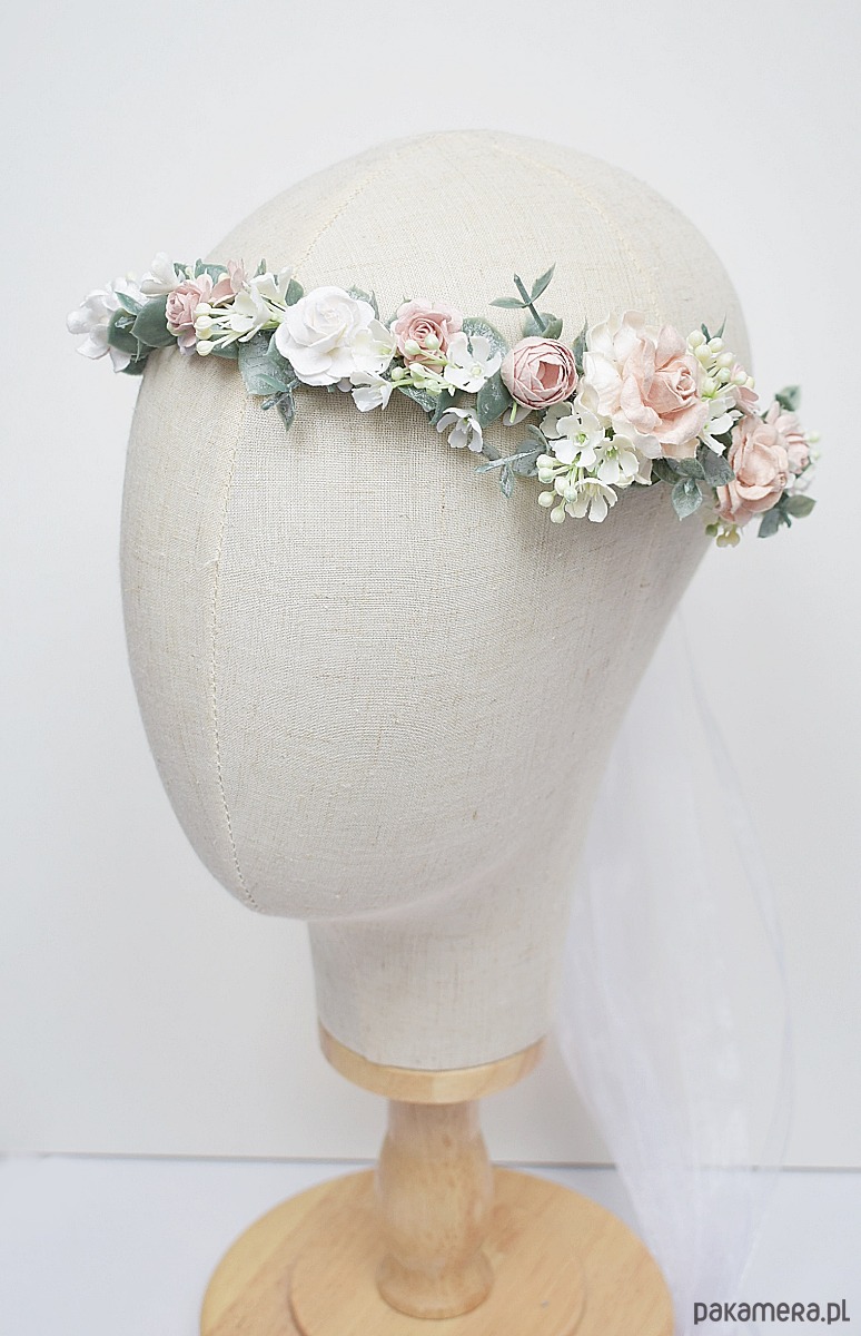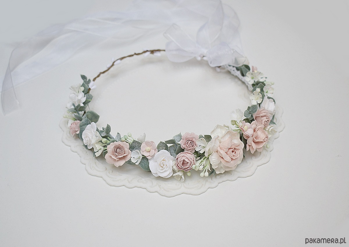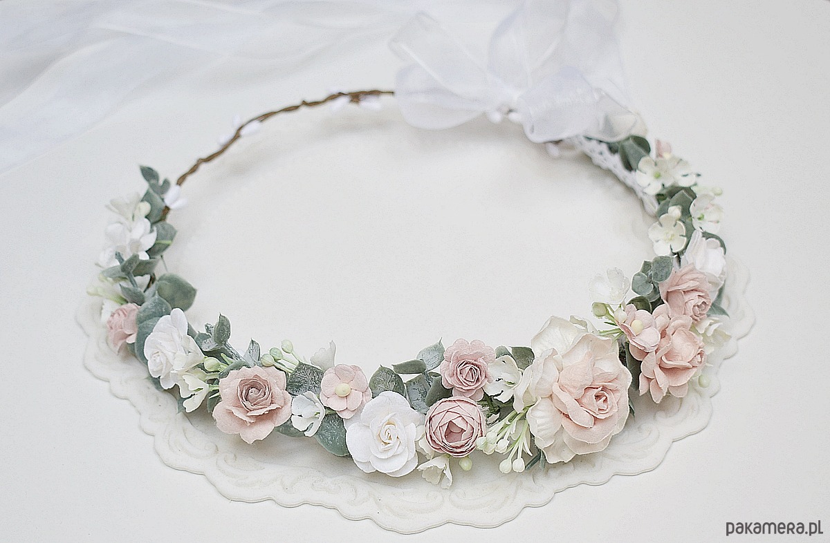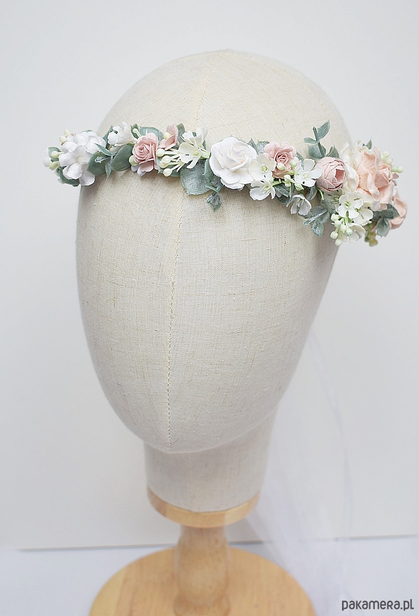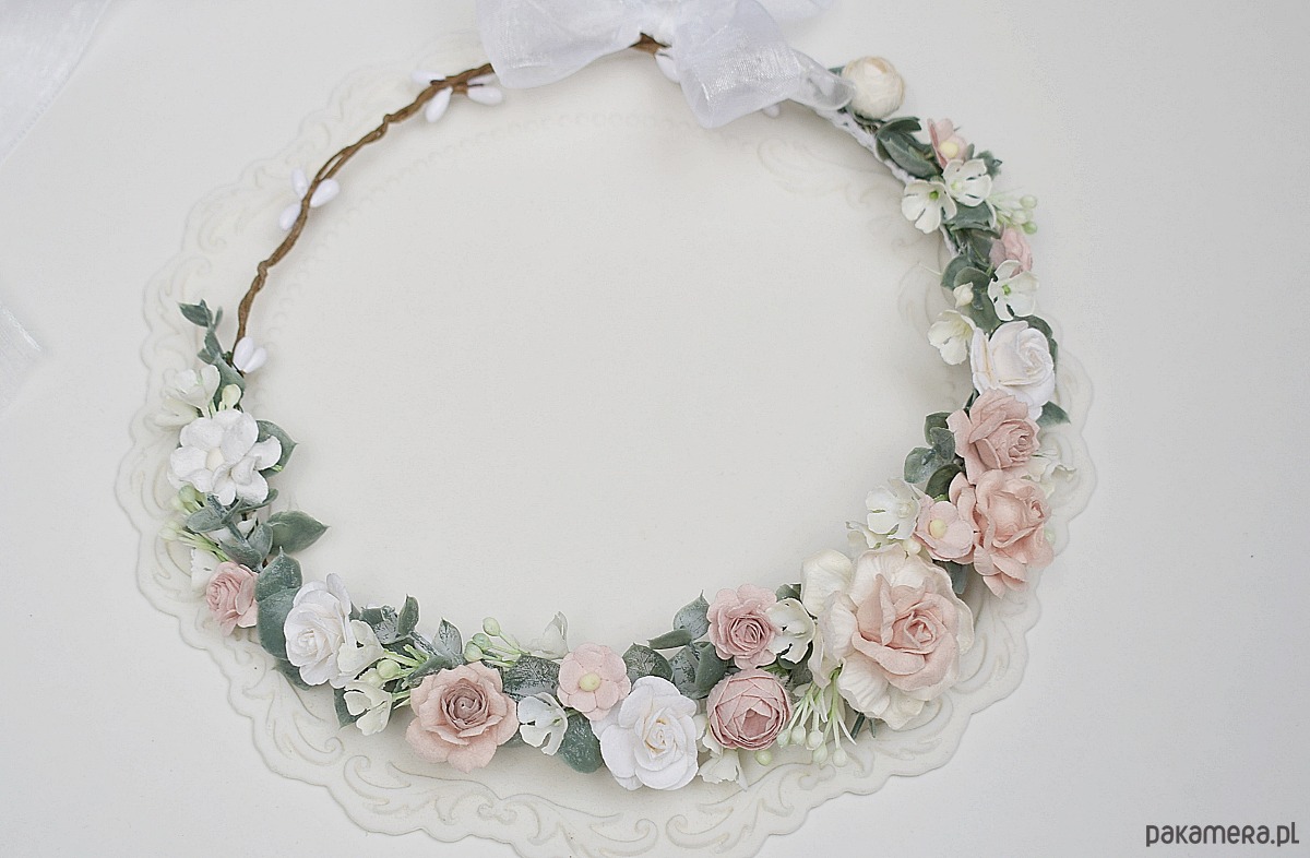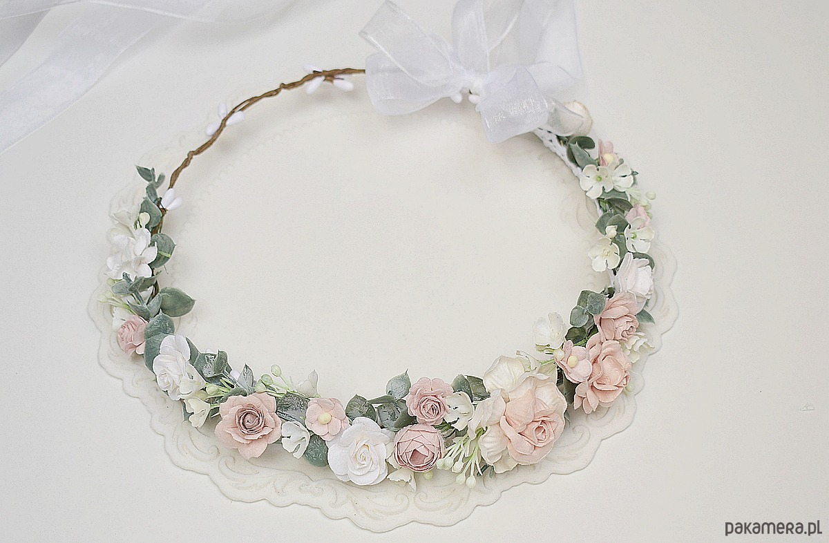 Piękny, delikatny wianek komunijny w kolorystyce biel, nude pink zielone listki eukaliptusa.