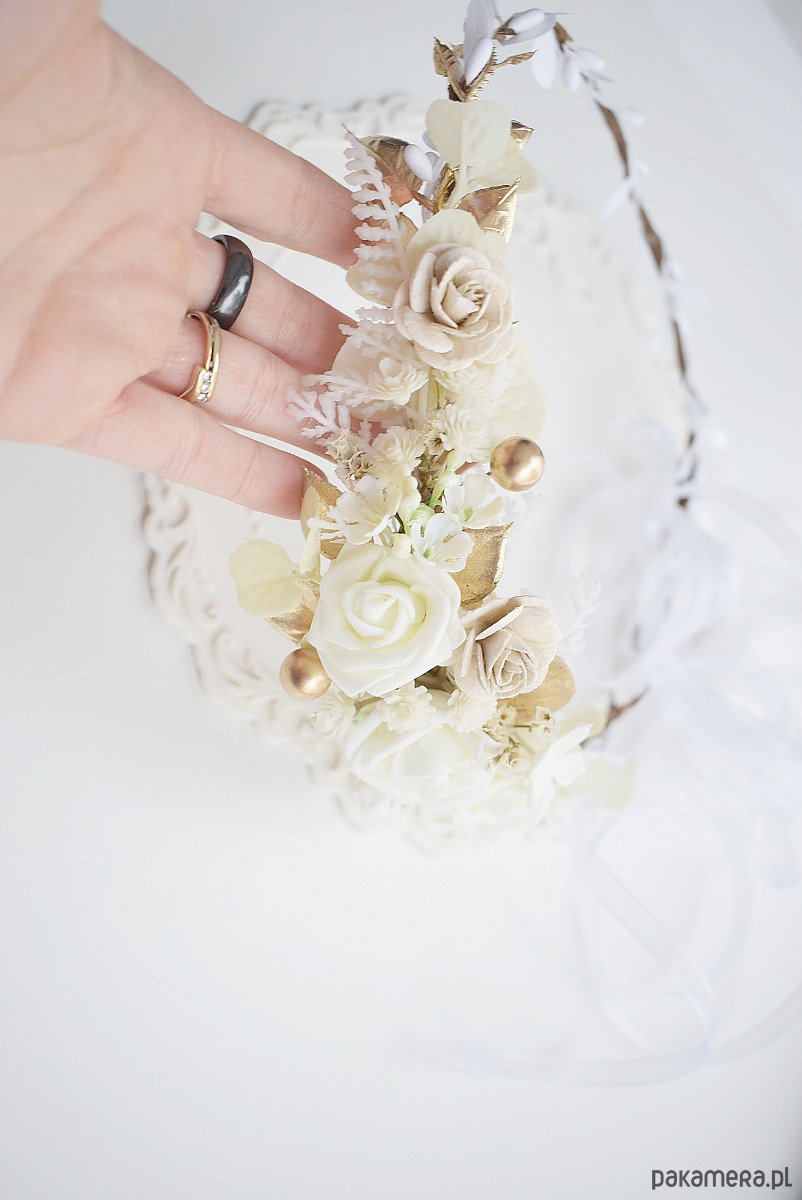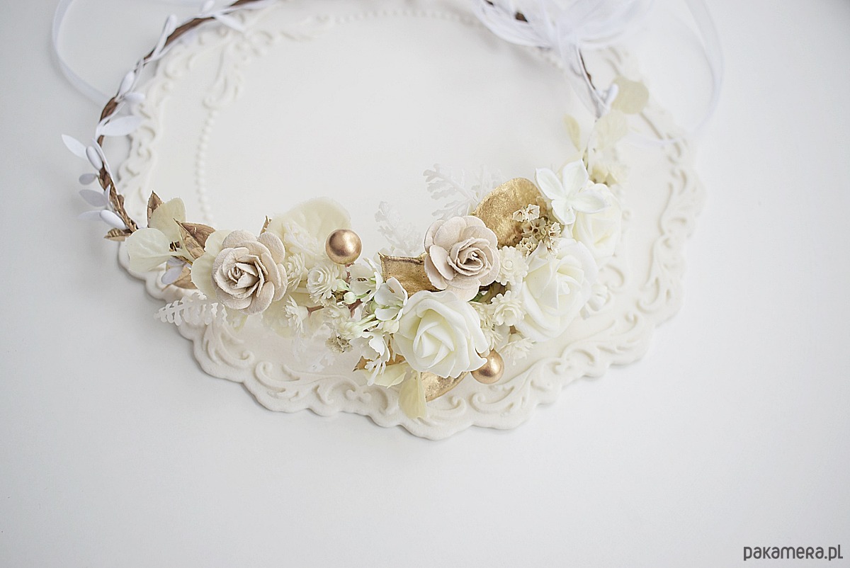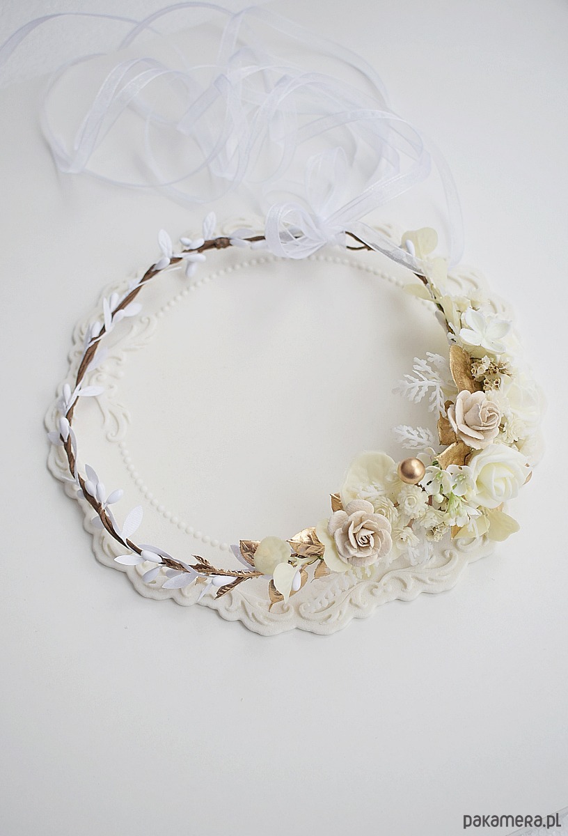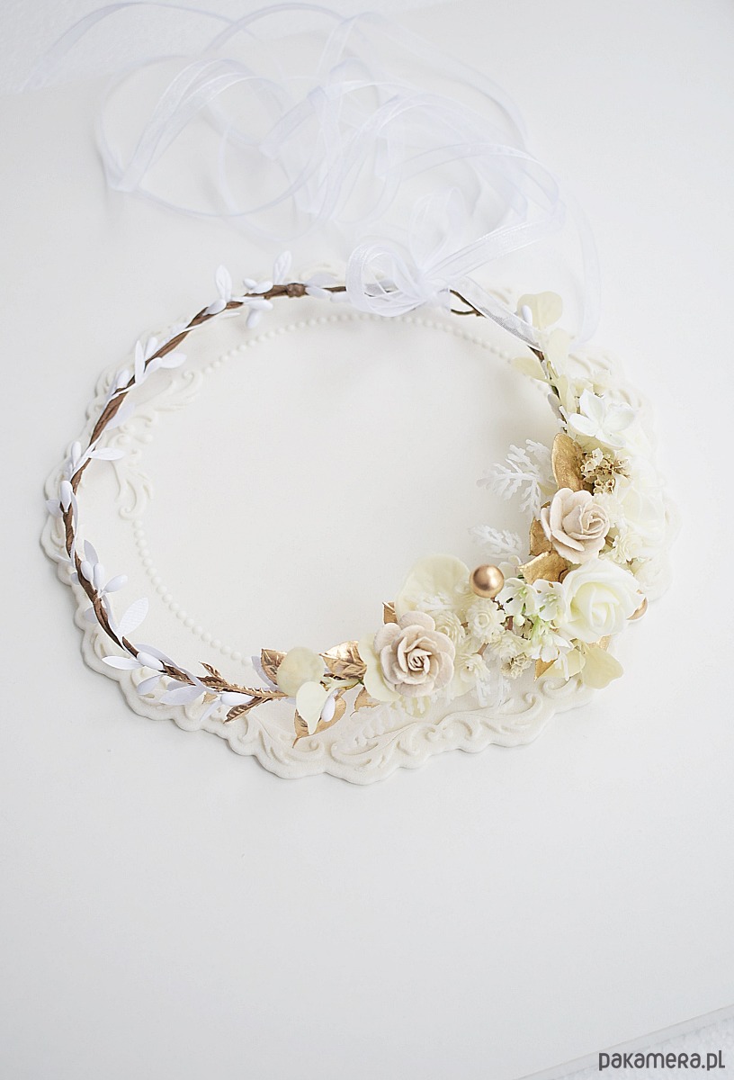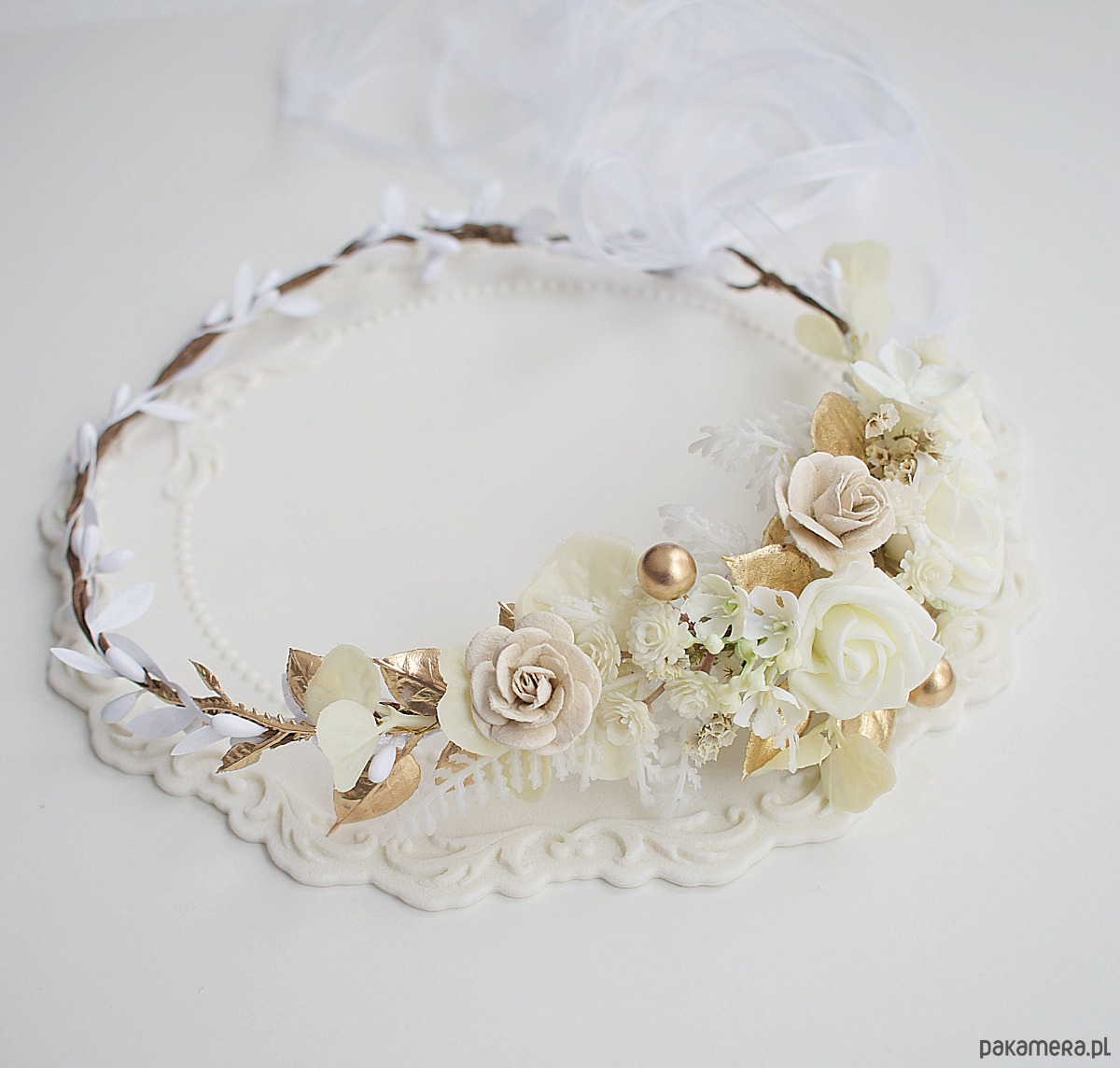 Piękny, delikatny wianek komunijny asymetryczny w kolorystyce biel, kremowy, złoto.