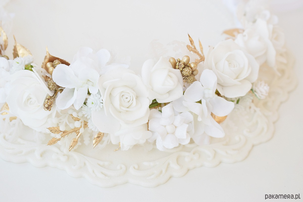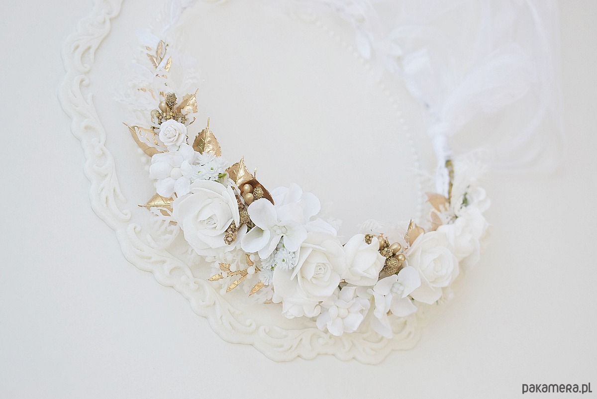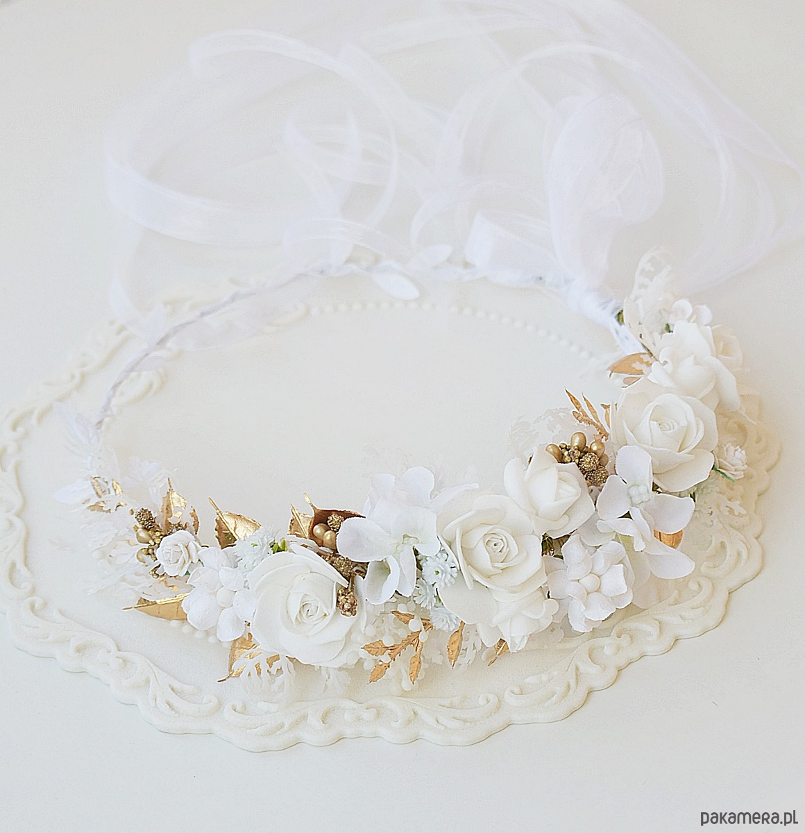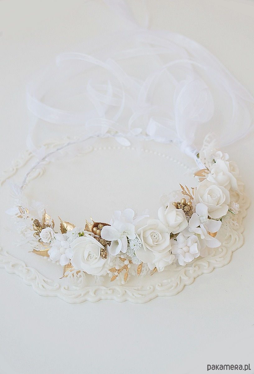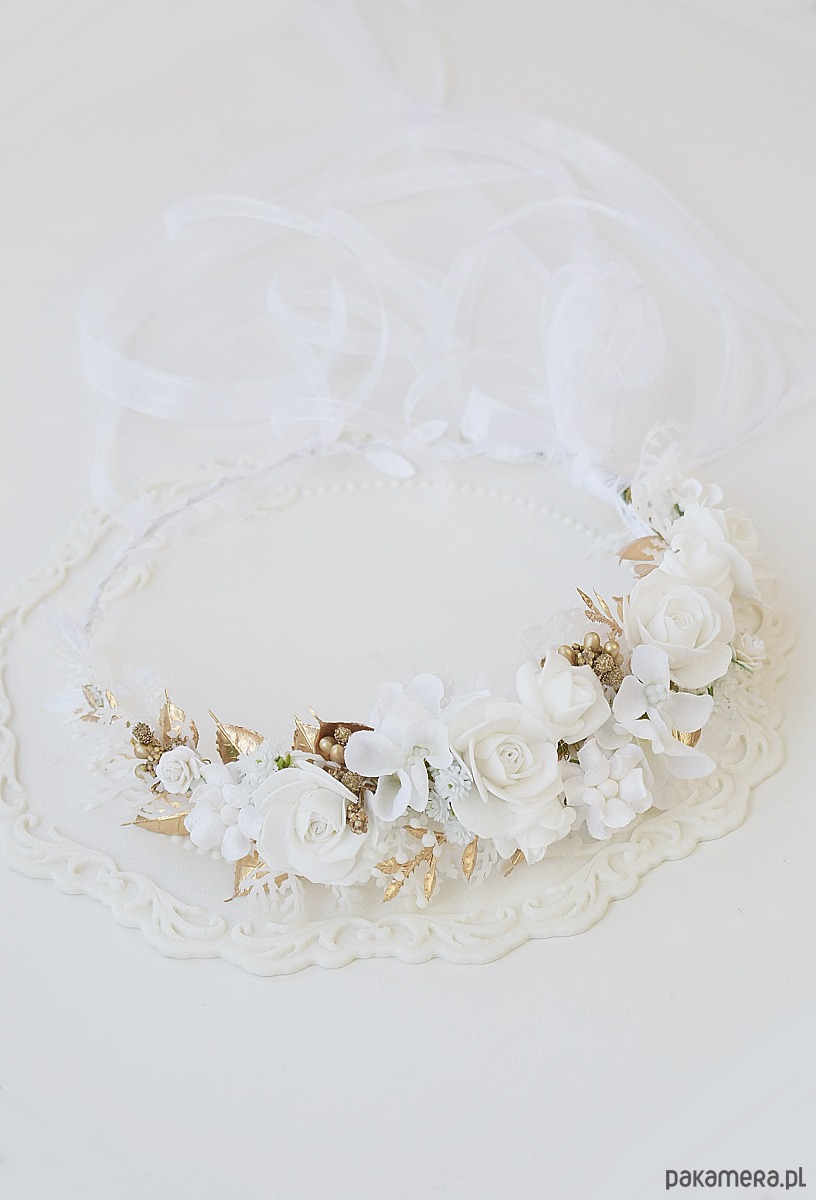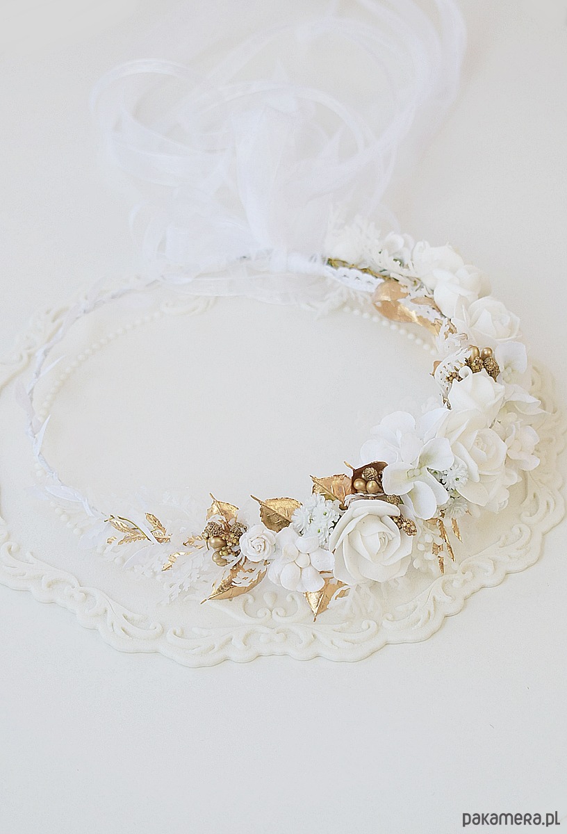 Piękny, delikatny wianek komunijny asymetryczny w kolorystyce biel, złoto.