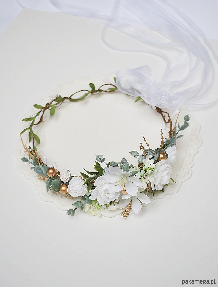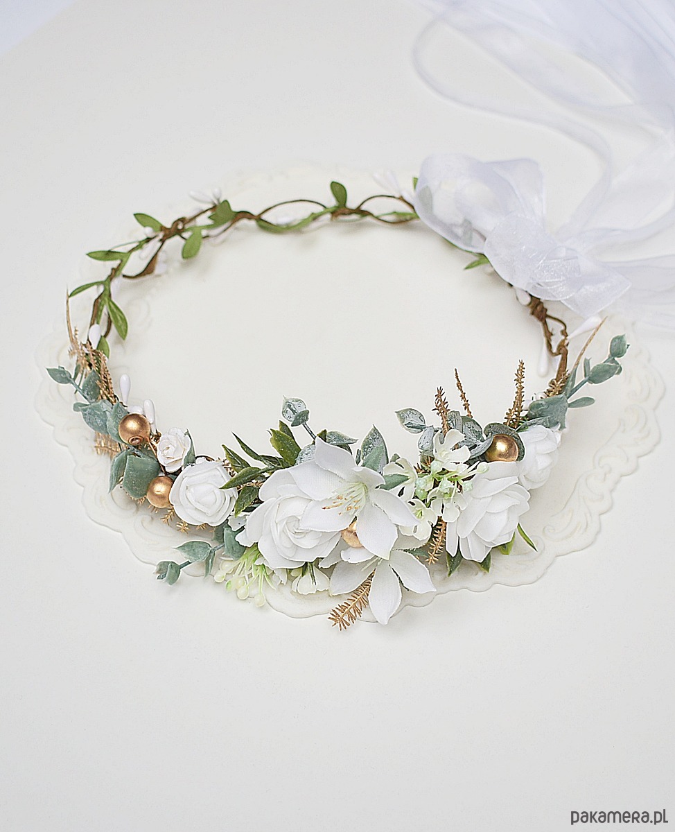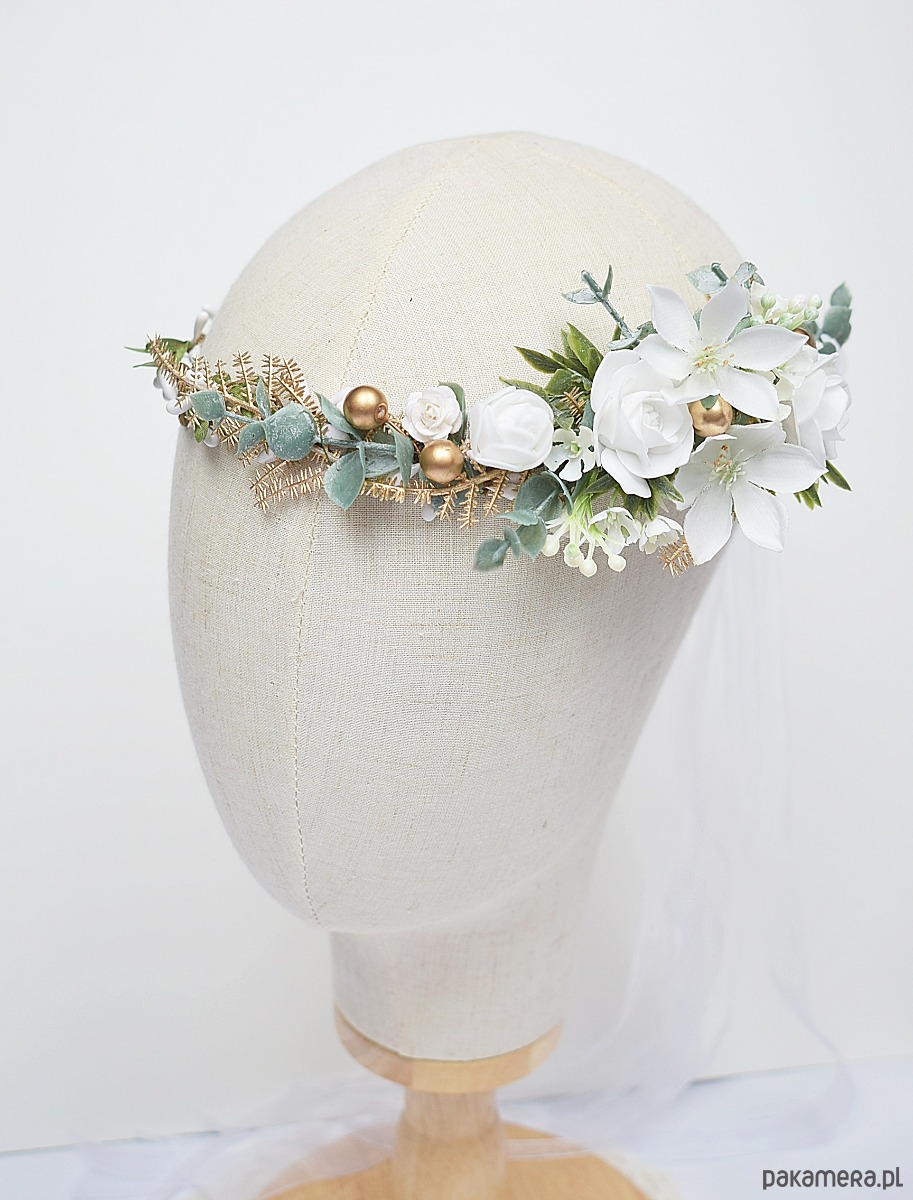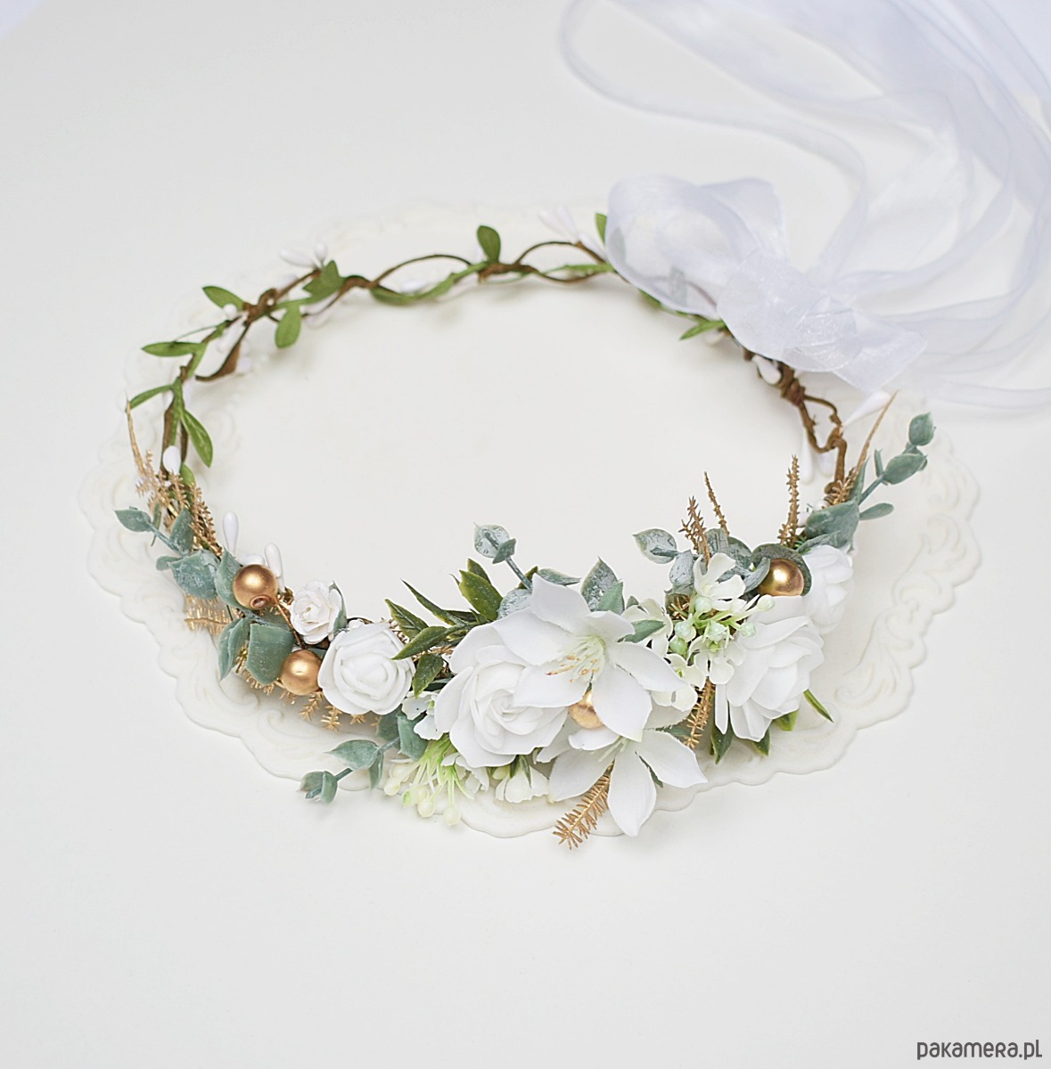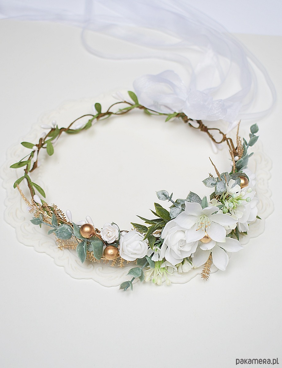 Piękny, asymetryczny delikatny wianek komunijny w kolorystyce biel, złoto zielone listki eukaliptusa.