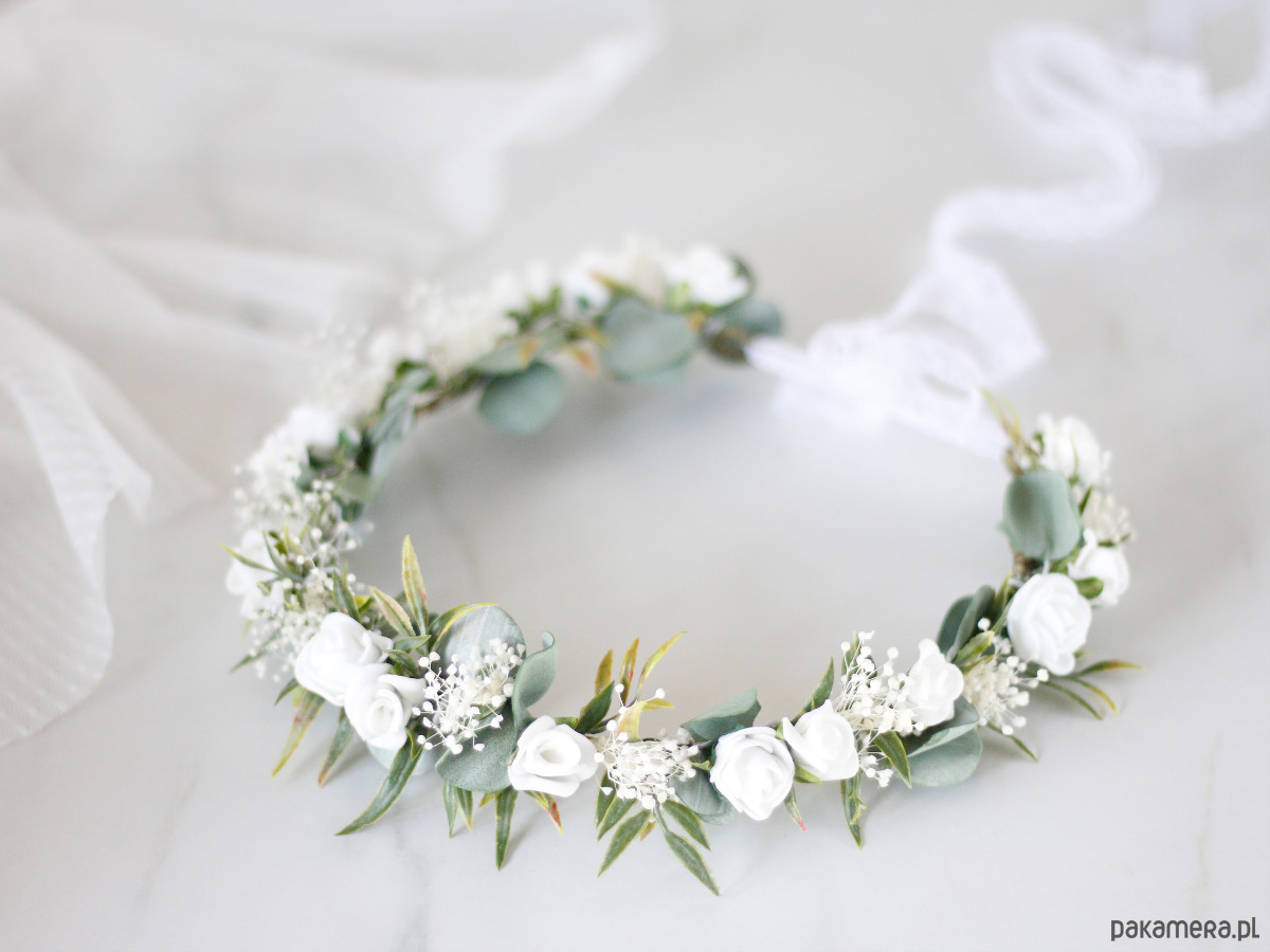Romantyczny wianek na głowę, zdobiony piankowymi różyczkami i listkami eukaliptusa oraz suszoną gipsówką. Możliwość regulacji wielkości obwodu, dzięki koronkowej tasiemce z tyłu. Będzie pasował zarówno na głowę dziecka, jak i osoby dorosłej. Ozdoba będzie idealna na Pierwszą Komunię Świętą. Wianek wykonany ręcznie, z najwyższą starannością, w pracowni "Lola White" w Polsce.