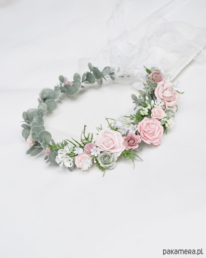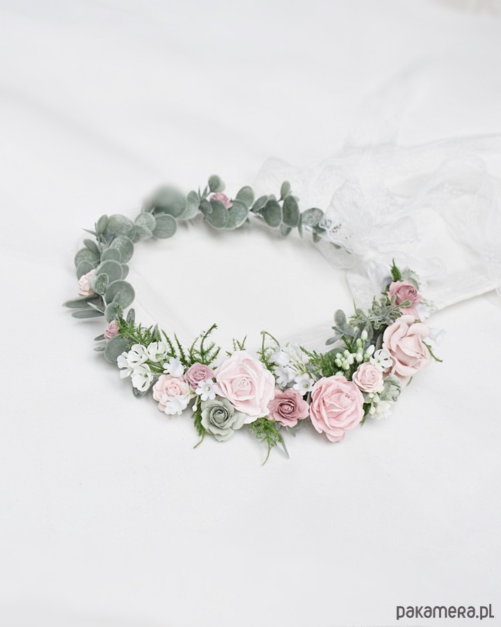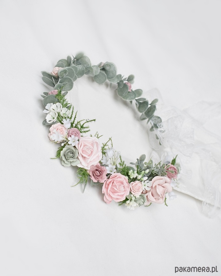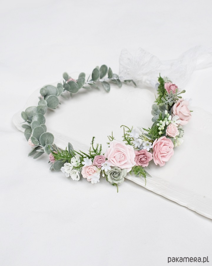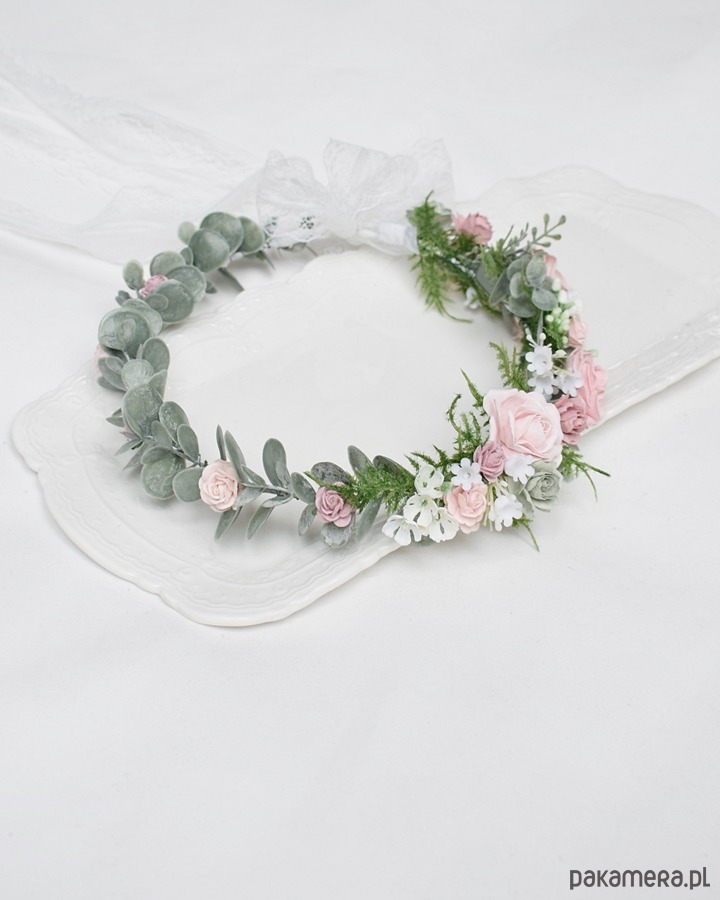Wianek do samodzielnego związania z tyłu główki, zakończony koronkową elegancką wstążką.