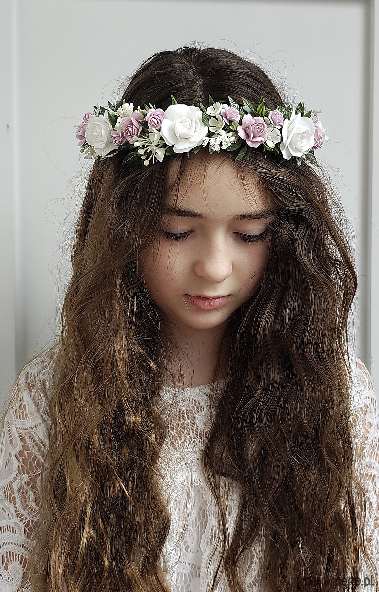 Piękny, delikatny wianek komunijny w kolorystyce róż, biel, fiolet zielone gałązki z drobnymi listkami, z dodatkiem gipsówki i drobnych kwiatów.