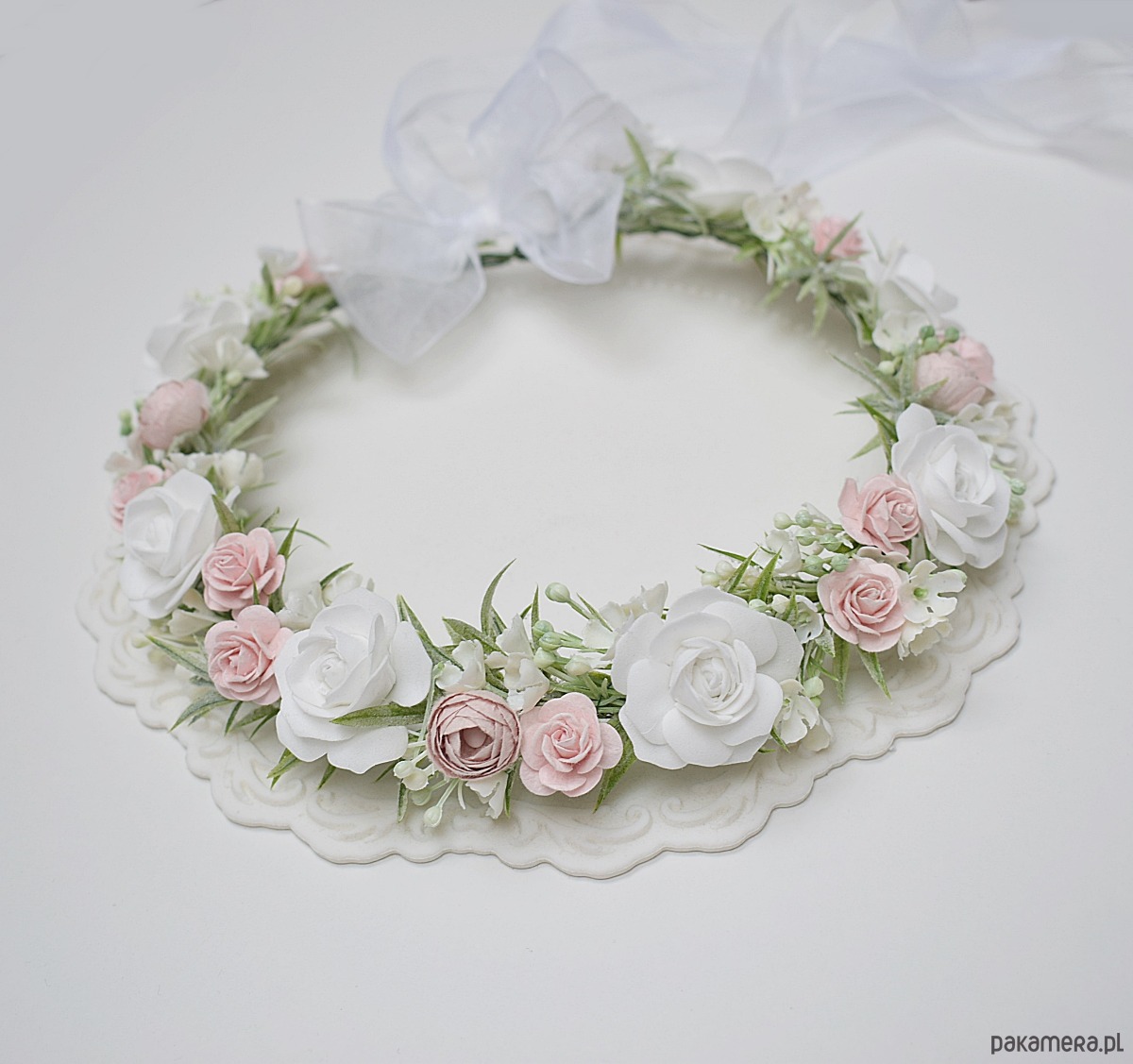 Piękny, delikatny wianek komunijny w kolorystyce róż, biel, pudrowa zieleń.