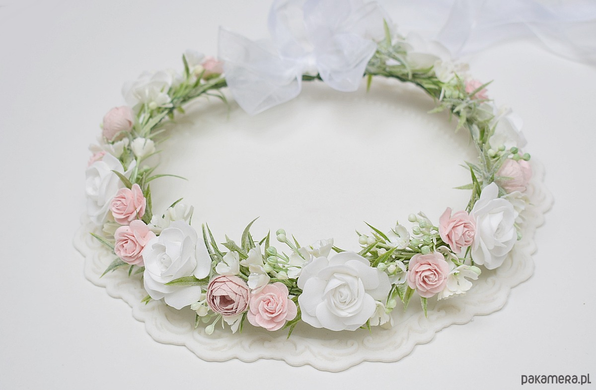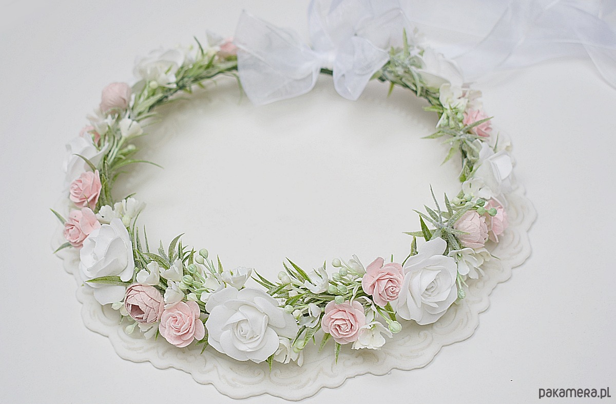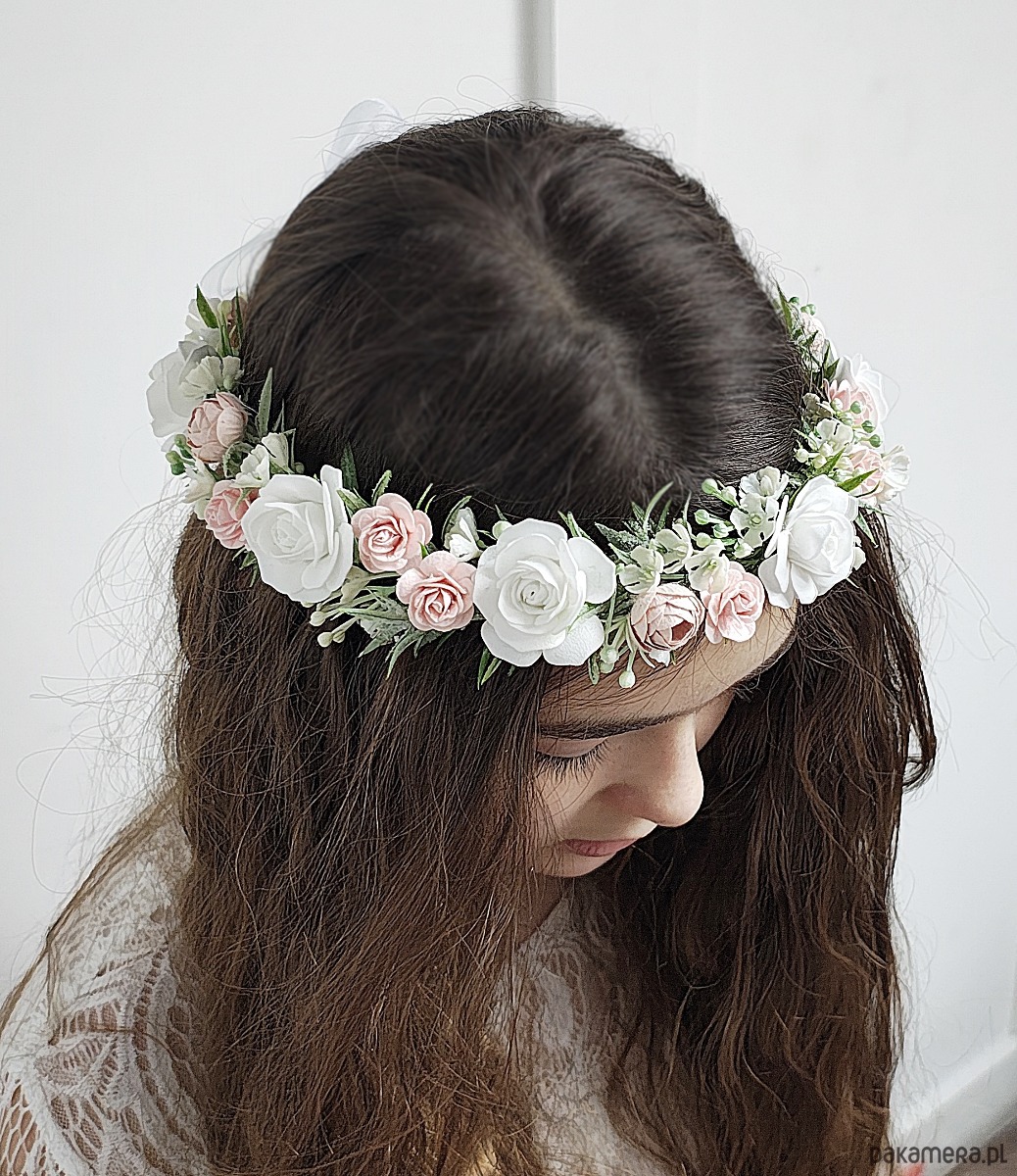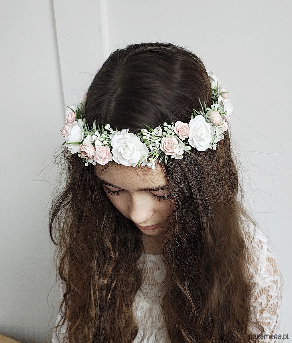 Piękny, delikatny wianek komunijny w kolorystyce róż, biel, pudrowa zieleń.