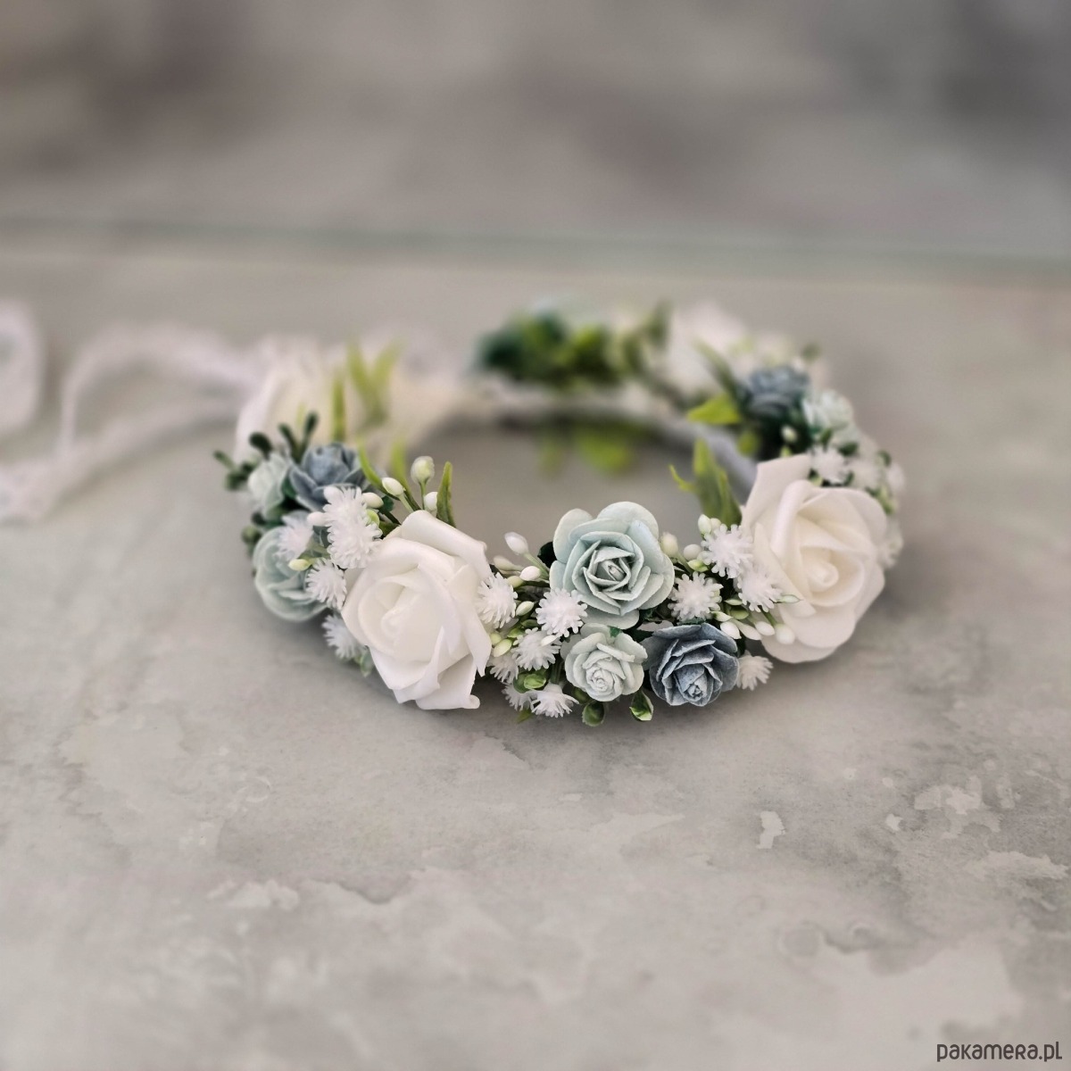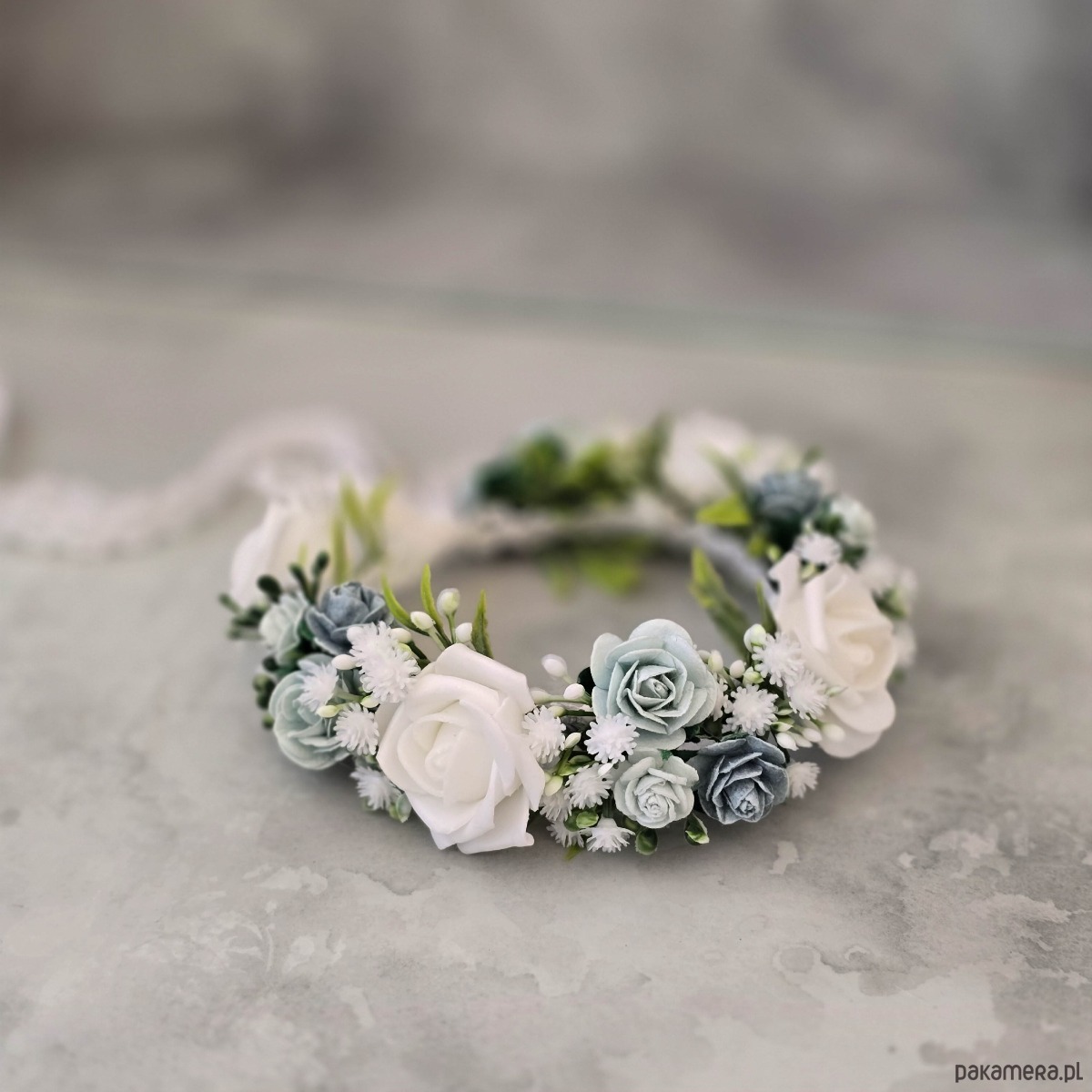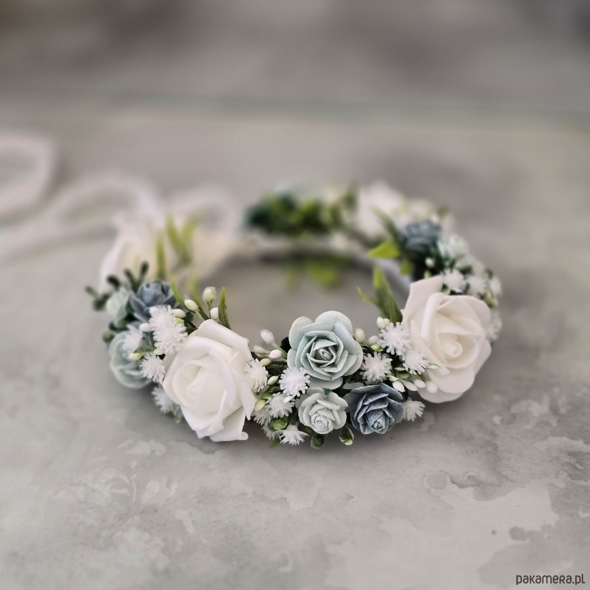 Romantyczny wianek na koczek, zdobiony piankowymi i papierowymi różyczkami, syntetyczną gipsówką i listkami. Możliwość regulacji wielkości obwodu, dzięki koronkowej tasiemce z tyłu. Ozdoba będzie idealna na Pierwszą Komunię Świętą. Wianek wykonany ręcznie, z najwyższą starannością, w pracowni "Lola White" w Polsce.