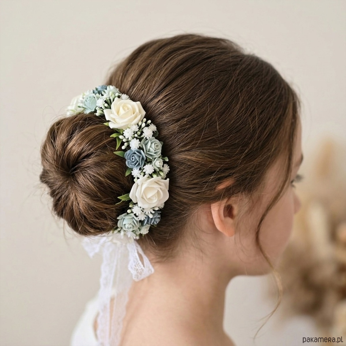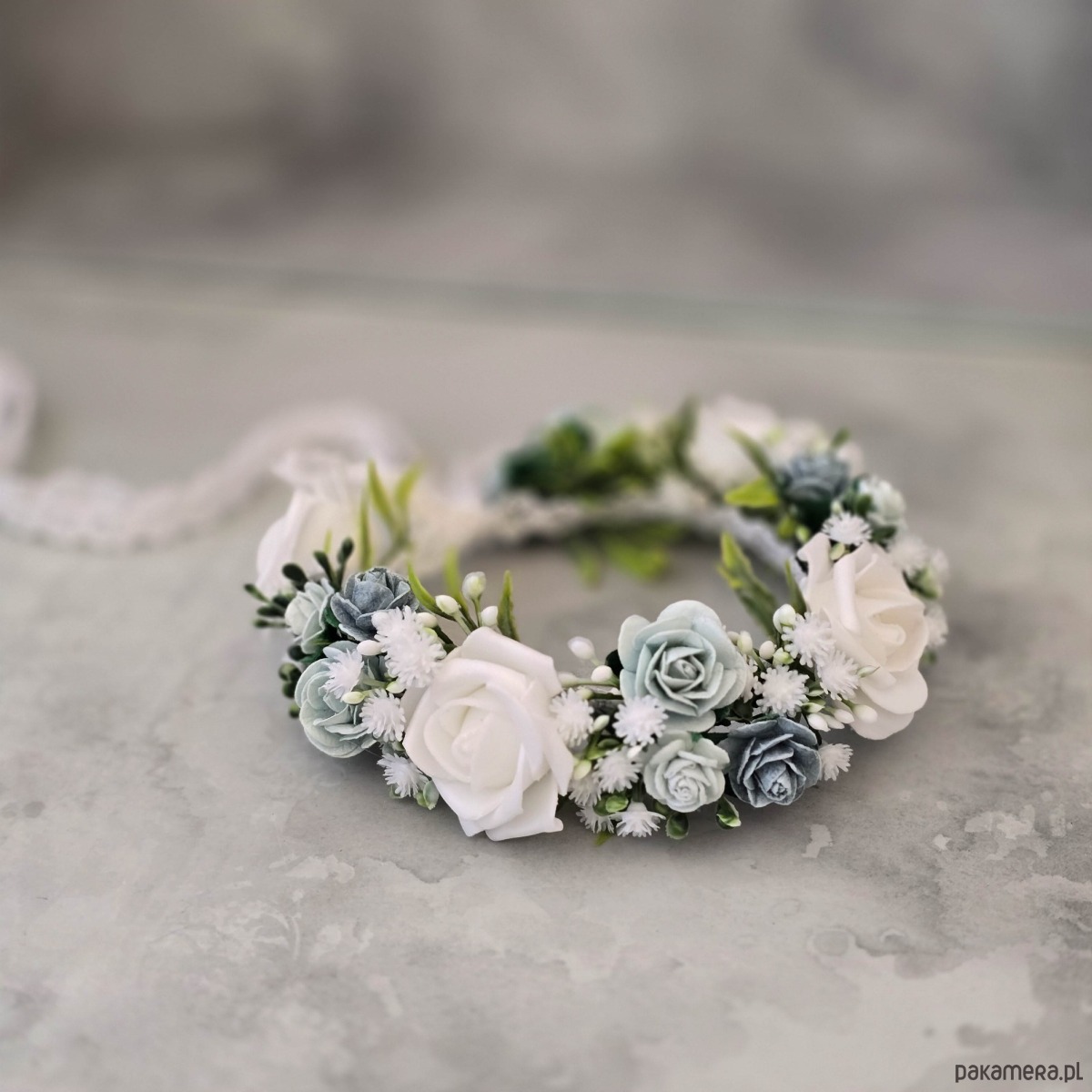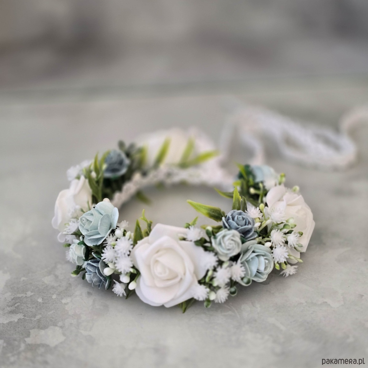 Romantyczny wianek na koczek, zdobiony piankowymi i papierowymi różyczkami, syntetyczną gipsówką i listkami. Możliwość regulacji wielkości obwodu, dzięki koronkowej tasiemce z tyłu. Ozdoba będzie idealna na Pierwszą Komunię Świętą. Wianek wykonany ręcznie, z najwyższą starannością, w pracowni "Lola White" w Polsce.