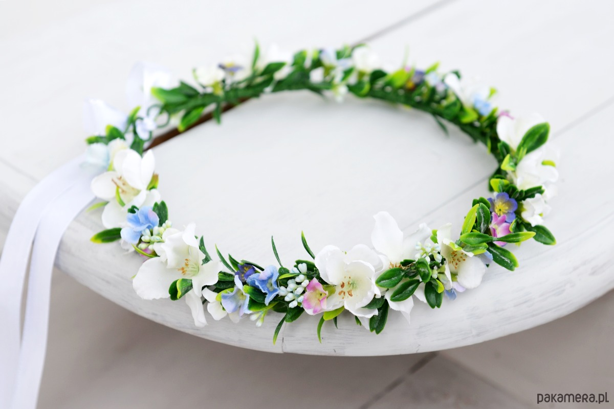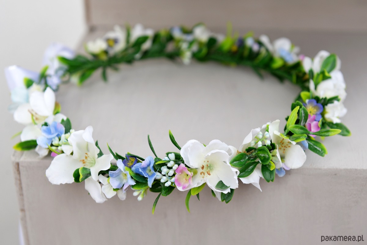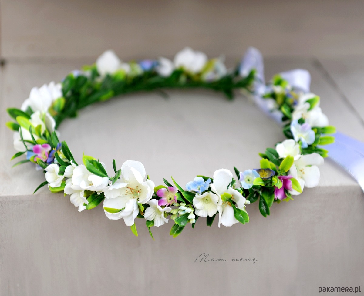 Uroczy wianuszek wykonałam z białych kwiatów jabłoni i niezapominajek otoczonych zielenią.