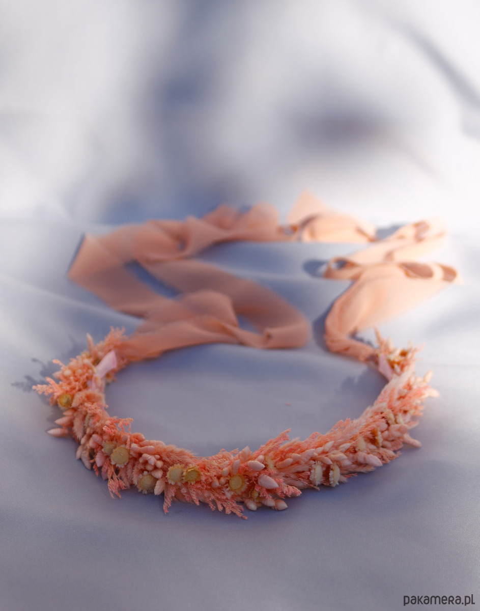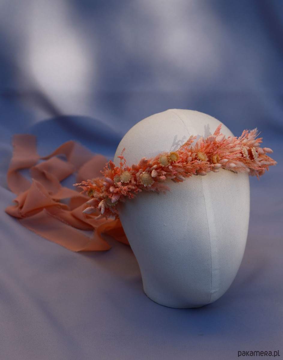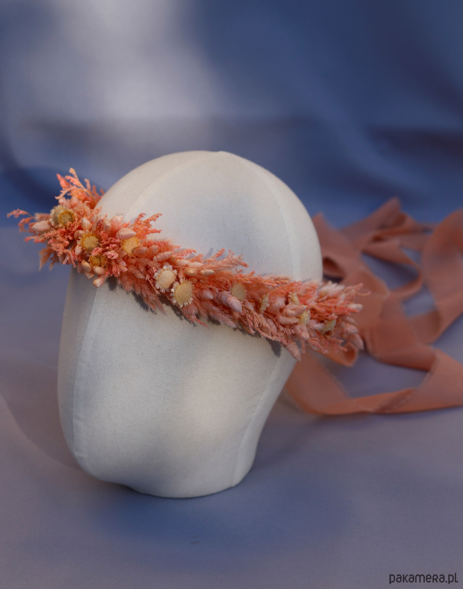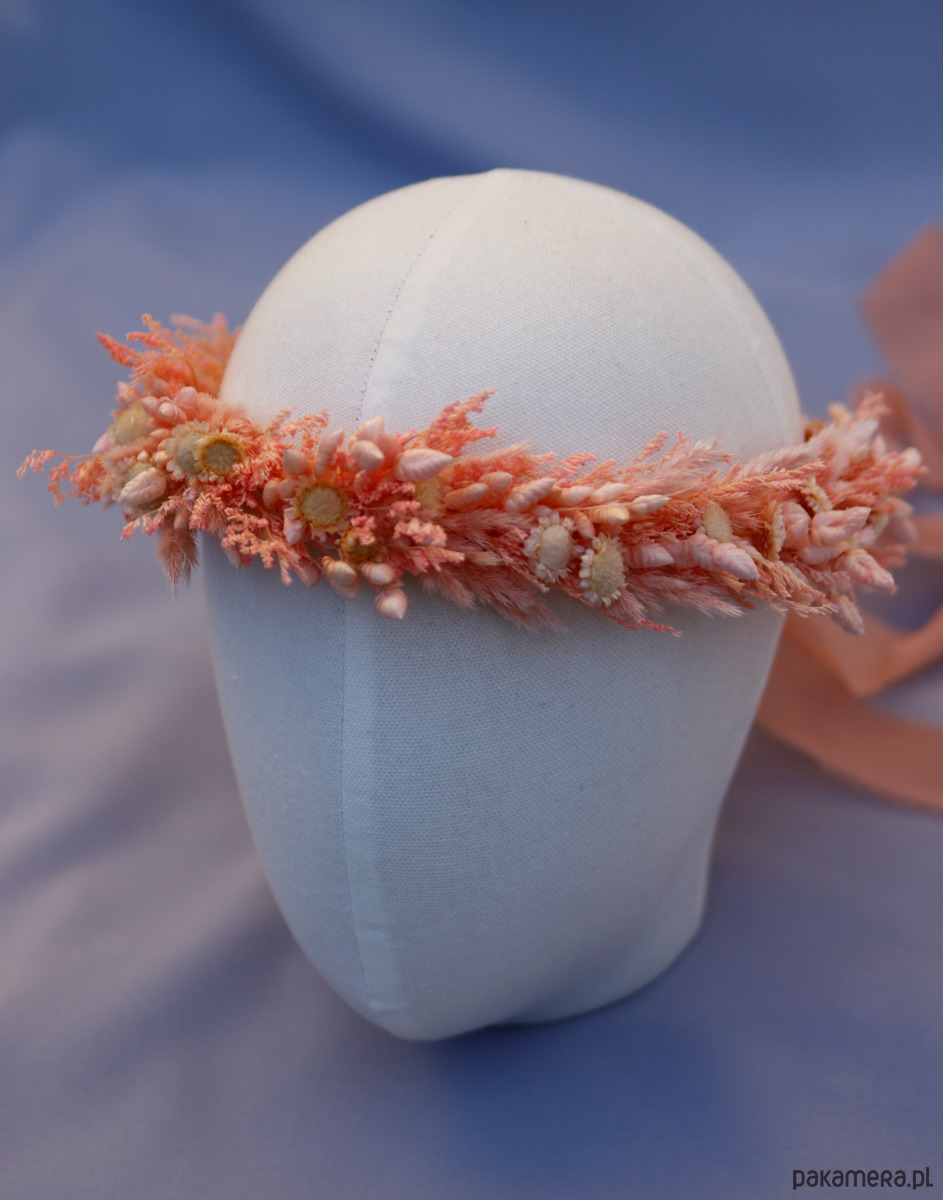 Elegancki wianek komunijny, w odcieniach pastelowego różu o lekko łososiowym odcieniu.