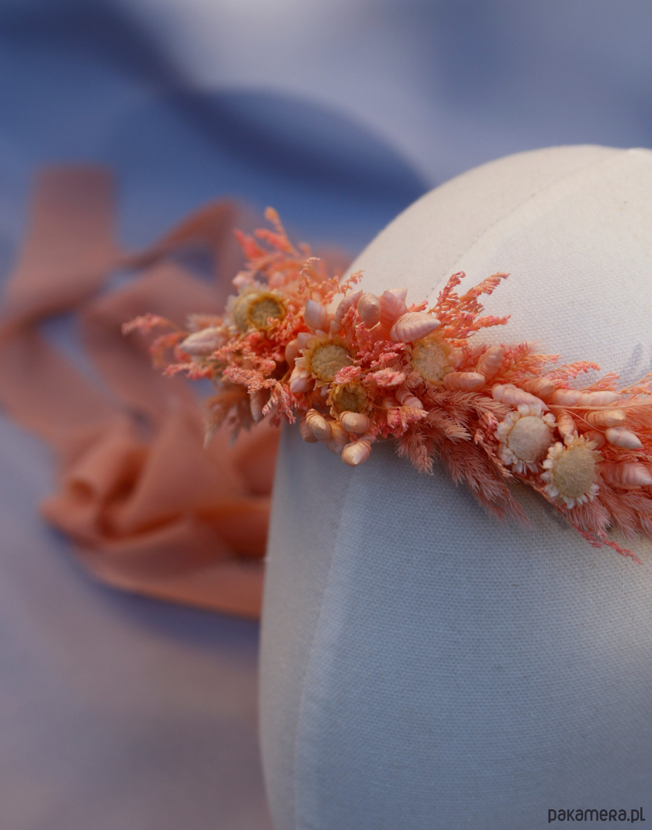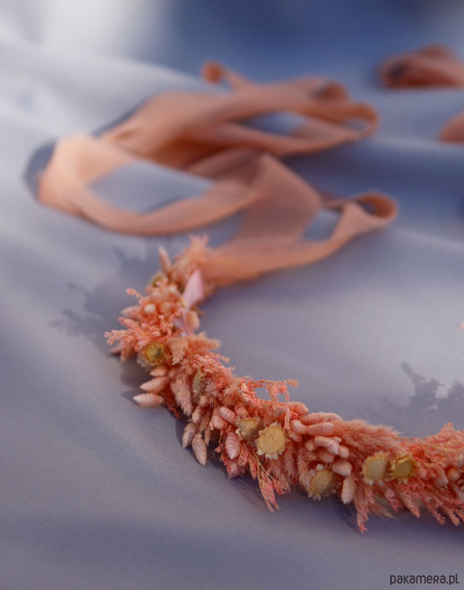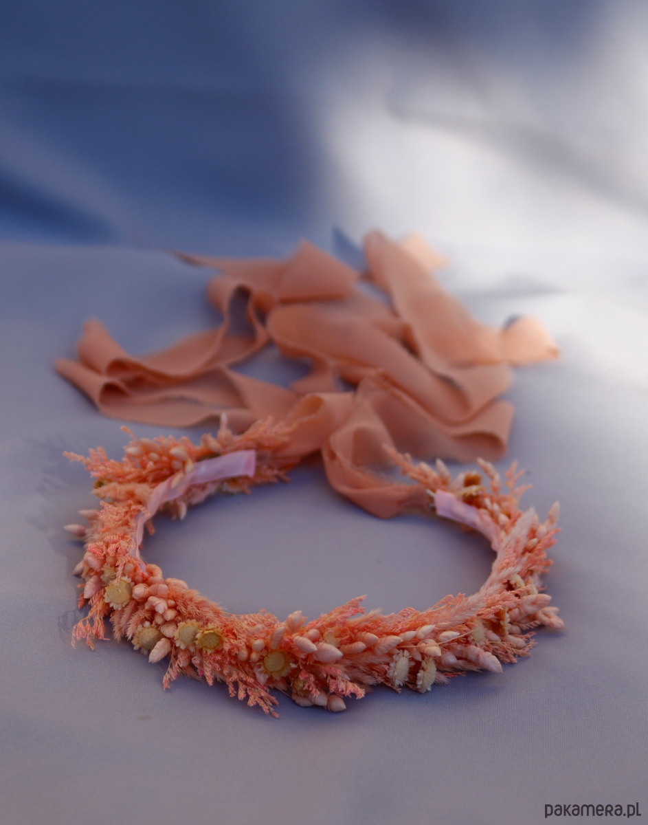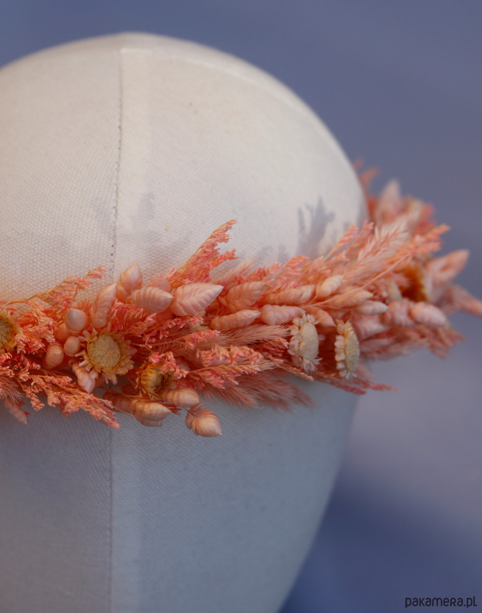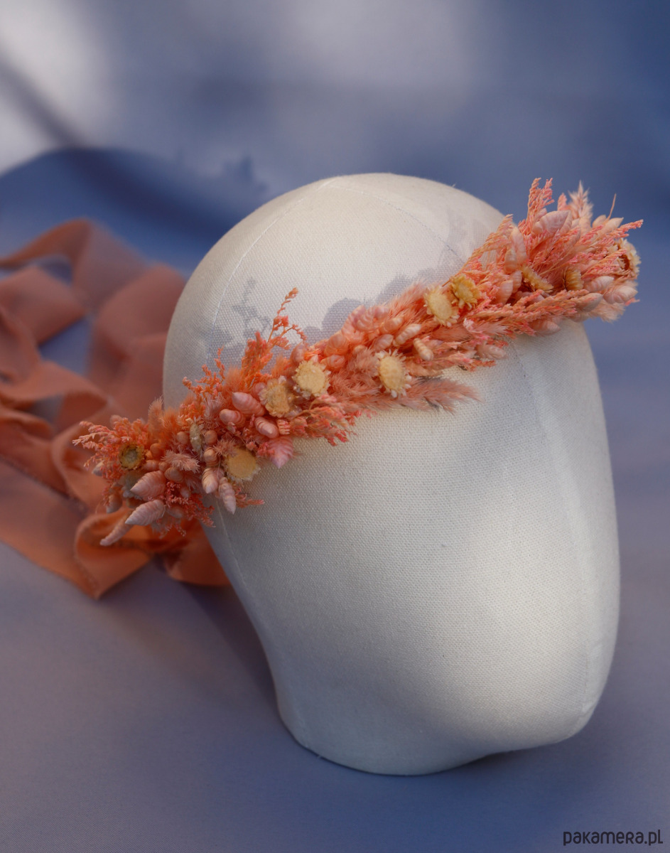 Elegancki wianek komunijny, w odcieniach pastelowego różu o lekko łososiowym odcieniu.