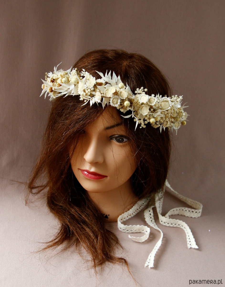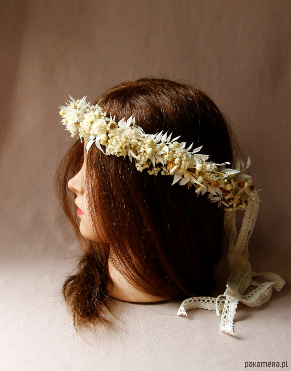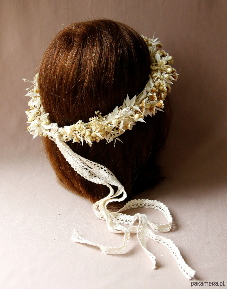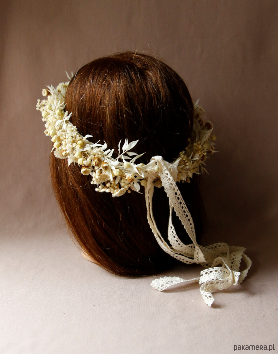 Wianek regulowany wstążkami- w zestawie wstążki koronkowe bawełniane, można wymienić na szyfonowe szarpane, lub satynowe, w razie chęci wymiany poproszę o informacje w wiadomości.