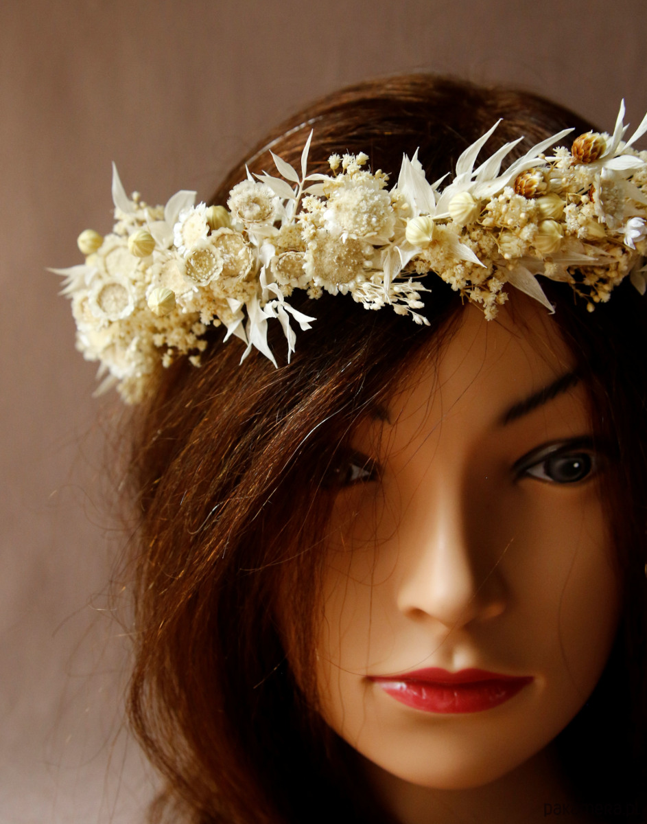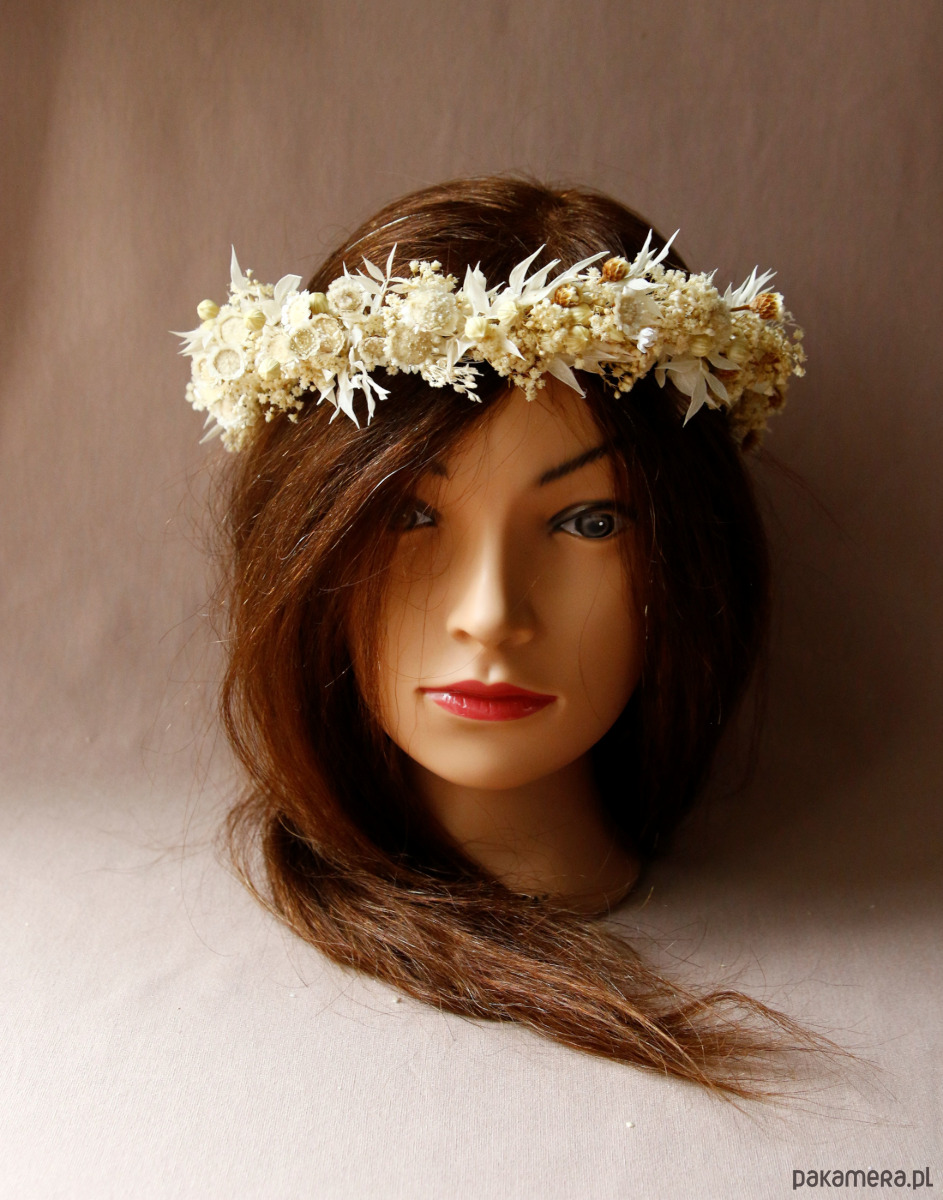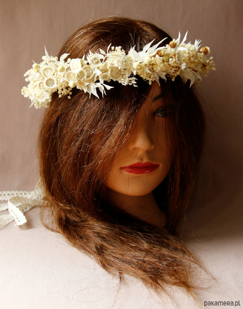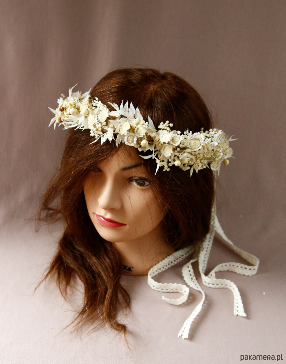 Wianek regulowany wstążkami- w zestawie wstążki koronkowe bawełniane, można wymienić na szyfonowe szarpane, lub satynowe, w razie chęci wymiany poproszę o informacje w wiadomości.