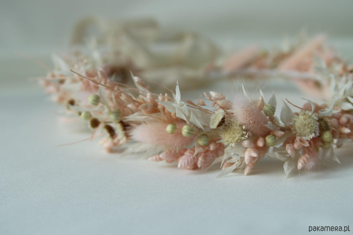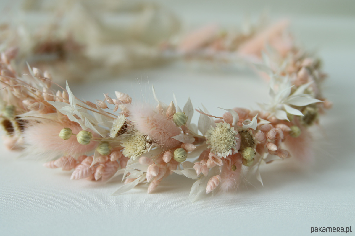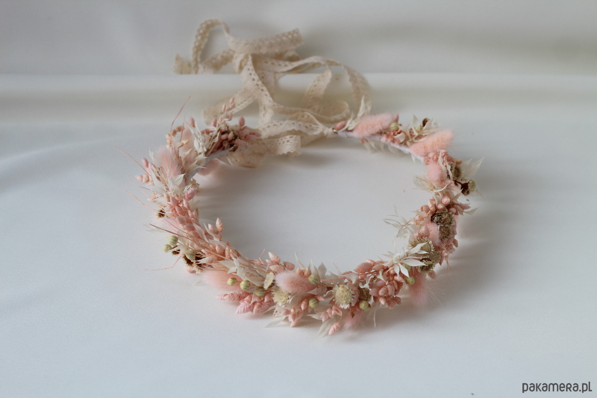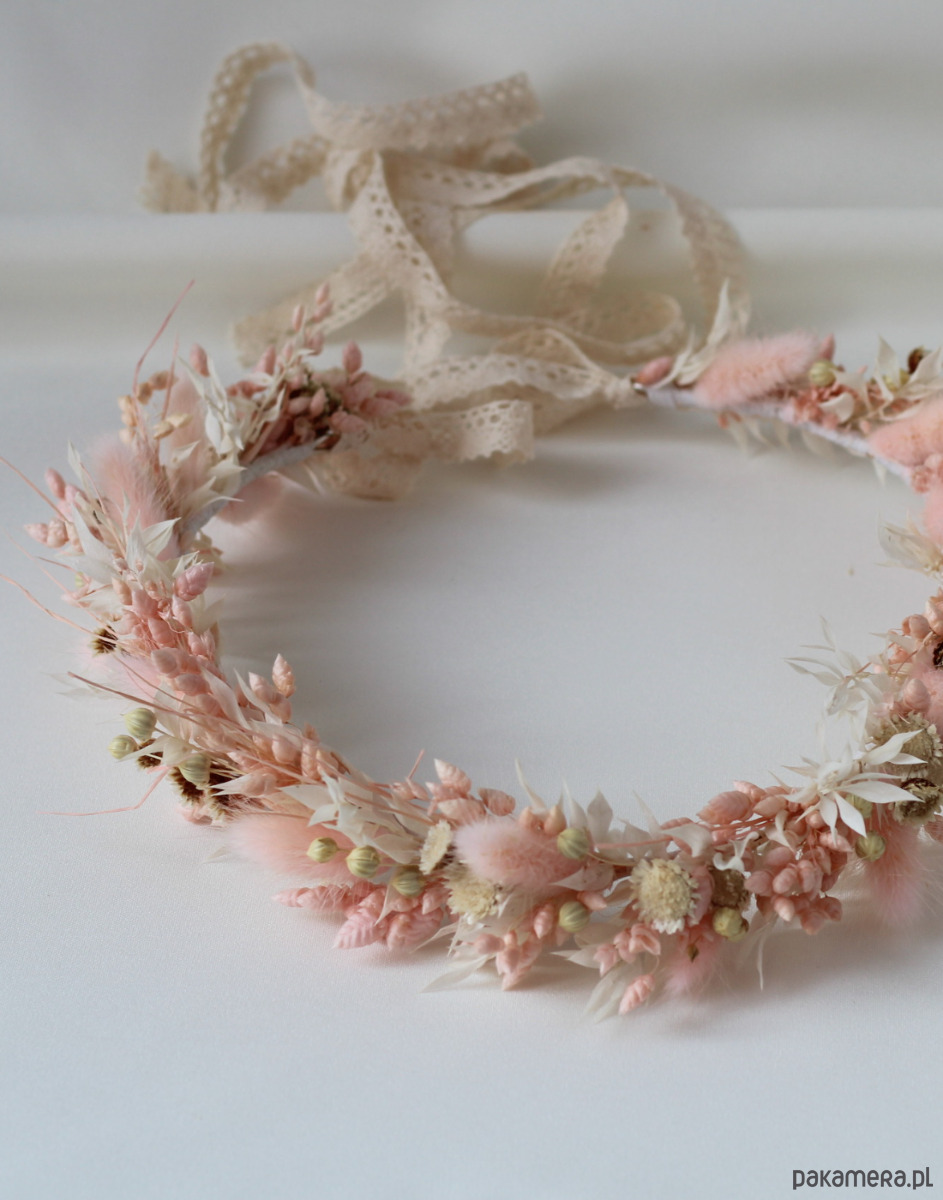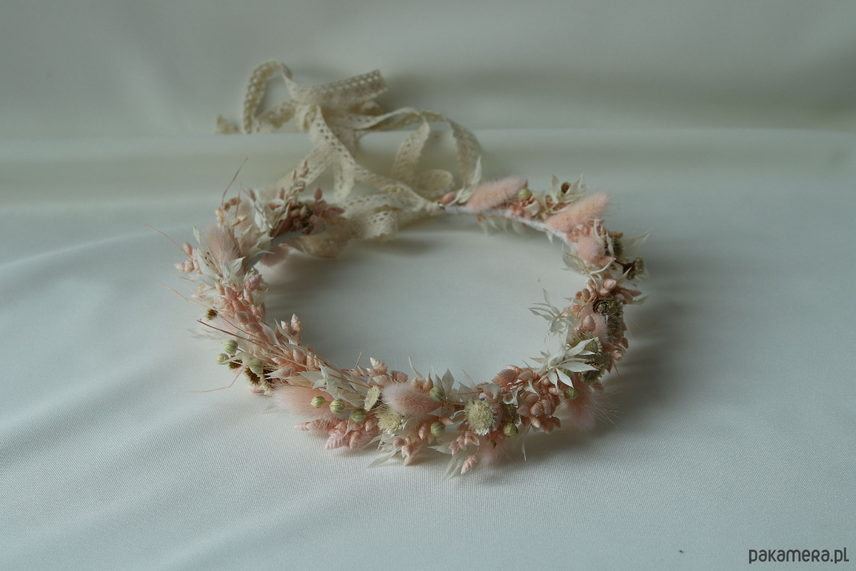 Wianek regulowany wstążkami- w zestawie wstążki koronkowe bawełniane, można wymienić na szyfonowe szarpane, lub satynowe, w razie chęci wymiany poproszę o informacje w wiadomości.