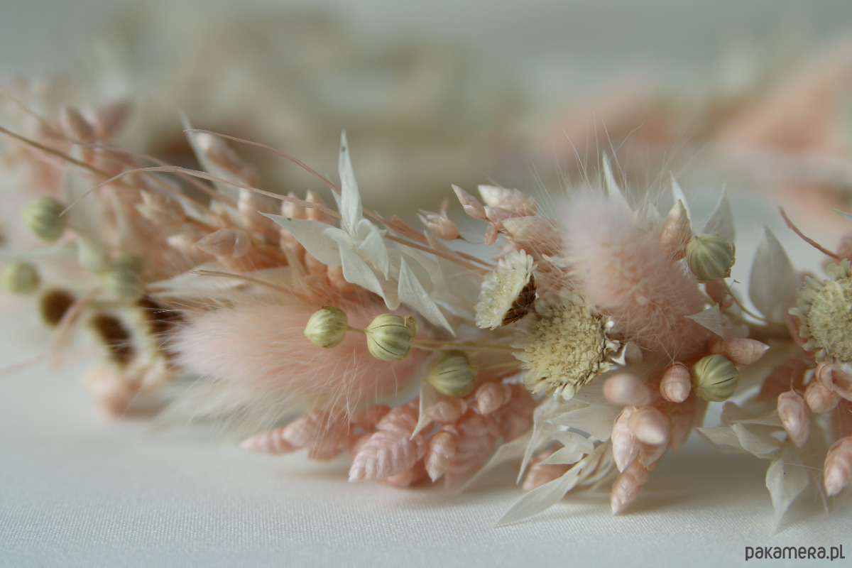 Stworzony z troską o detale z suszonych naturalnych kwiatów i traw i roślin stabilizowanych w pięknych jasnych pastelowych kolorach.