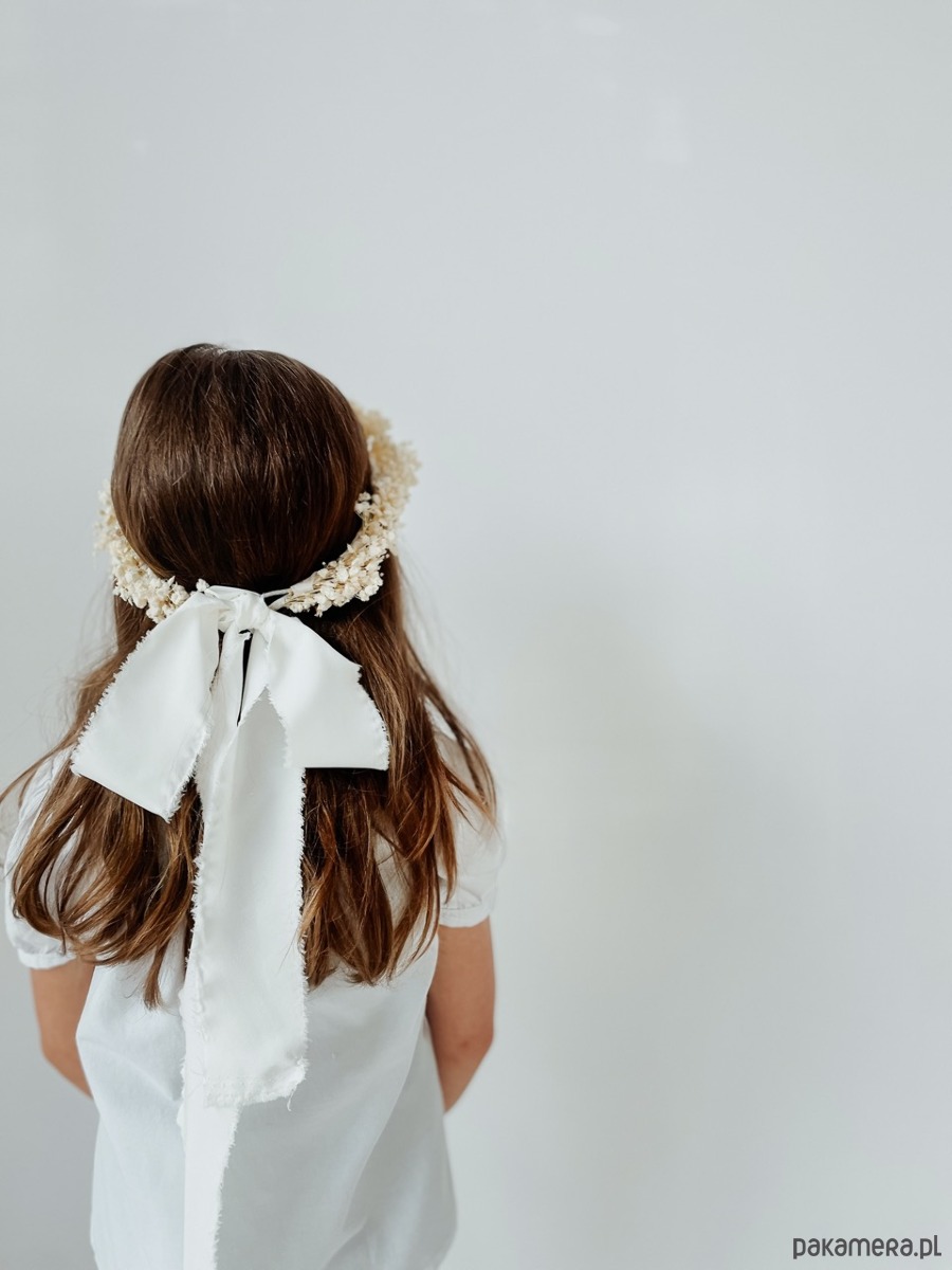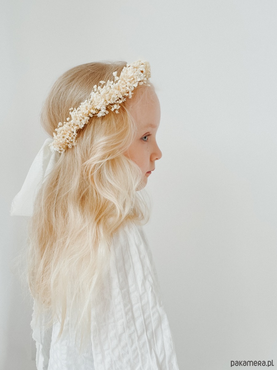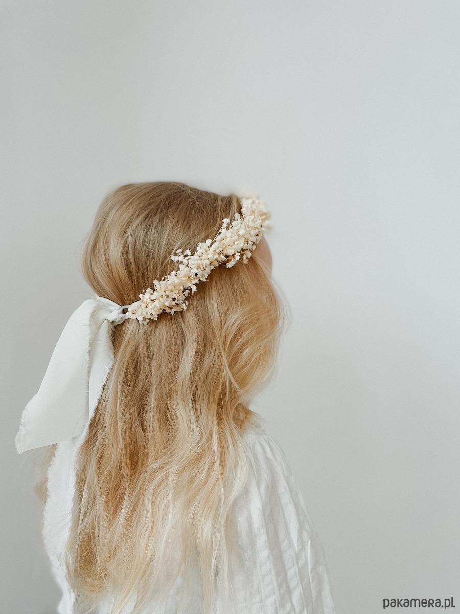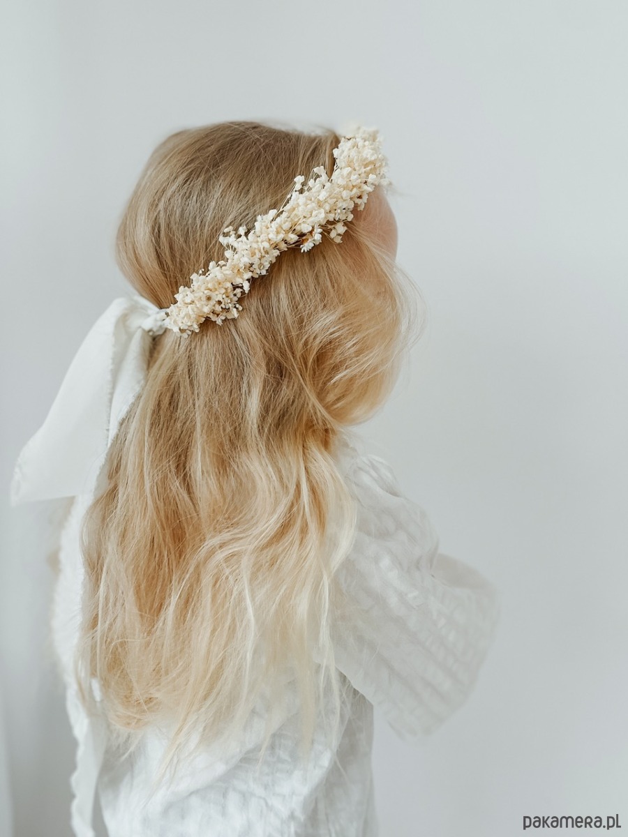 Wianek komunijny dla dziewczynki, wykonany z preparowanej gipsówki z dodatkiem glixii.