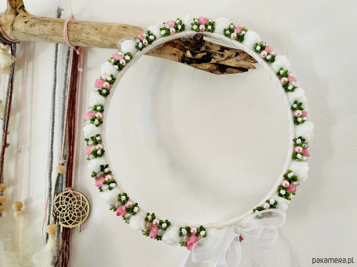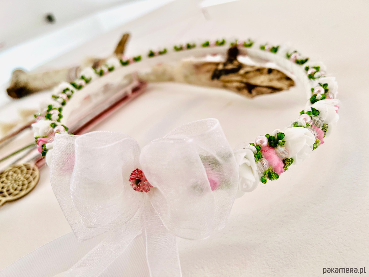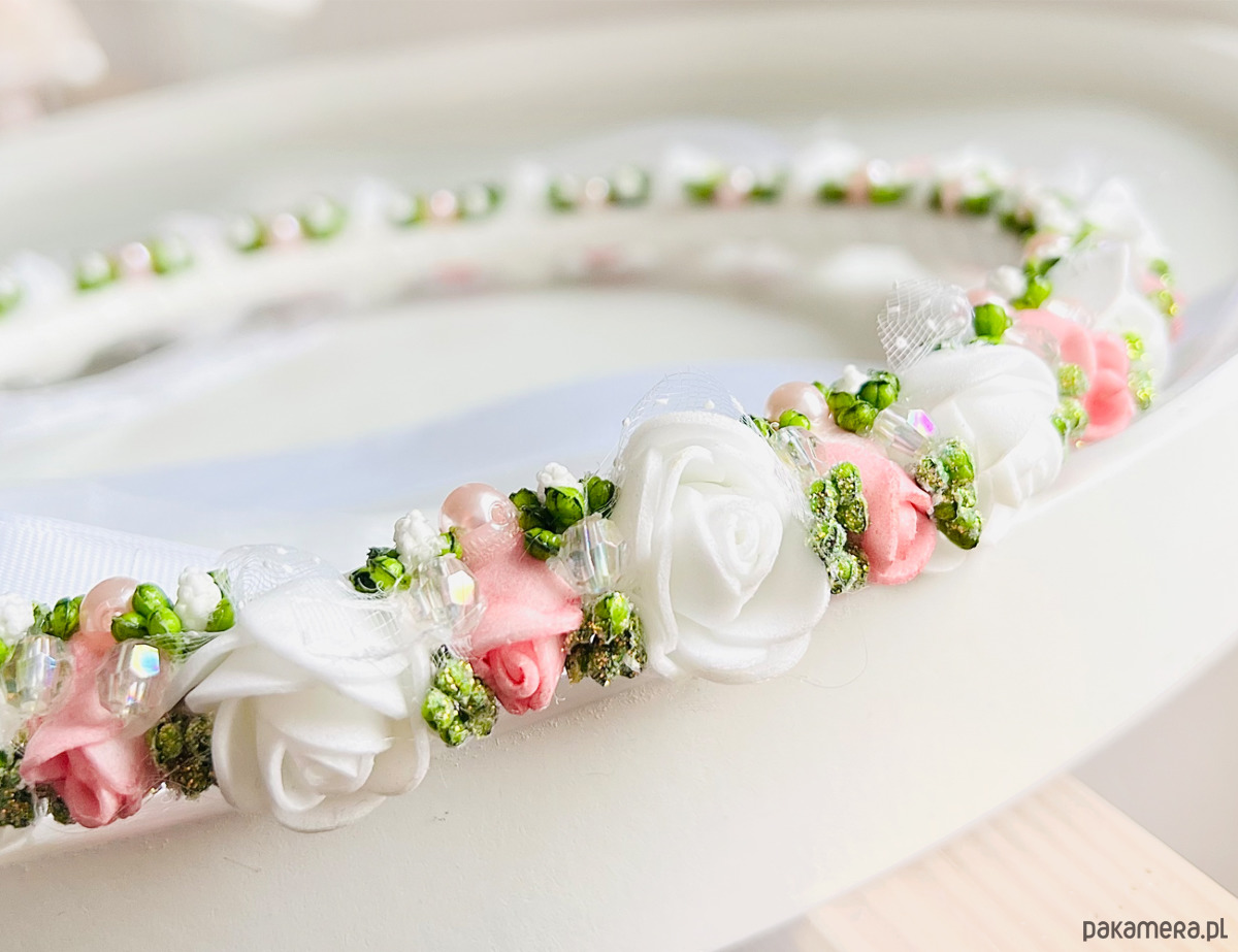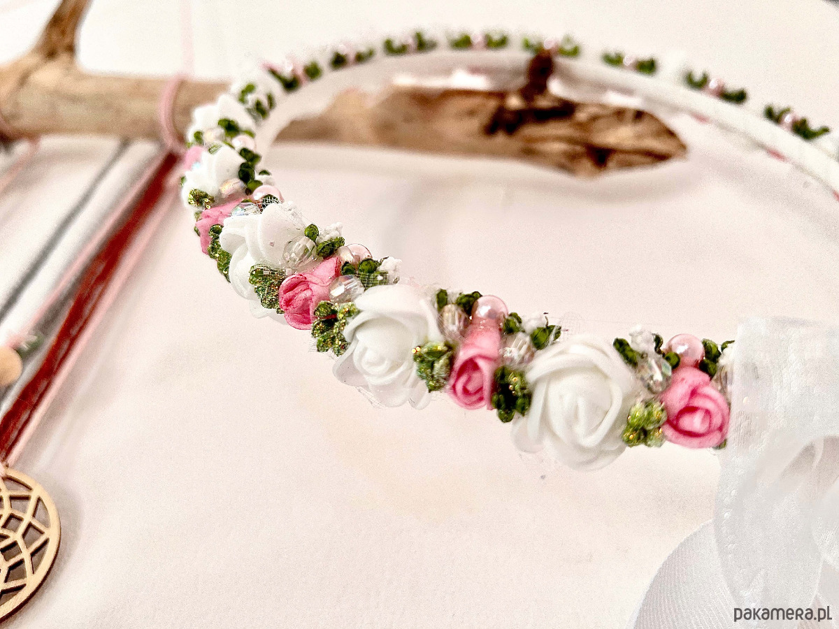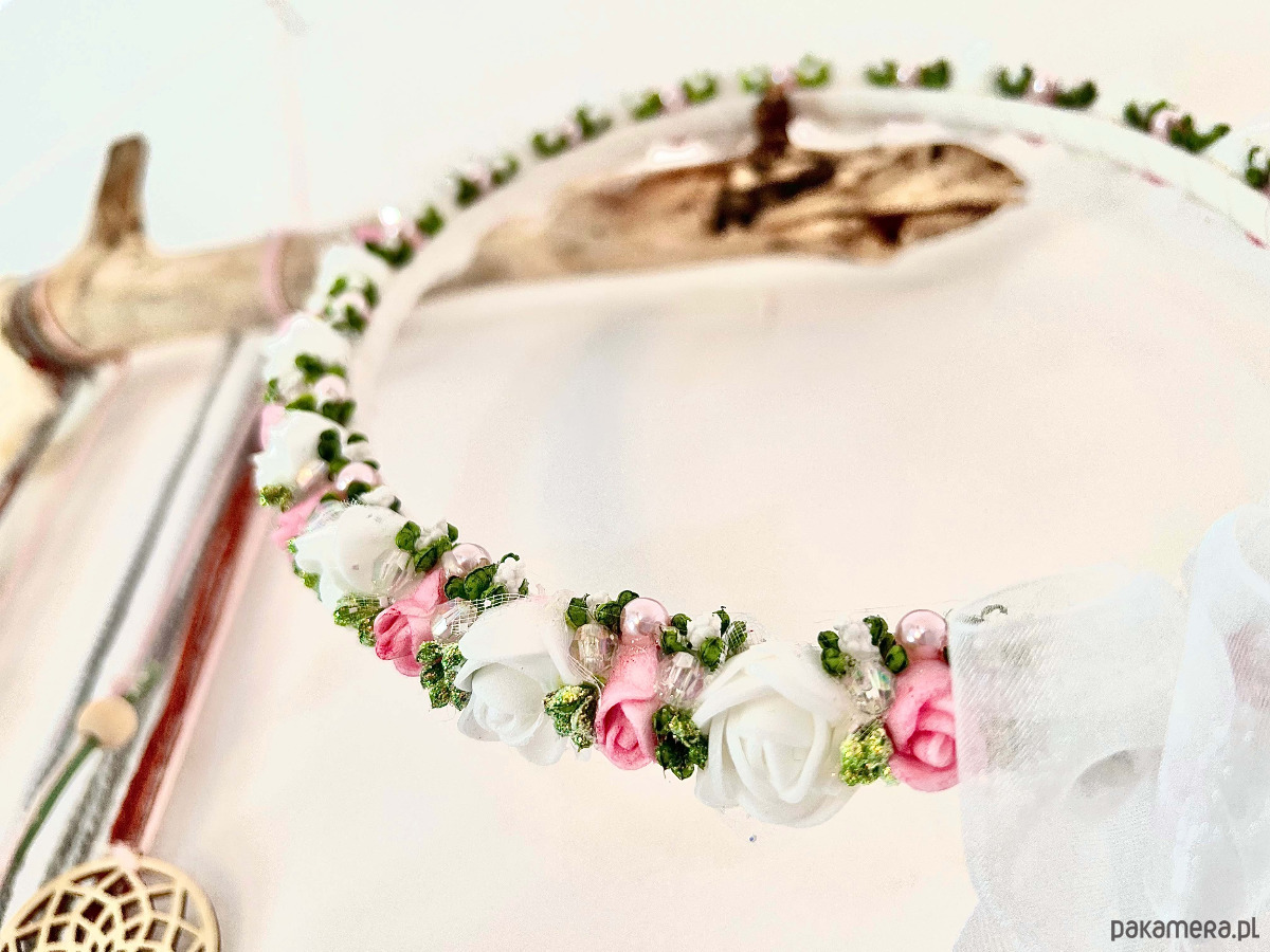 Wianek komunijny to wyjątkowy produkt, który zachwyci każdą dziewczynkę w dniu jej Pierwszej Komunii Świętej. Wianek został wykonany ręcznie z użyciem piankowych, białych i różowych różyczek, które tworzą delikatny i subtelny wzór. Różowe koraliki dodają temu wiankowi eleganckiego wykończenia, a zielone gałązki nadają mu naturalnego charakteru.