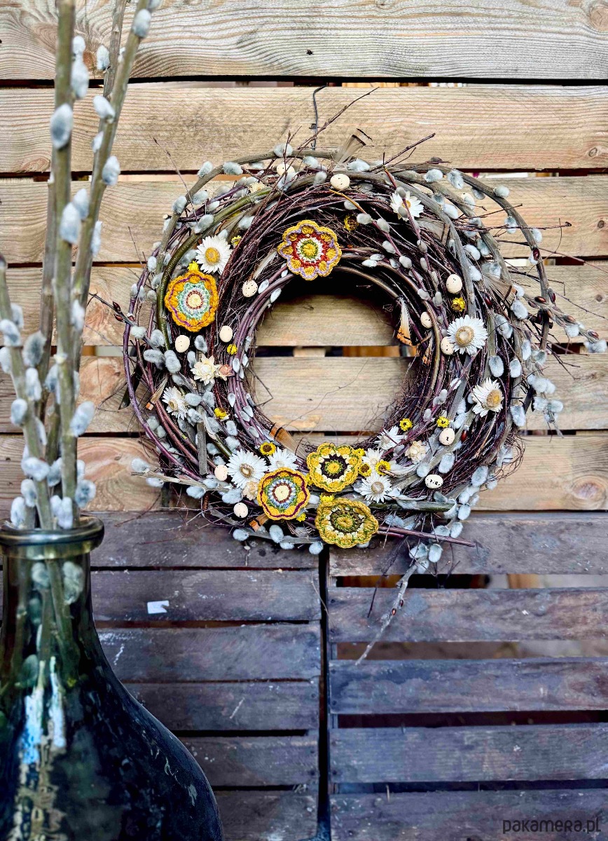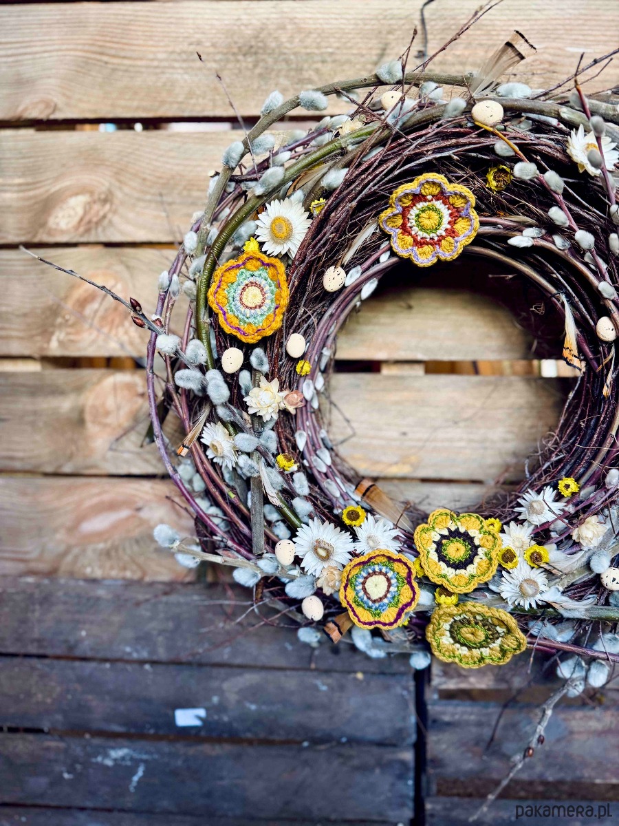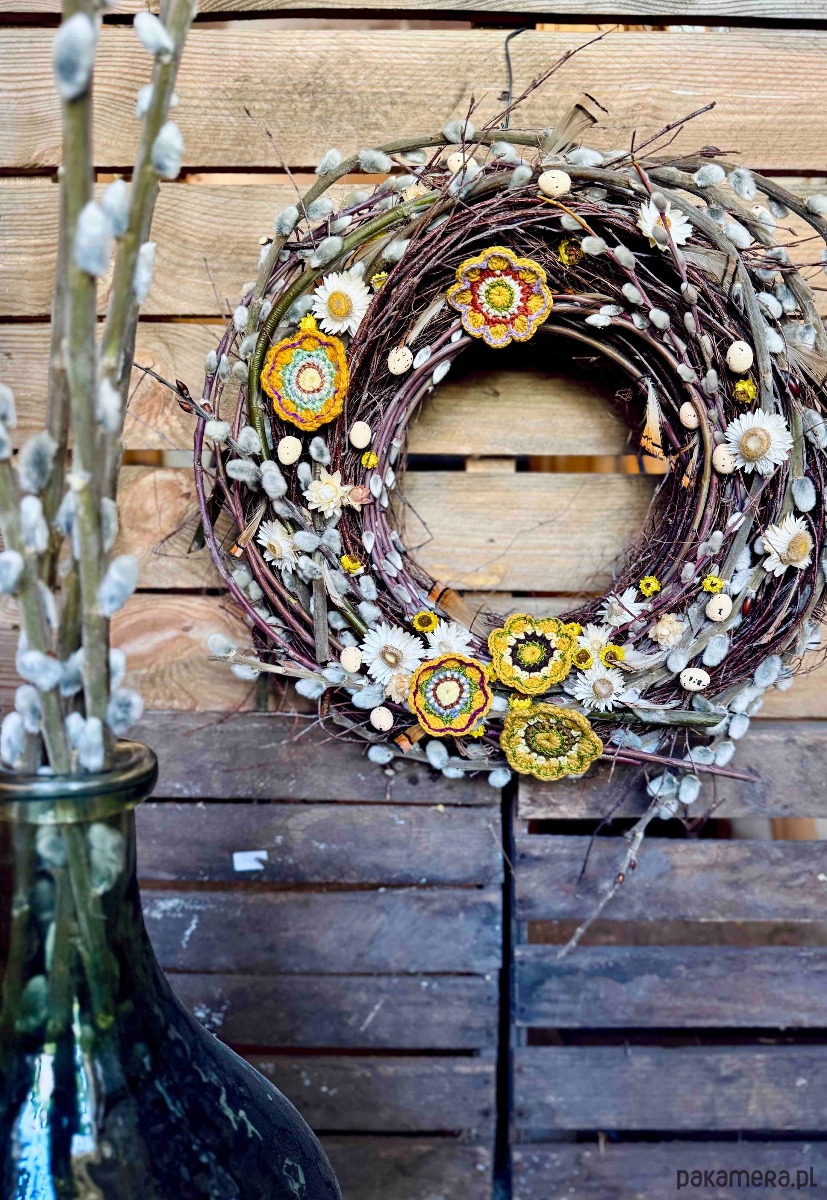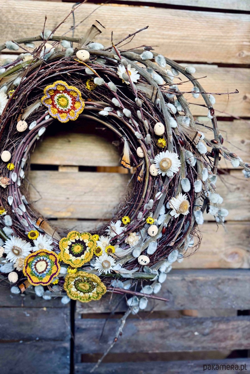 Do tego dodatki, m.in.: kwiaty robione na szydełku, Kocanki, Złociszek, styropianowe jajeczka i kolorowe pióra.