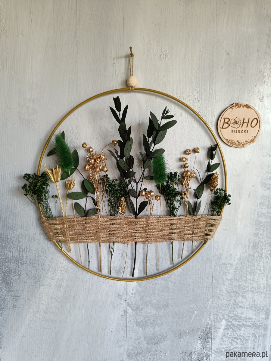Złota obręcz o średnicy 25cm z suszonymi i stabilizowanymi kwiatami w kolorach zielonym i złotym.
