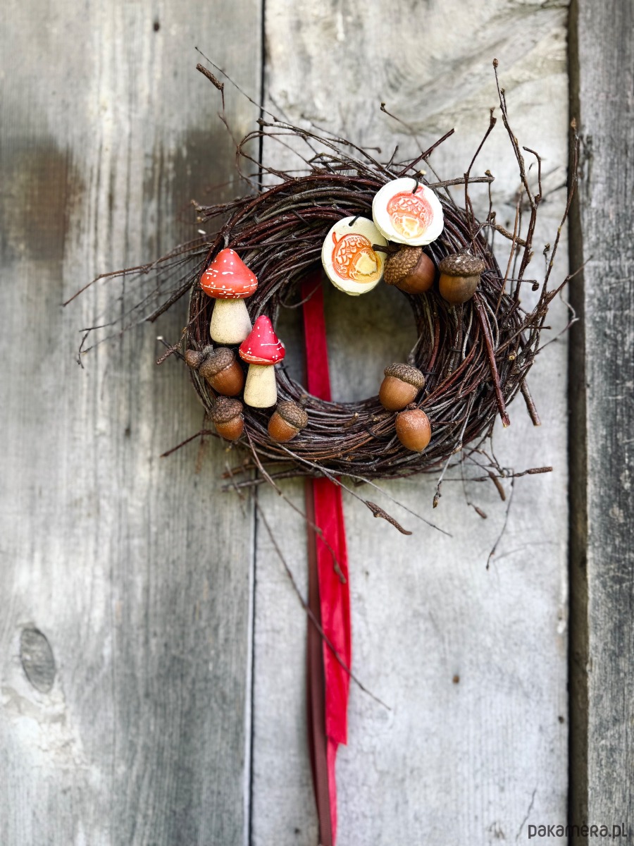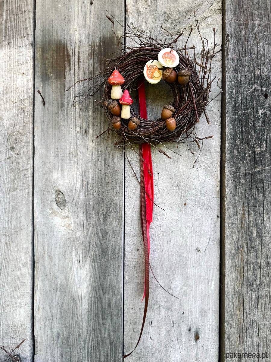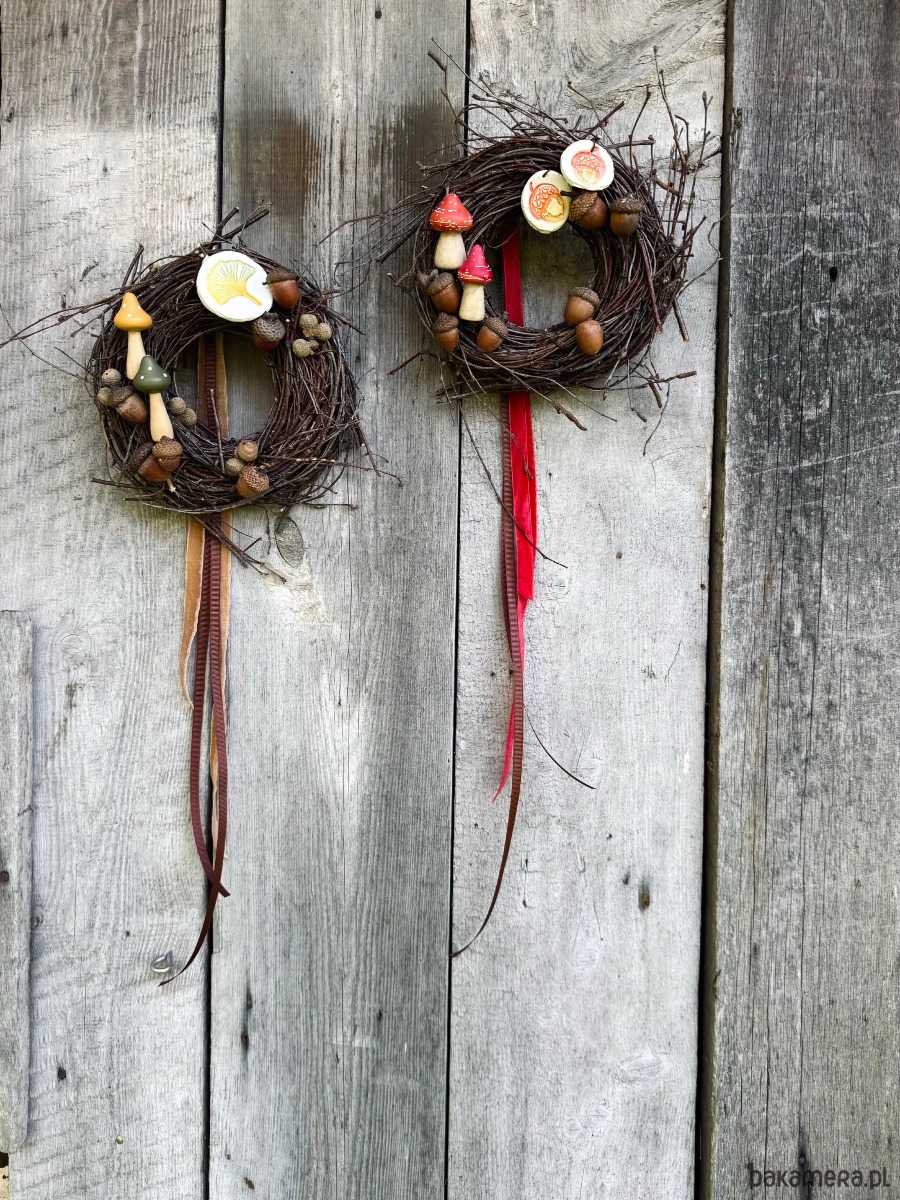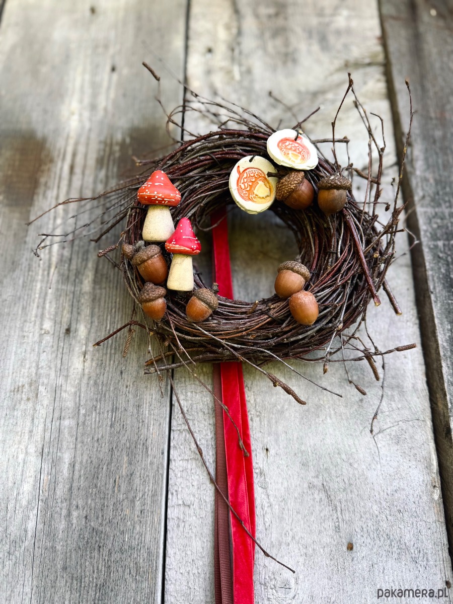 Do tego dwa drewniane grzybki, żołędzie naturalne i żołędzie z glinki.