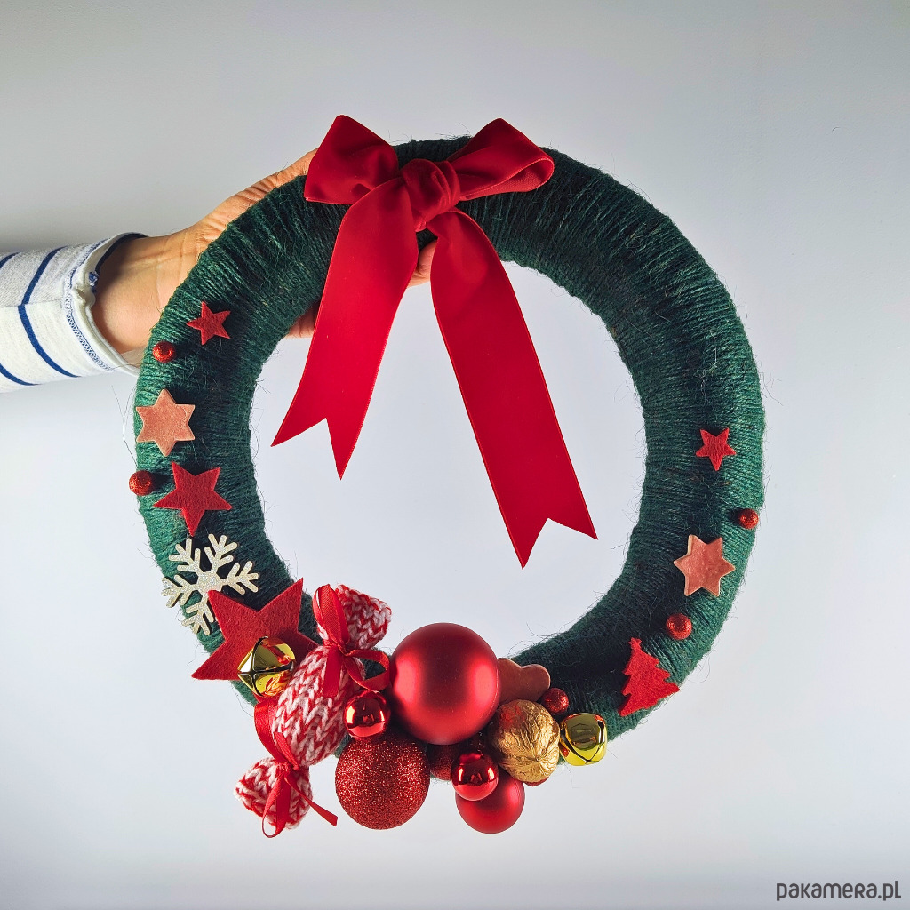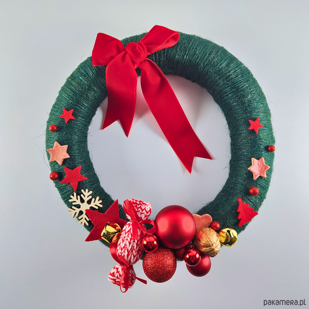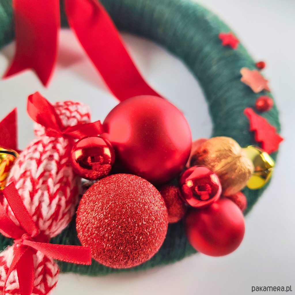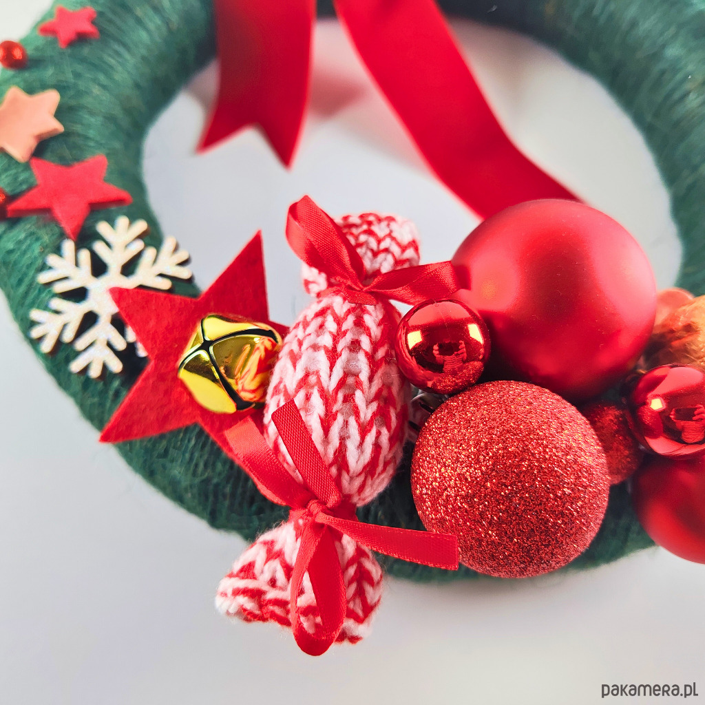 Wianek zdobią: akrylowe bombki, złote dzwonki janczary, pomalowany na złoto orzech włoski, ozdoby filcowe i brokatowe ze styropianu, ceramiczne gwiazdki, cukierek wykonany na drutach oraz czerwona aksamitka.
