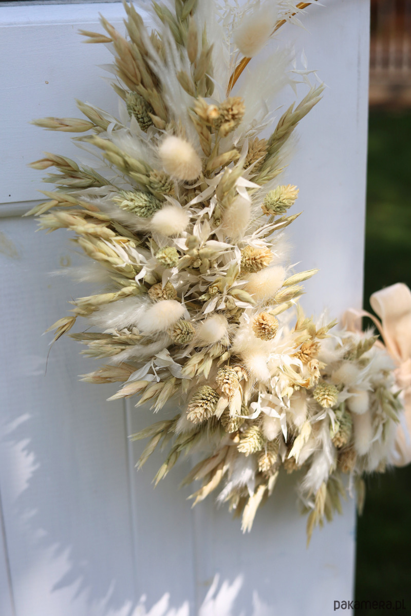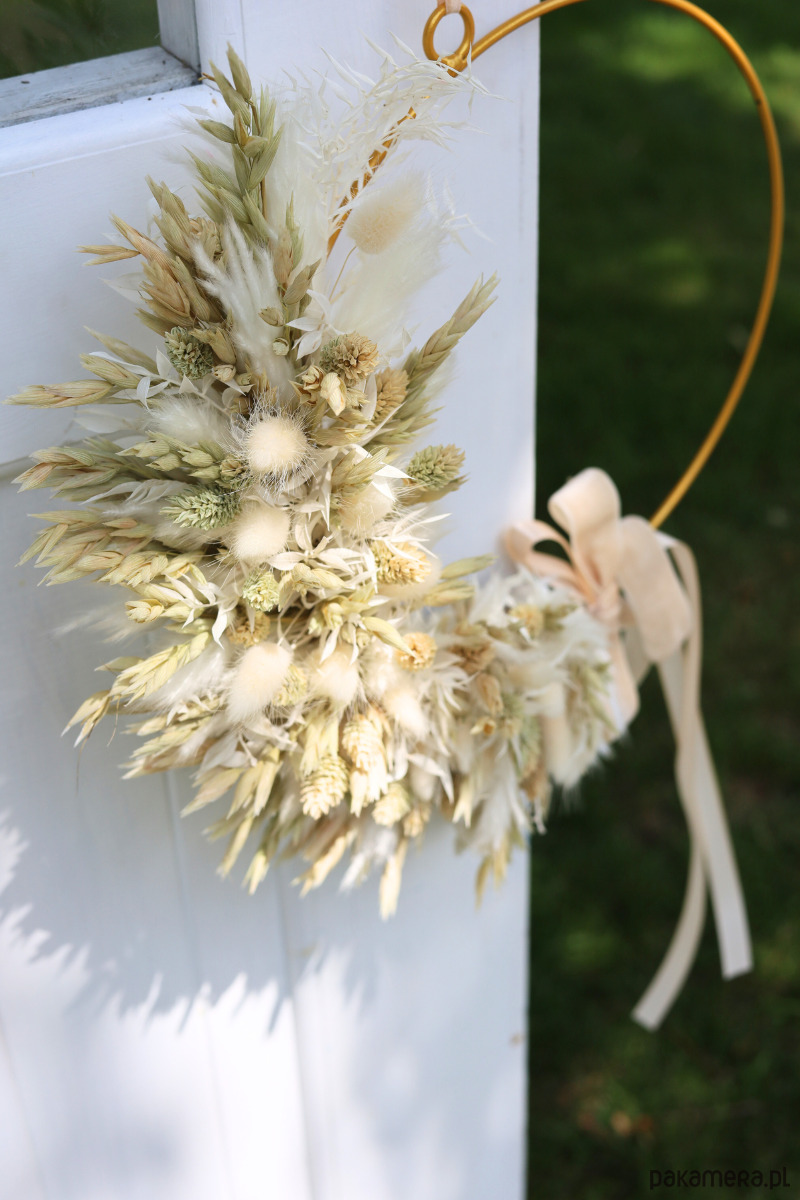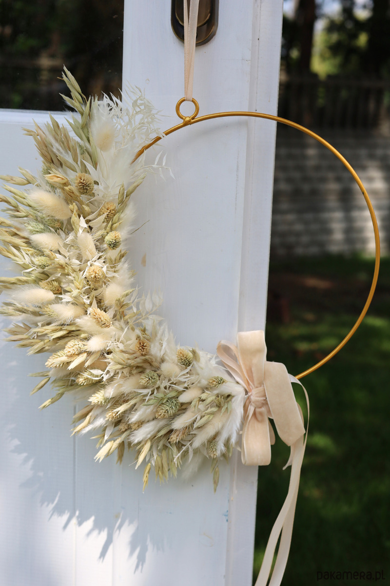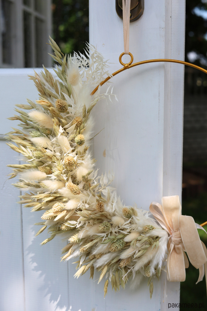 Wianek na drzwi w stylu boho, stworzony z suszonych kwiatów i traw pampasowych