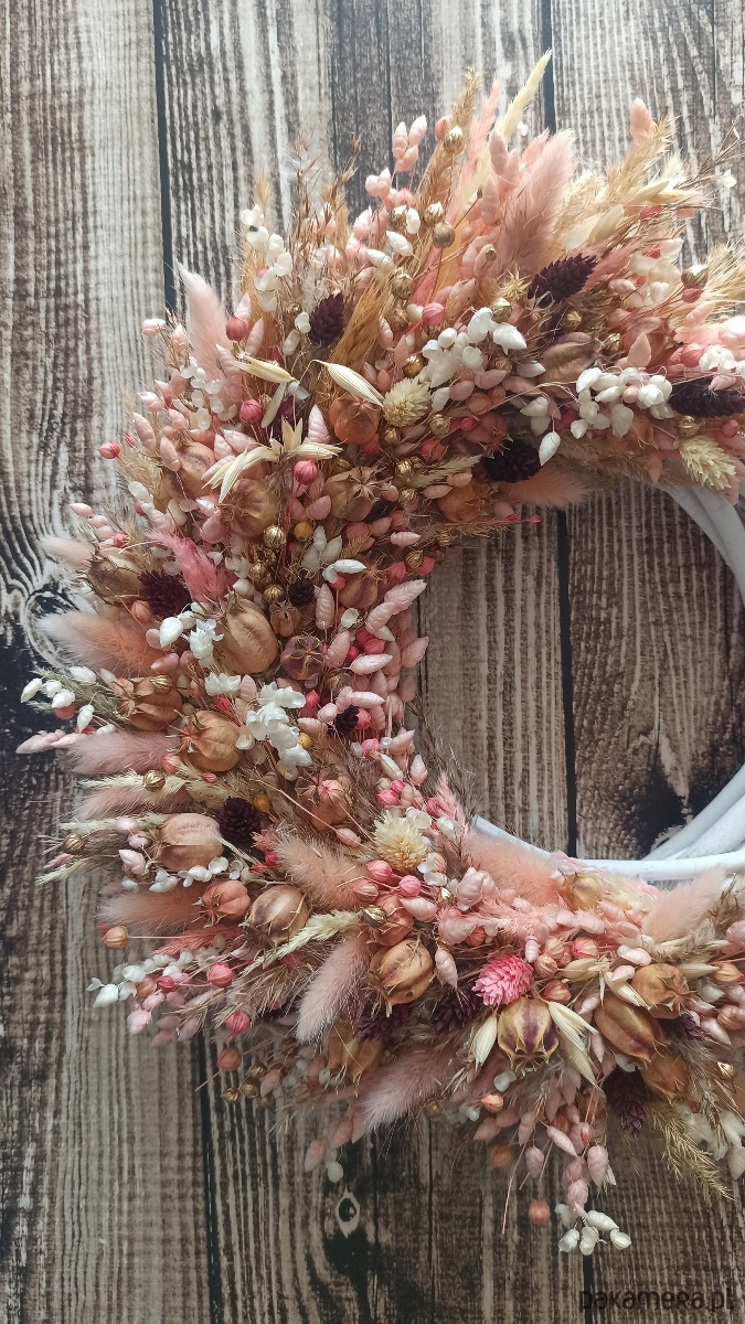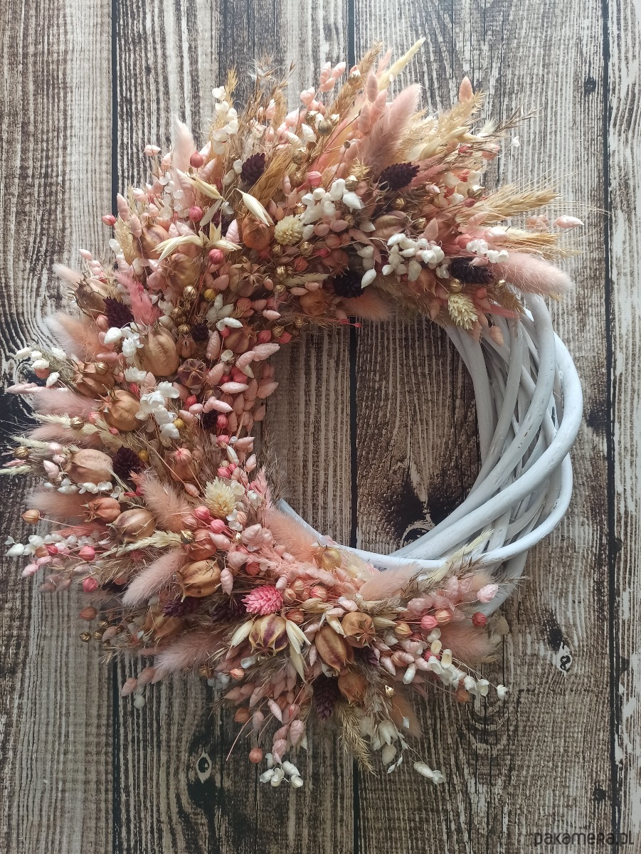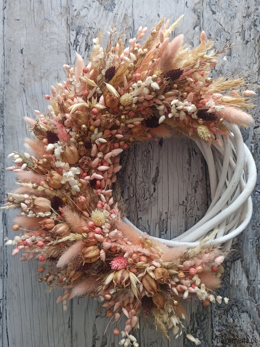 Wianki dekoracyjne to wyjątkowa ozdoba drzwi wejściowych, symbol powitania gości oraz zapowiedź, że w domu panuje radosna, uroczysta lub świąteczna atmosfera. Bukiety długowieczne w towarzystwie zaplatanego suszu są idealnym dopełnieniem jako komplet dekoracji.