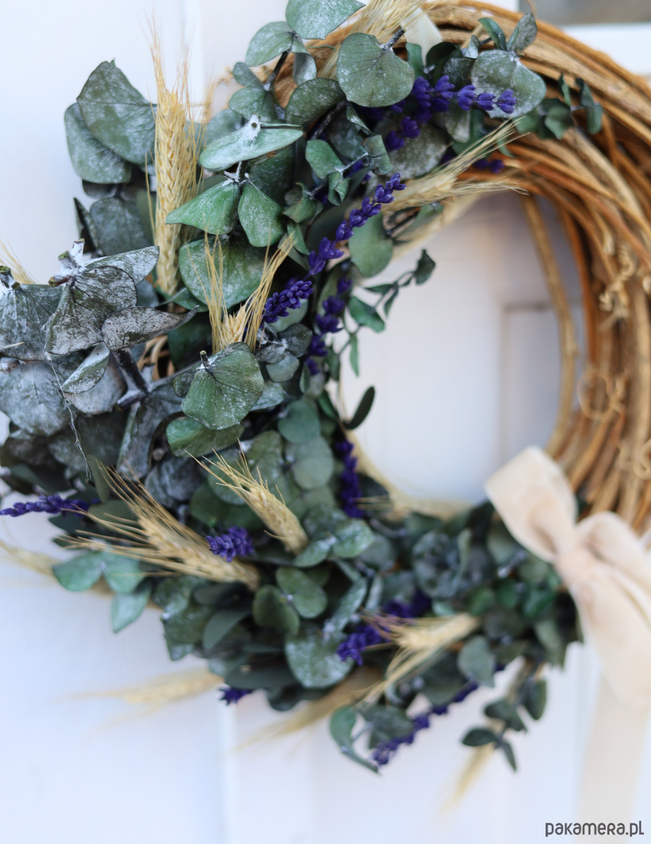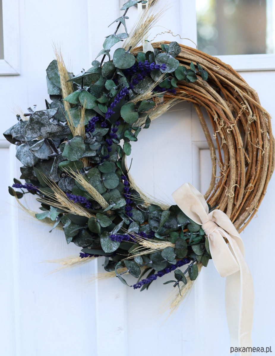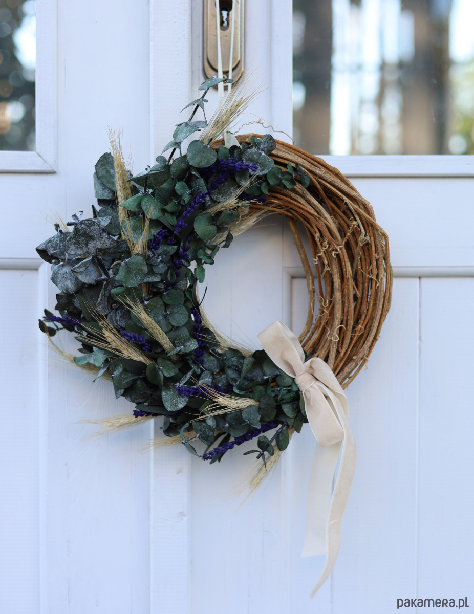 Naturalny Wianek na drzwi na bazie z winorośli to wyjątkowa ozdoba, która wprowadzi naturalne piękno i elegancję do Twojego domu. Wianek został starannie wykonany z zielonego stabilizowanego eukaliptusa oraz aromatycznej lawendy, a także delikatnego suszonego zboża. Całość wieńczy kokarda z welurowej śmietankowej wstążki, dodając całości subtelnego uroku.