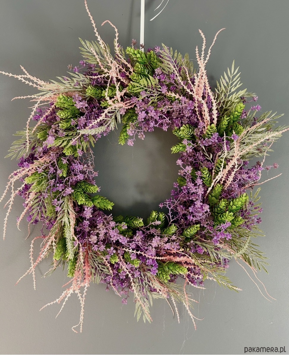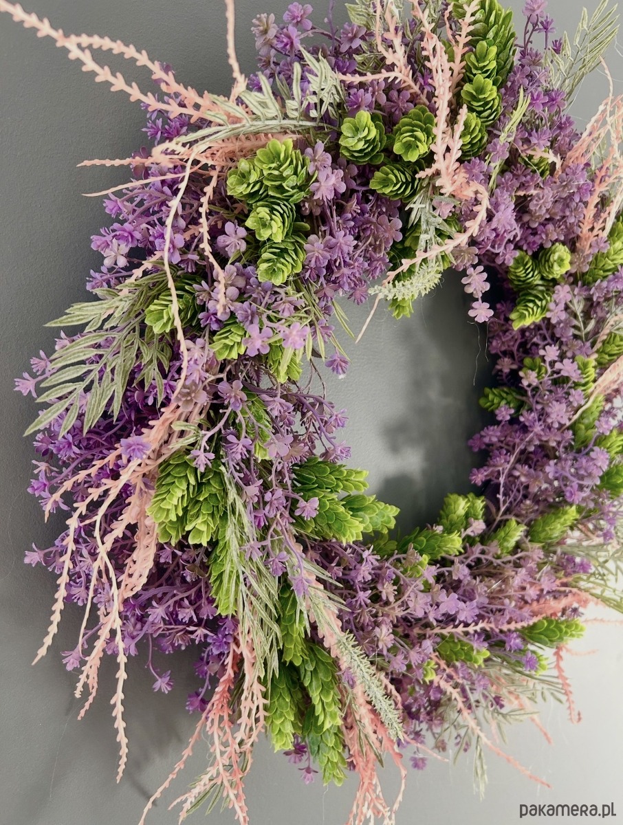 Prawdziwa eksplozja barw! Soczysta zieleń, głęboki fiolet i różowe akcenty. To wianek, który krzyczy „dzień dobry!” i dodaje energii każdemu, kto przekroczy Twój próg.