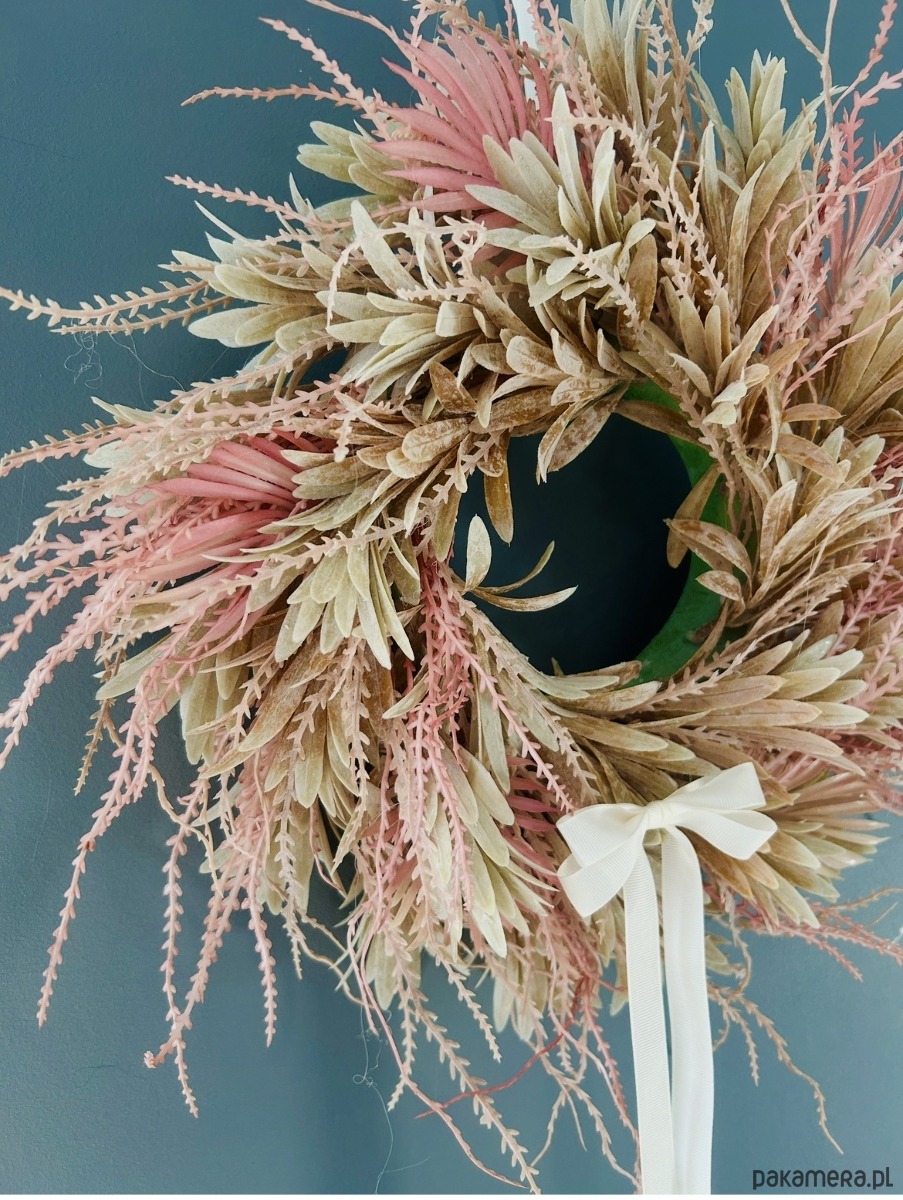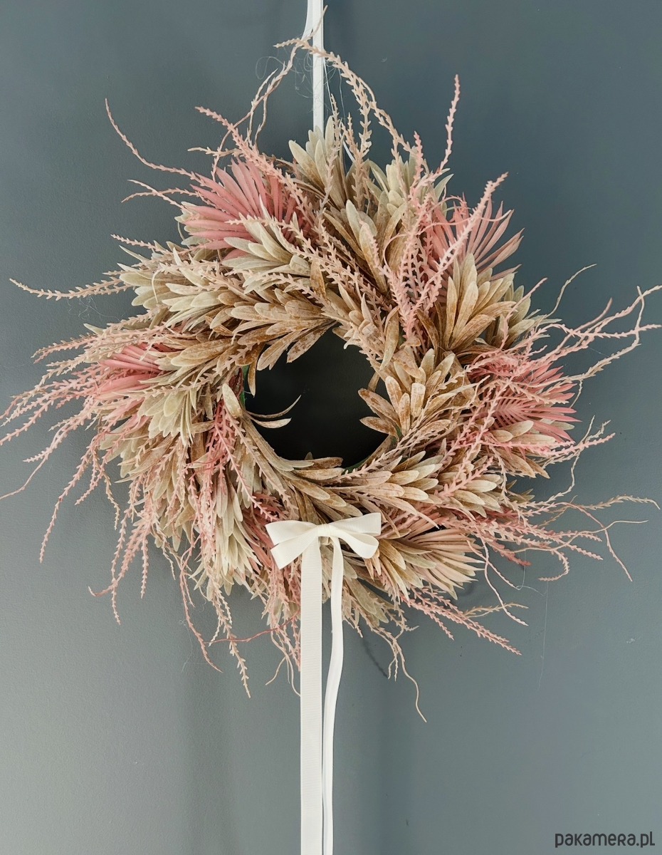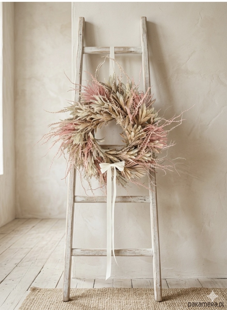 Spokój, harmonia i elegancja. Stonowane beże, przybrudzony róż i ta długa, zwiewna wstążka... Idealny dla miłośników stylu skandynawskiego i romantycznych detali.