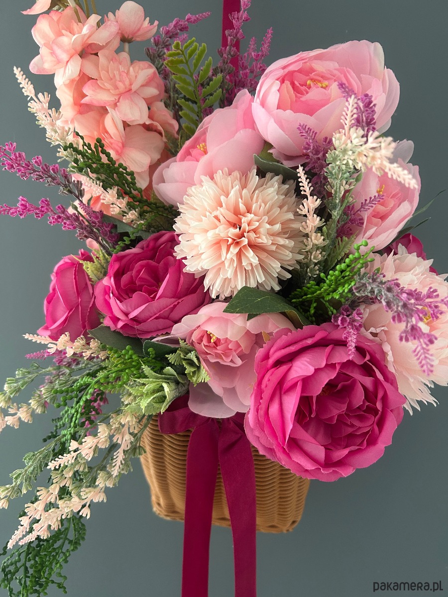 🌷🌷🌷Kompozycja utrzymana jest w harmonijnych, odcieniach różu, delikatnej fuksji oraz świeżej zieleni. Bogactwo kwiatów – od pełnych, romantycznych róż po lekkie, drobne dodatki – tworzy efekt lekkości i elegancji, a jednocześnie sprawia, że dekoracja wygląda bardzo naturalnie i stylowo. Całość dopełnia ozdobna wstążka, która dodaje uroku i podkreśla pionową formę kompozycji.