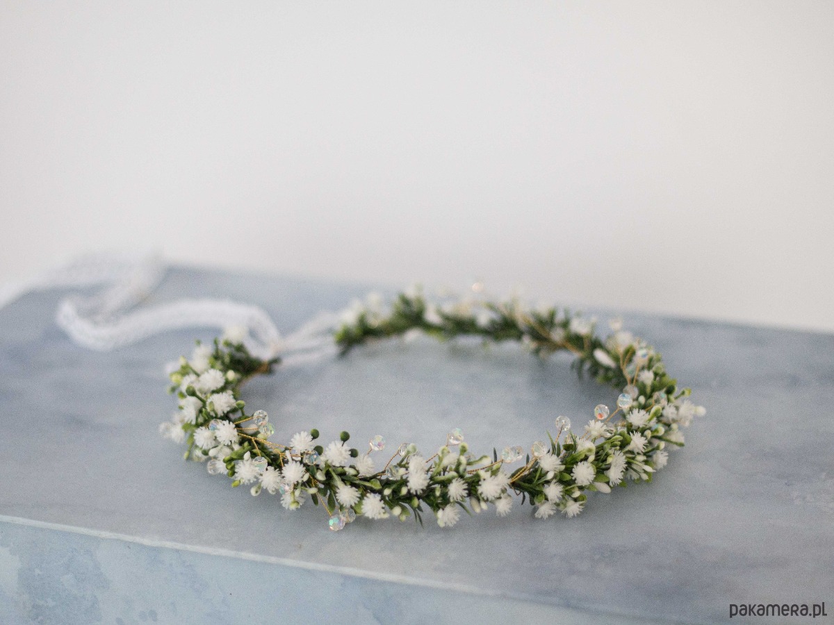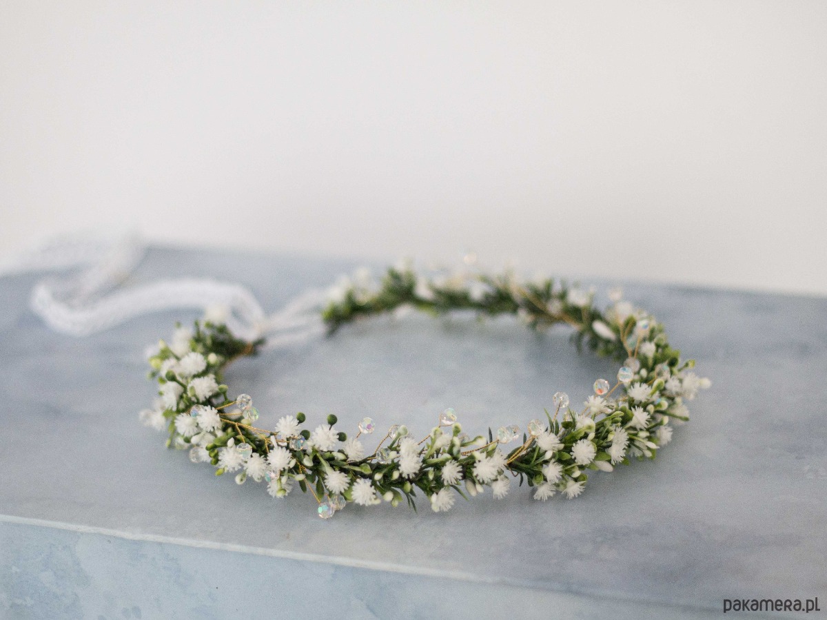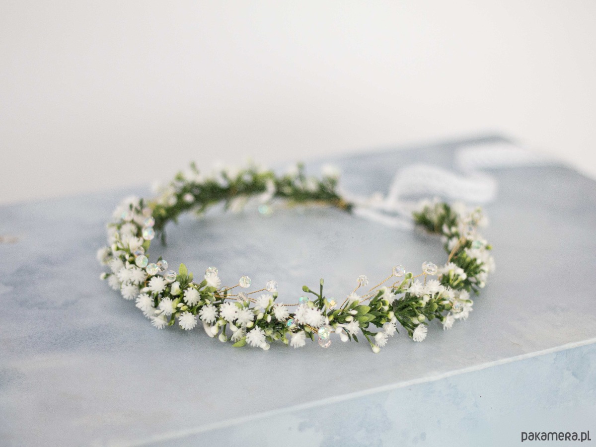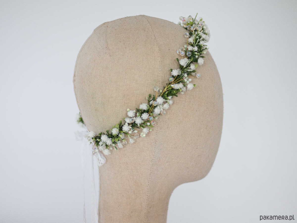 Romantyczny wianek na głowę, zdobiony syntetycznymi, śnieżnobiałymi kwiatami gipsówki i zielonymi listkami. Małe, transparentne koraliki dodają kompozycji blasku. Możliwość regulacji wielkości obwodu, dzięki koronkowej tasiemce z tyłu. Będzie pasował zarówno na głowę dziecka, jak i osoby dorosłej. Ozdoba będzie idealna na Pierwszą Komunię Świętą. Wianek wykonany ręcznie, z najwyższą starannością, w pracowni "Lola White" w Polsce.