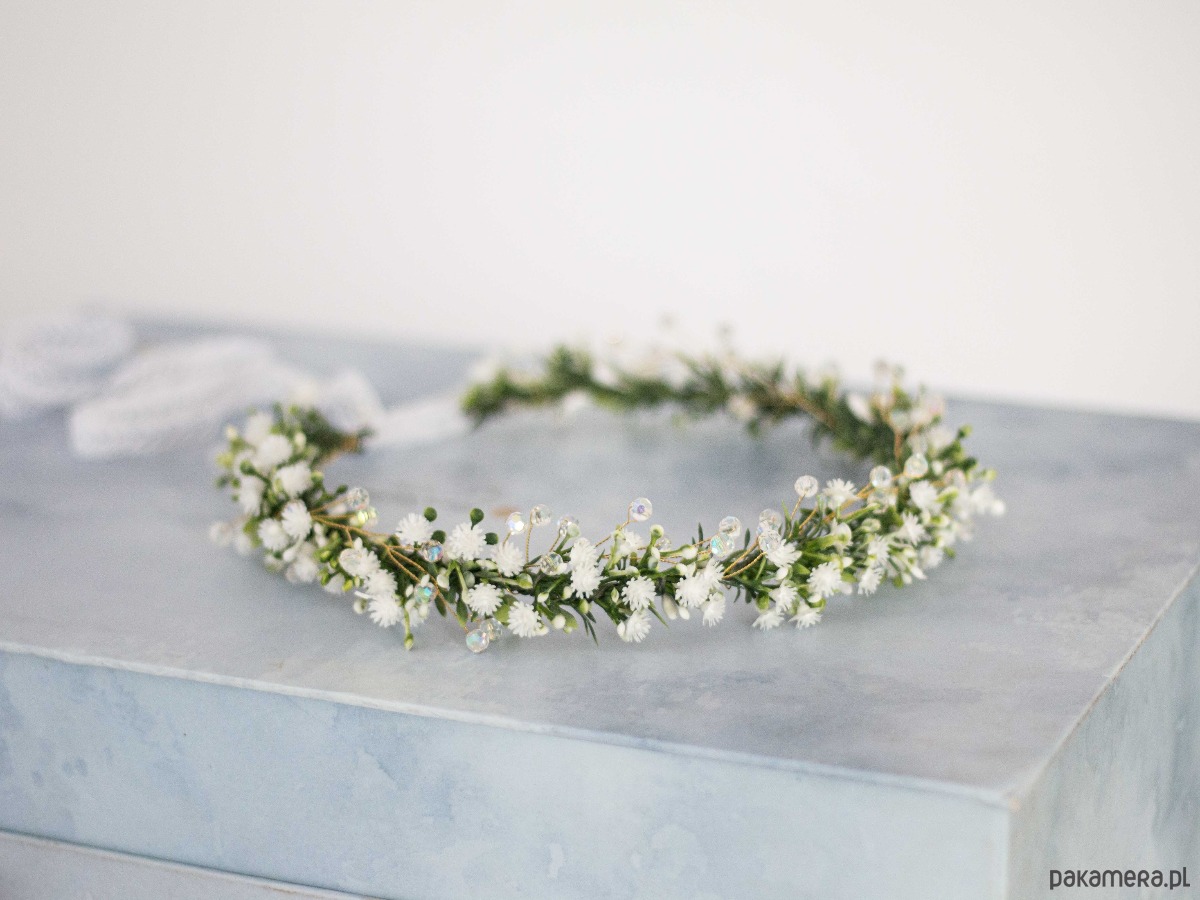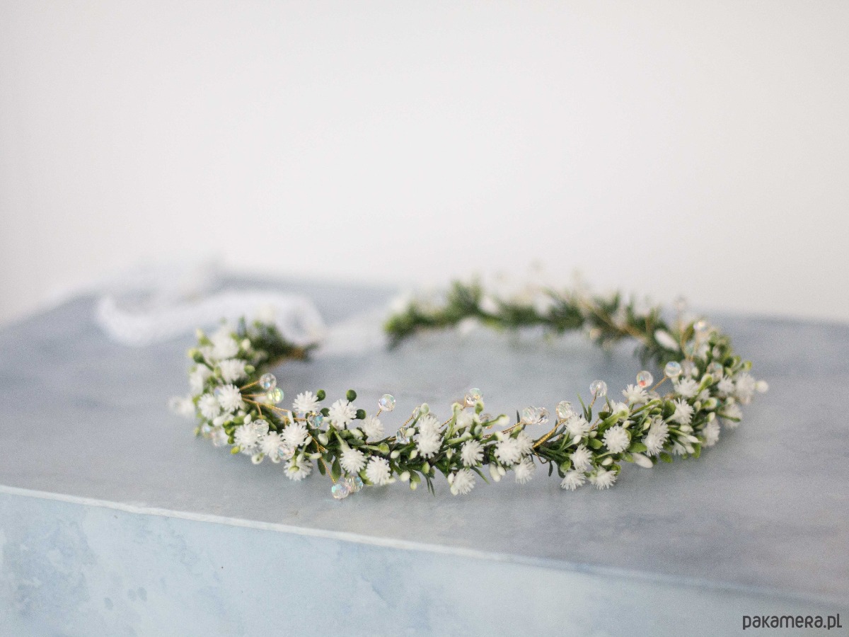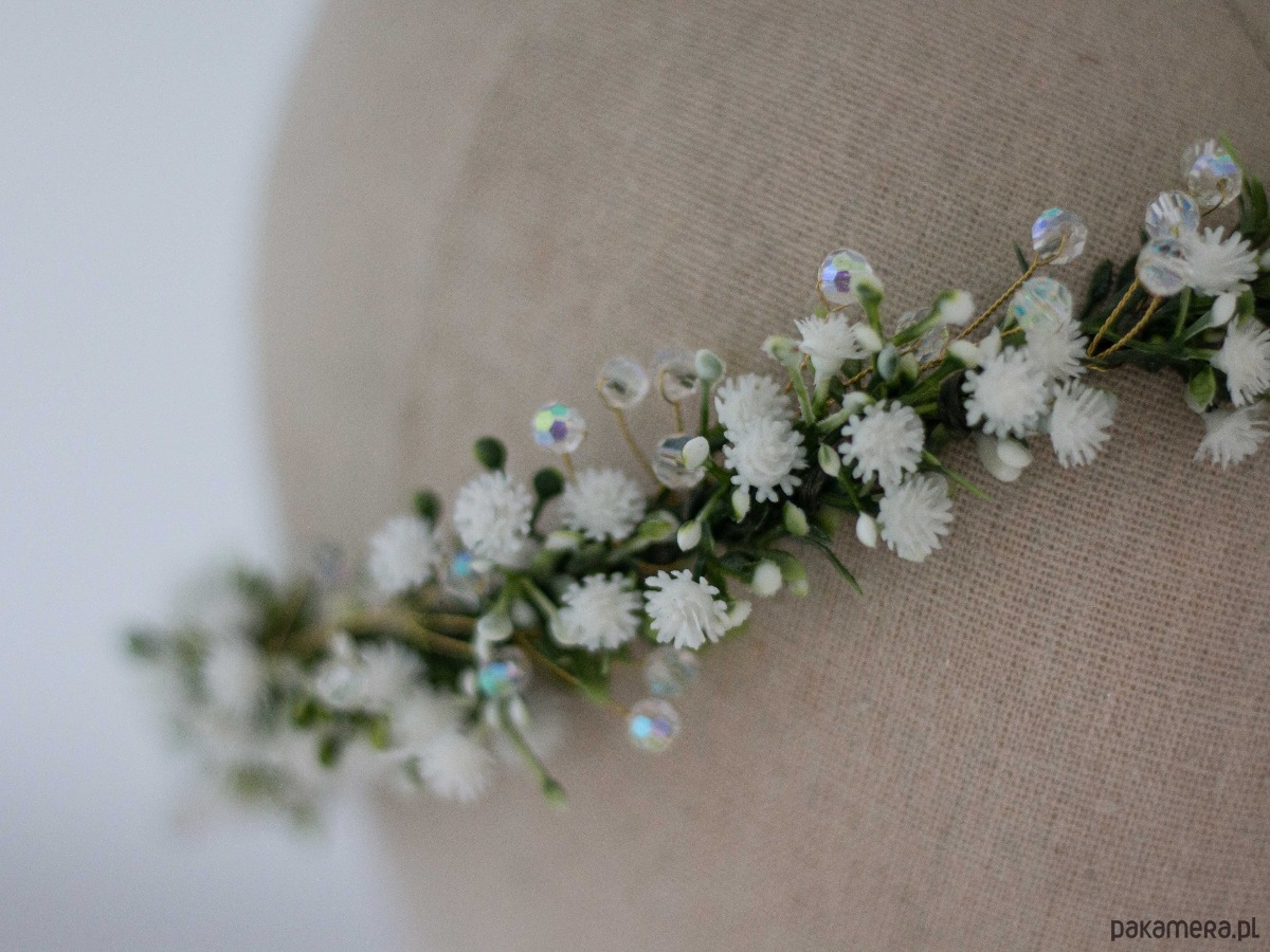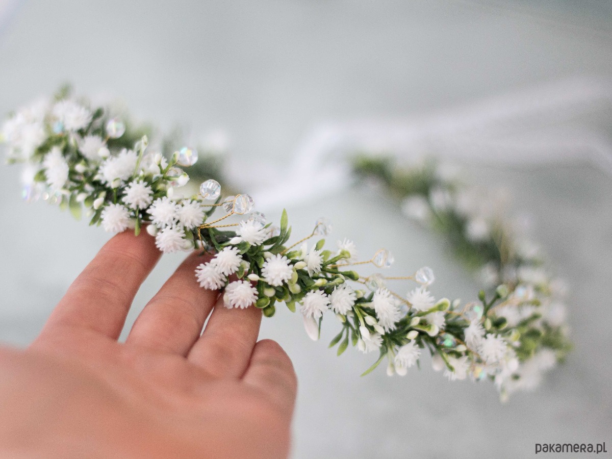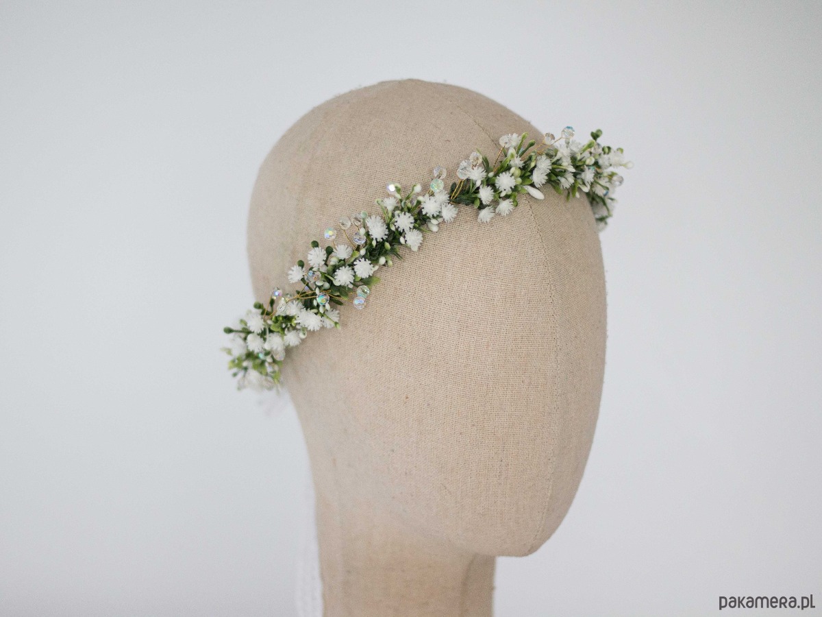 Romantyczny wianek na głowę, zdobiony syntetycznymi, śnieżnobiałymi kwiatami gipsówki i zielonymi listkami. Małe, transparentne koraliki dodają kompozycji blasku. Możliwość regulacji wielkości obwodu, dzięki koronkowej tasiemce z tyłu. Będzie pasował zarówno na głowę dziecka, jak i osoby dorosłej. Ozdoba będzie idealna na Pierwszą Komunię Świętą. Wianek wykonany ręcznie, z najwyższą starannością, w pracowni "Lola White" w Polsce.
