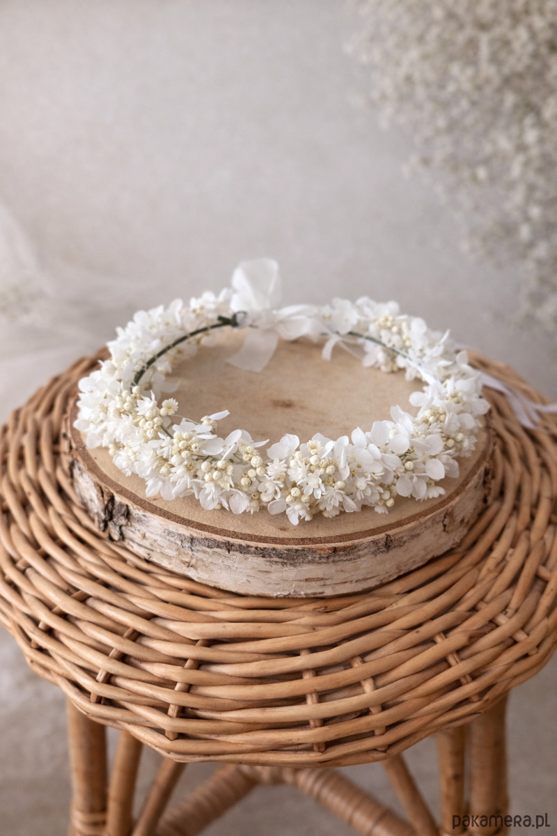 Wianek na głowę z roślinności naturalnej i trwałej: stabilizowanej hortensji i oztohampus.