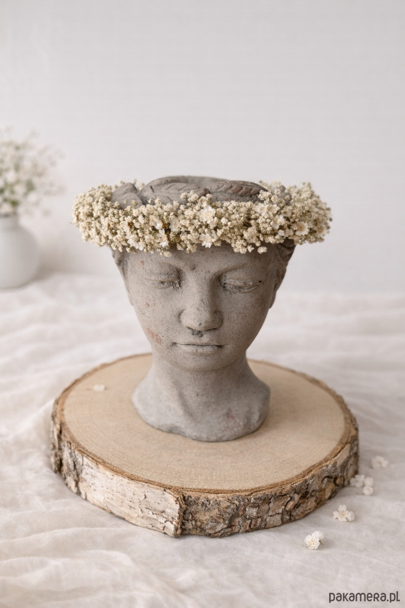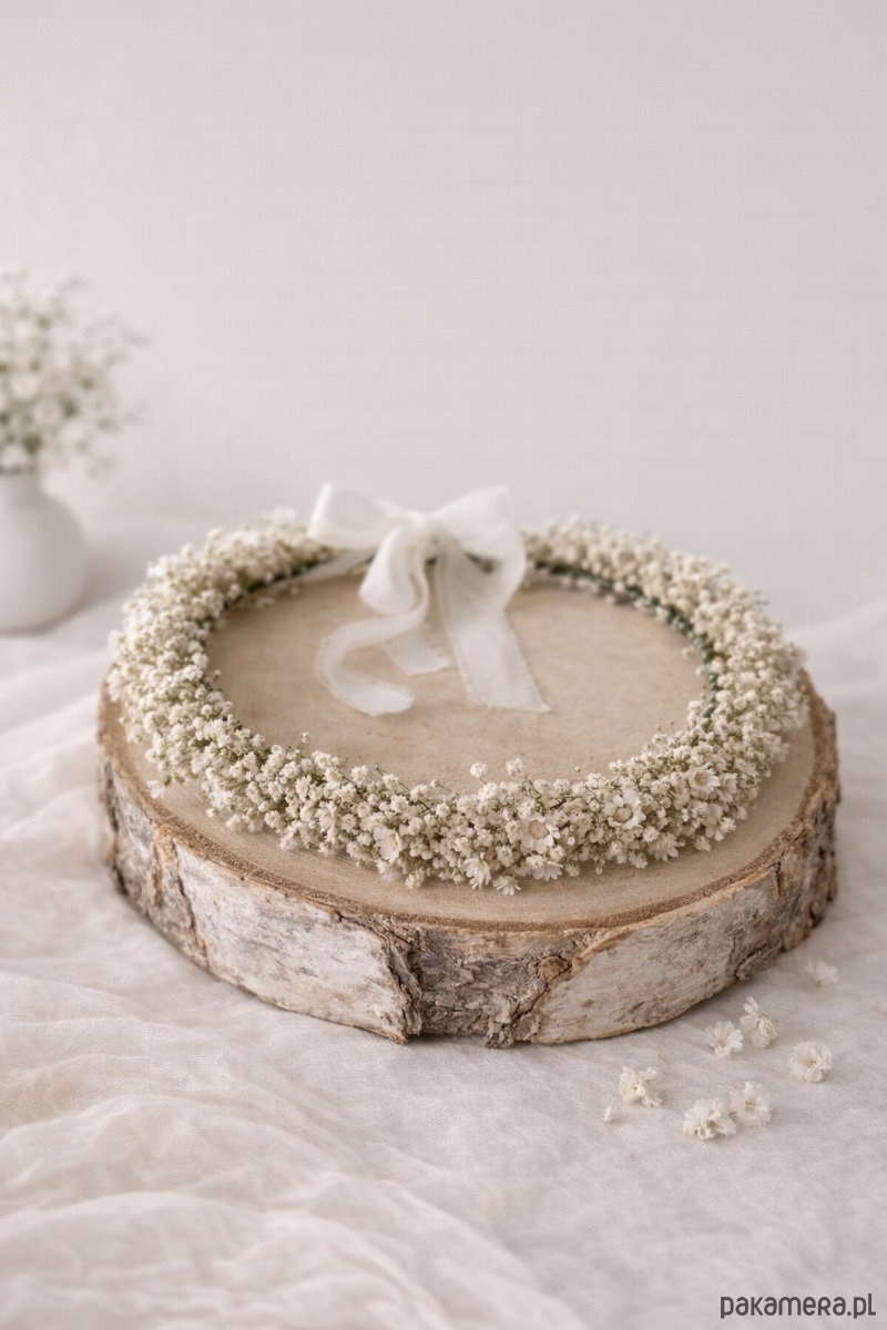 Wianek na głowę z roślinności naturalnej i trwałej: suszonej glixii i stabilizowanej gipsówki.